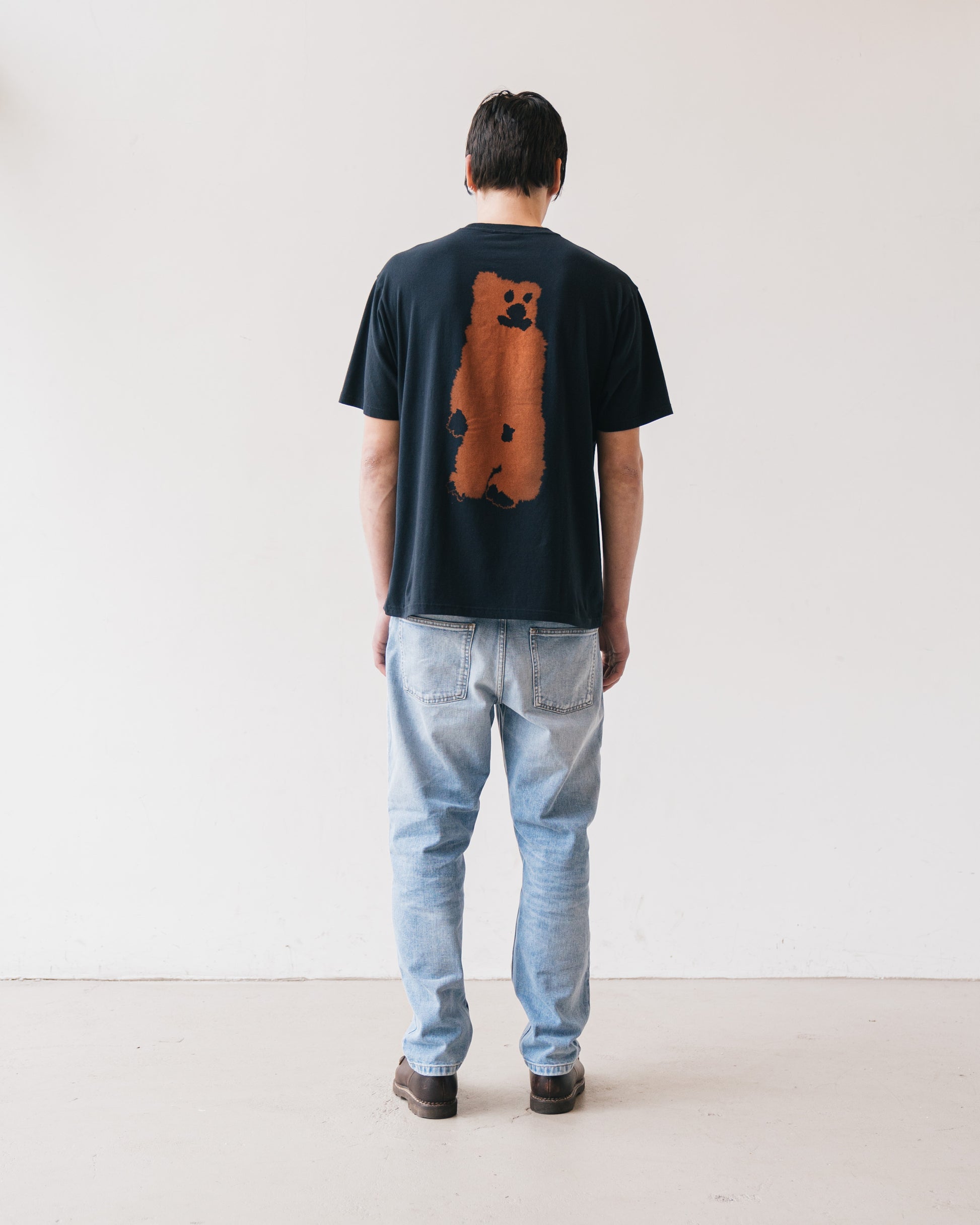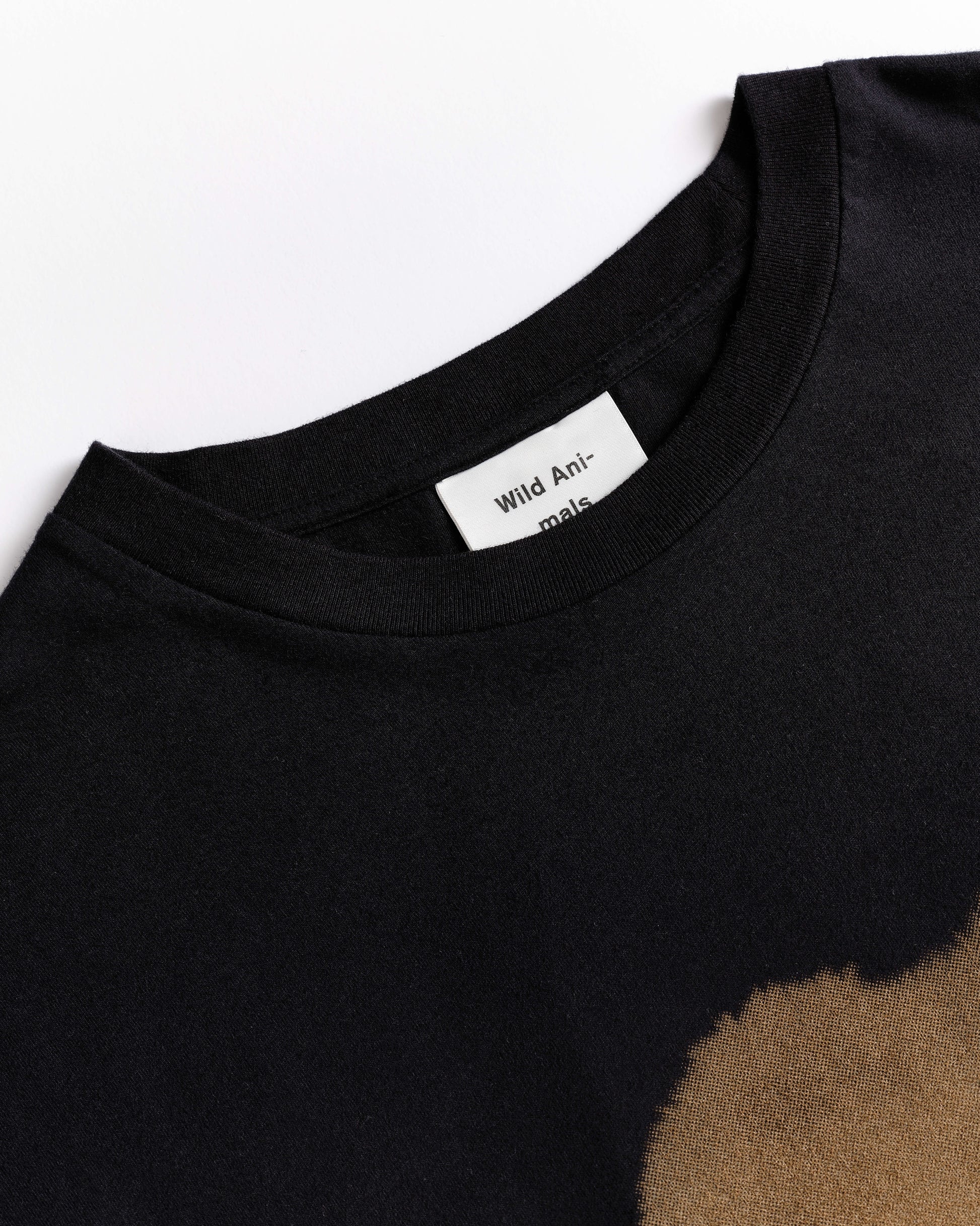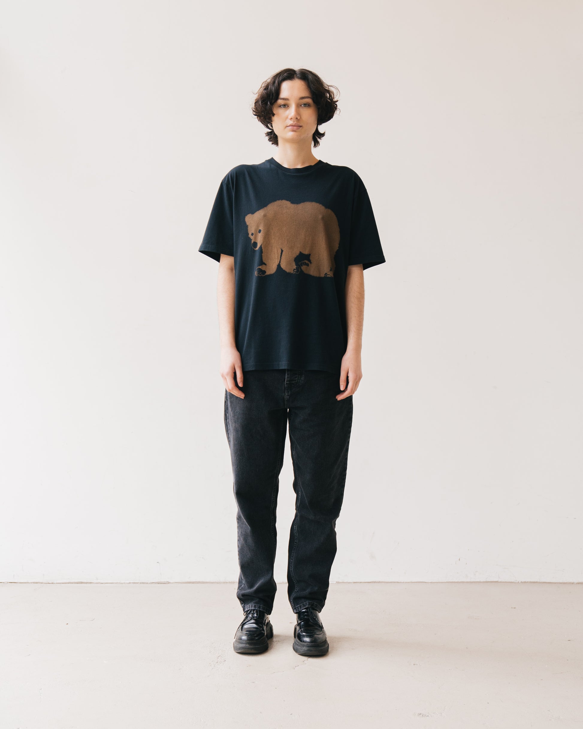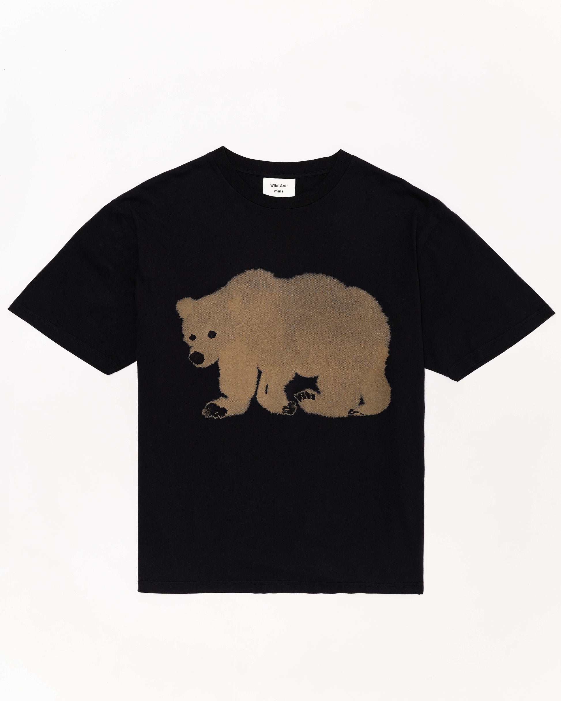 An black unisex t-shirt featuring a silkscreen print of an Bear on the front and back. The fabric used to make this t-shirt is certified by GOTS.