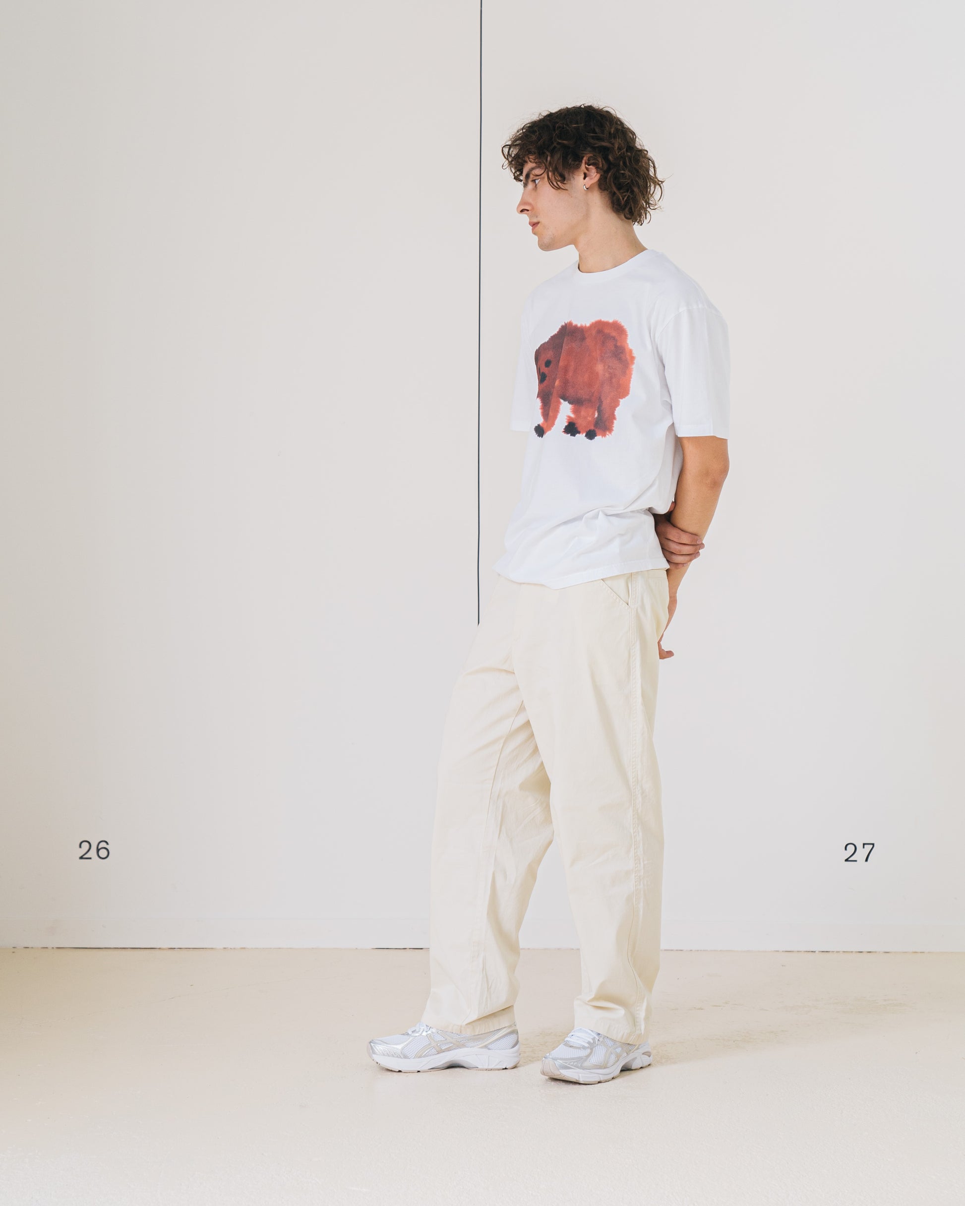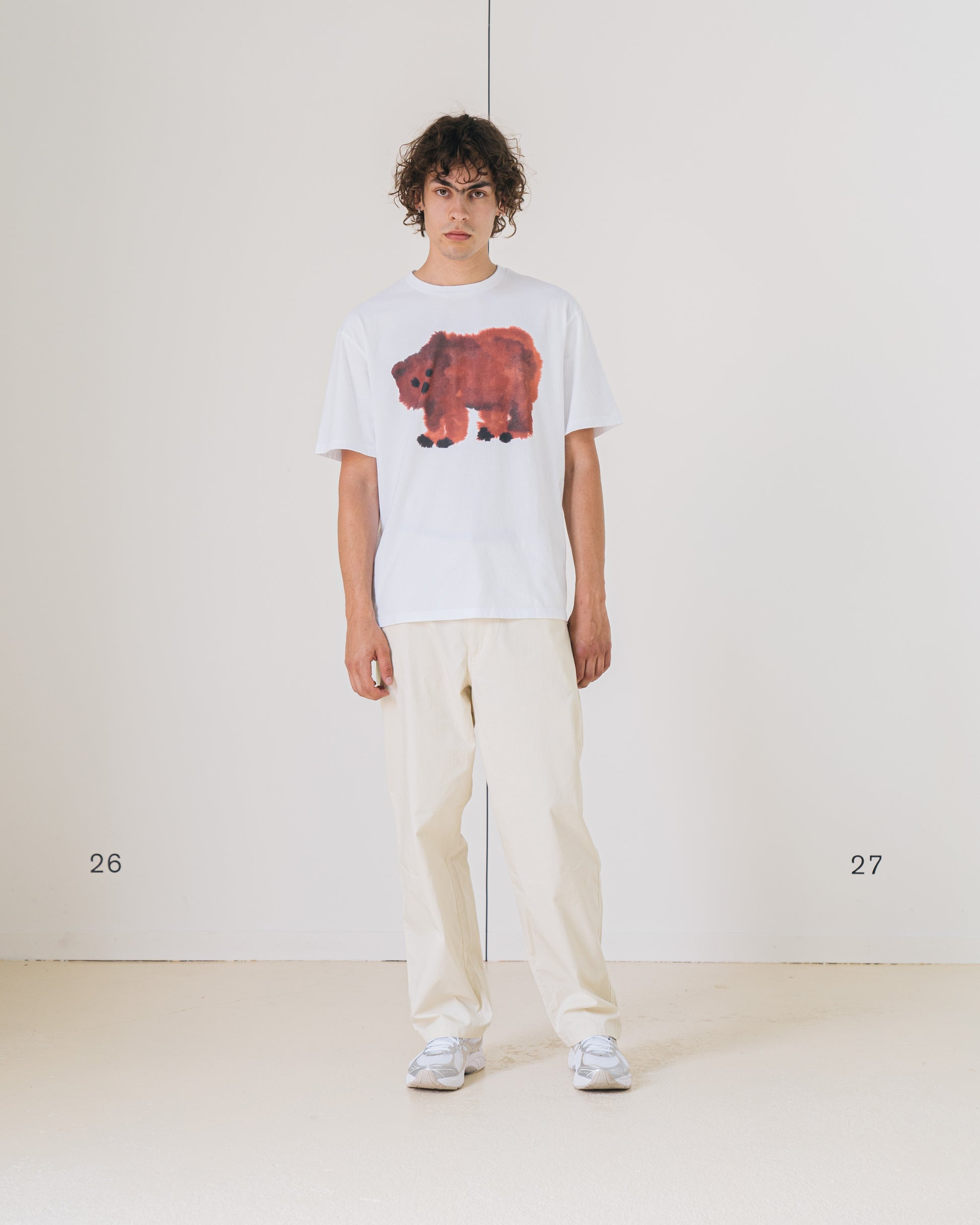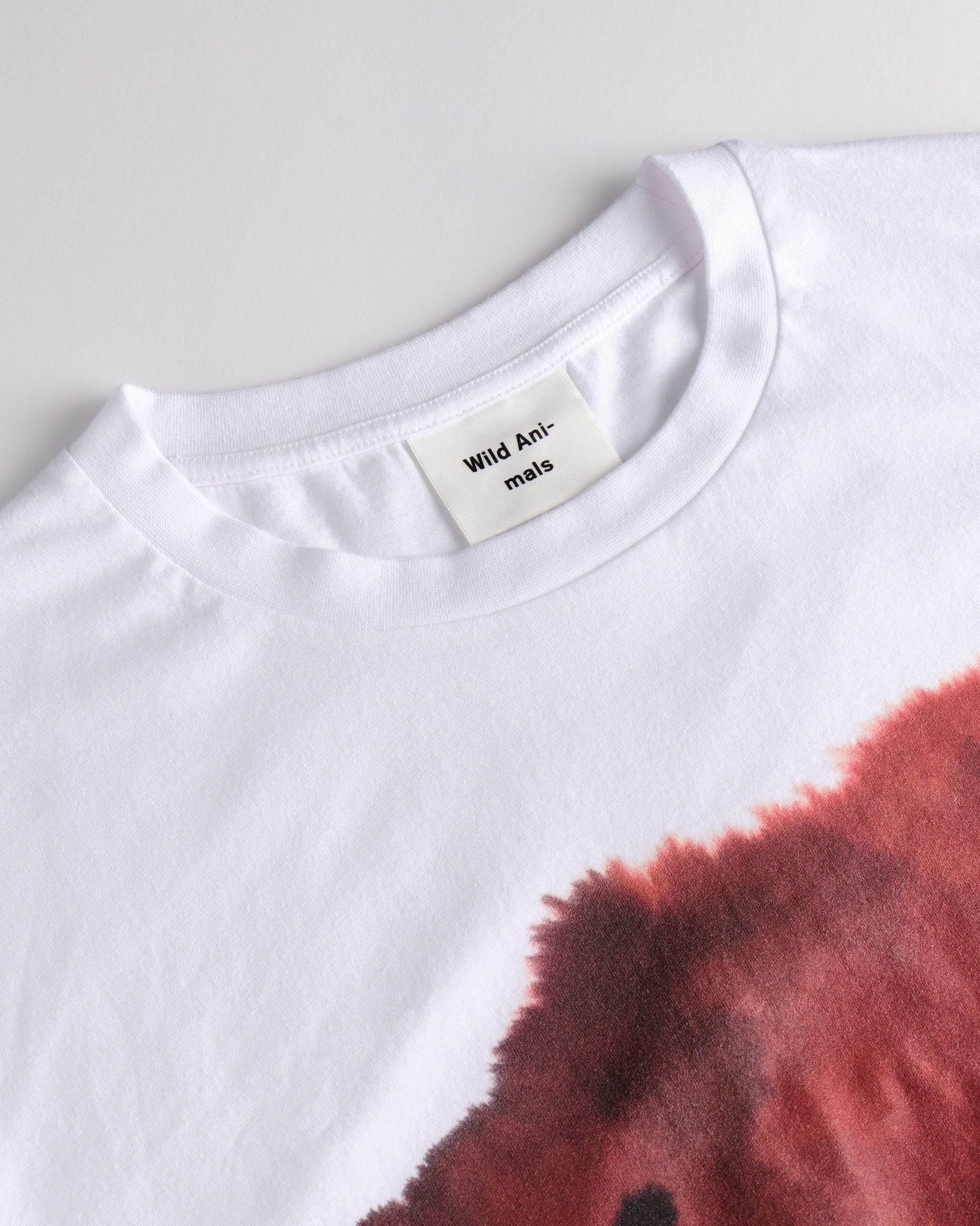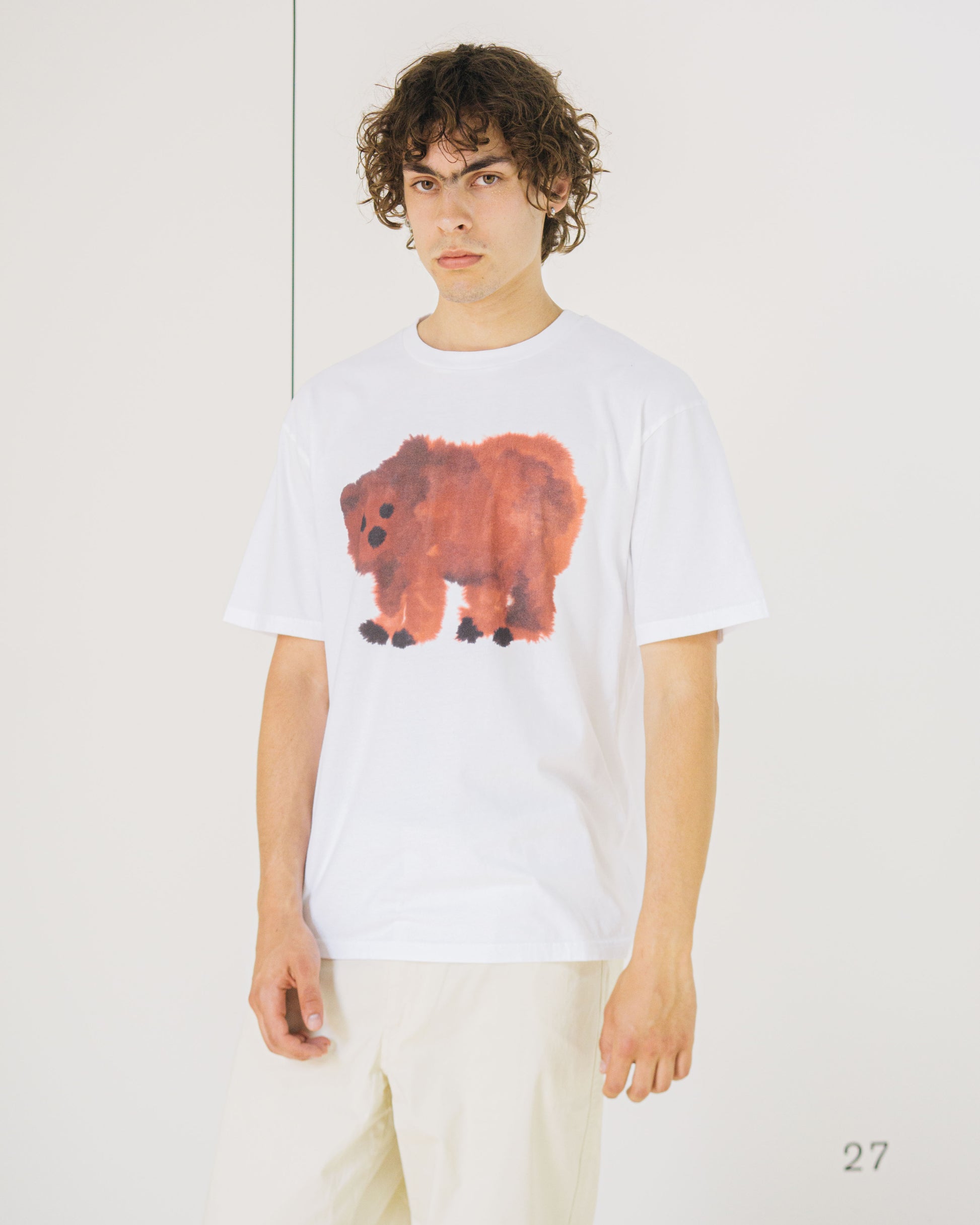 A white unisex t-shirt featuring a print of a Bear on the front. The fabric used to make this t-shirt is certified by GOTS. Tome is 1.89 cm and wears a size medium. Joy is 1.76 cm and wears a size medium.