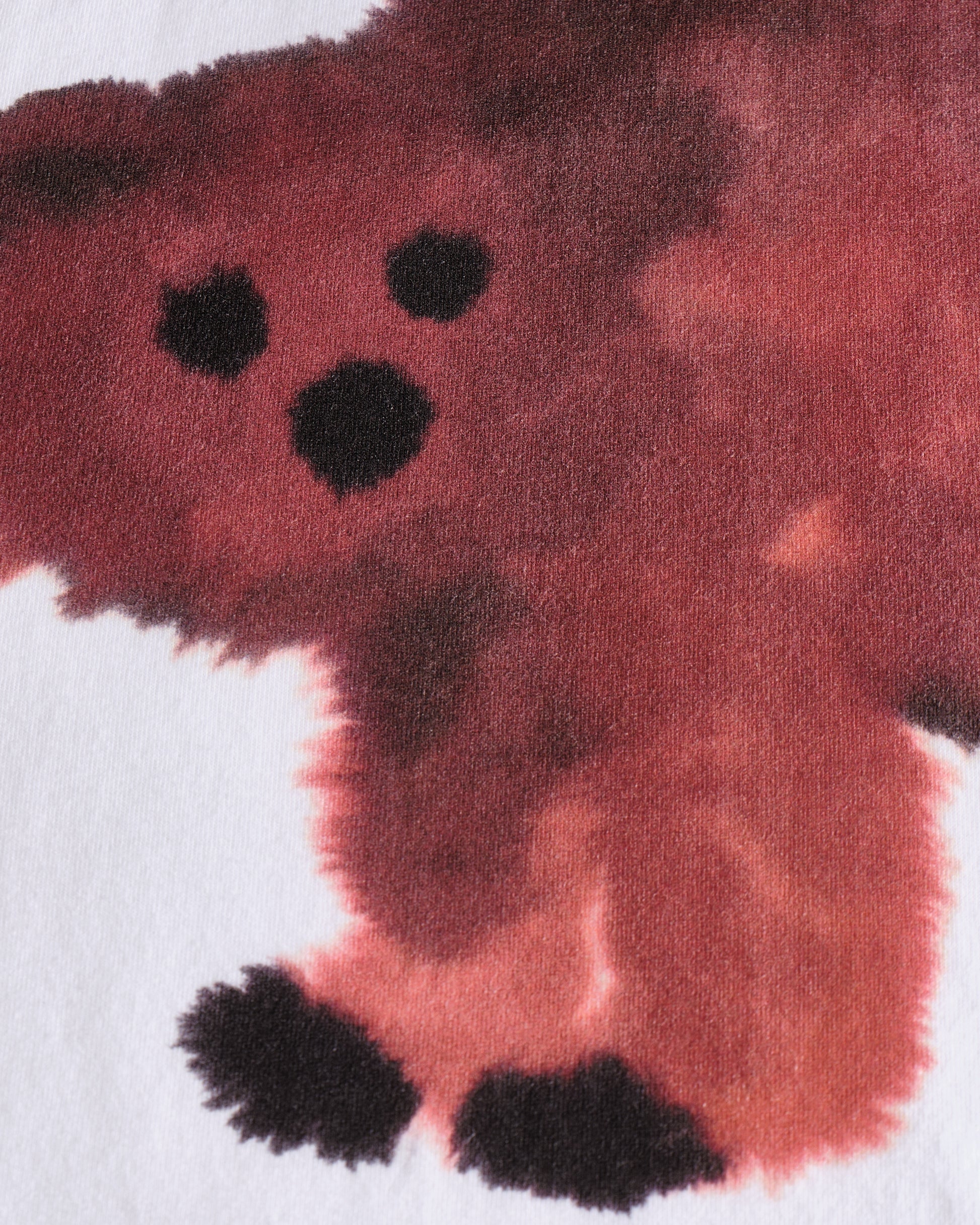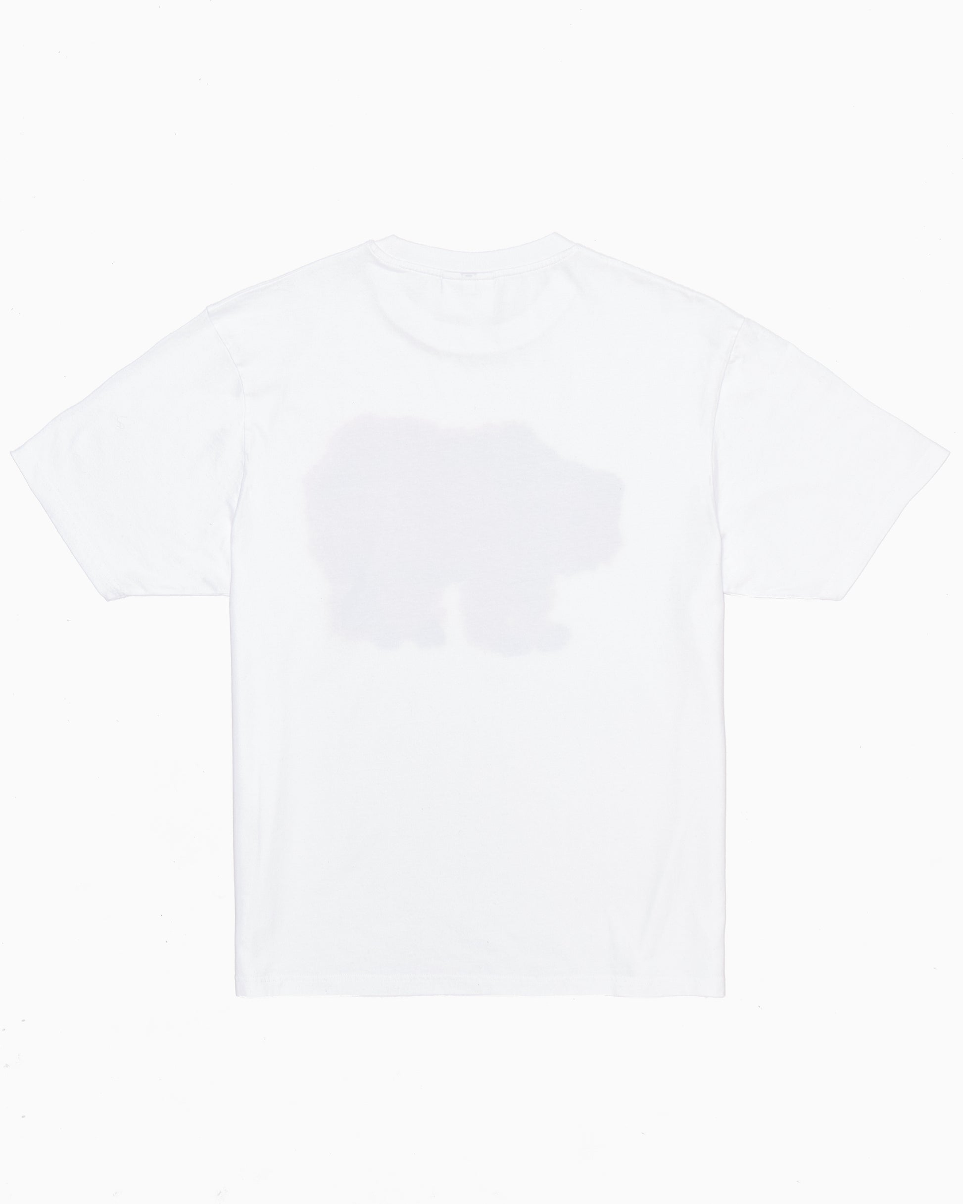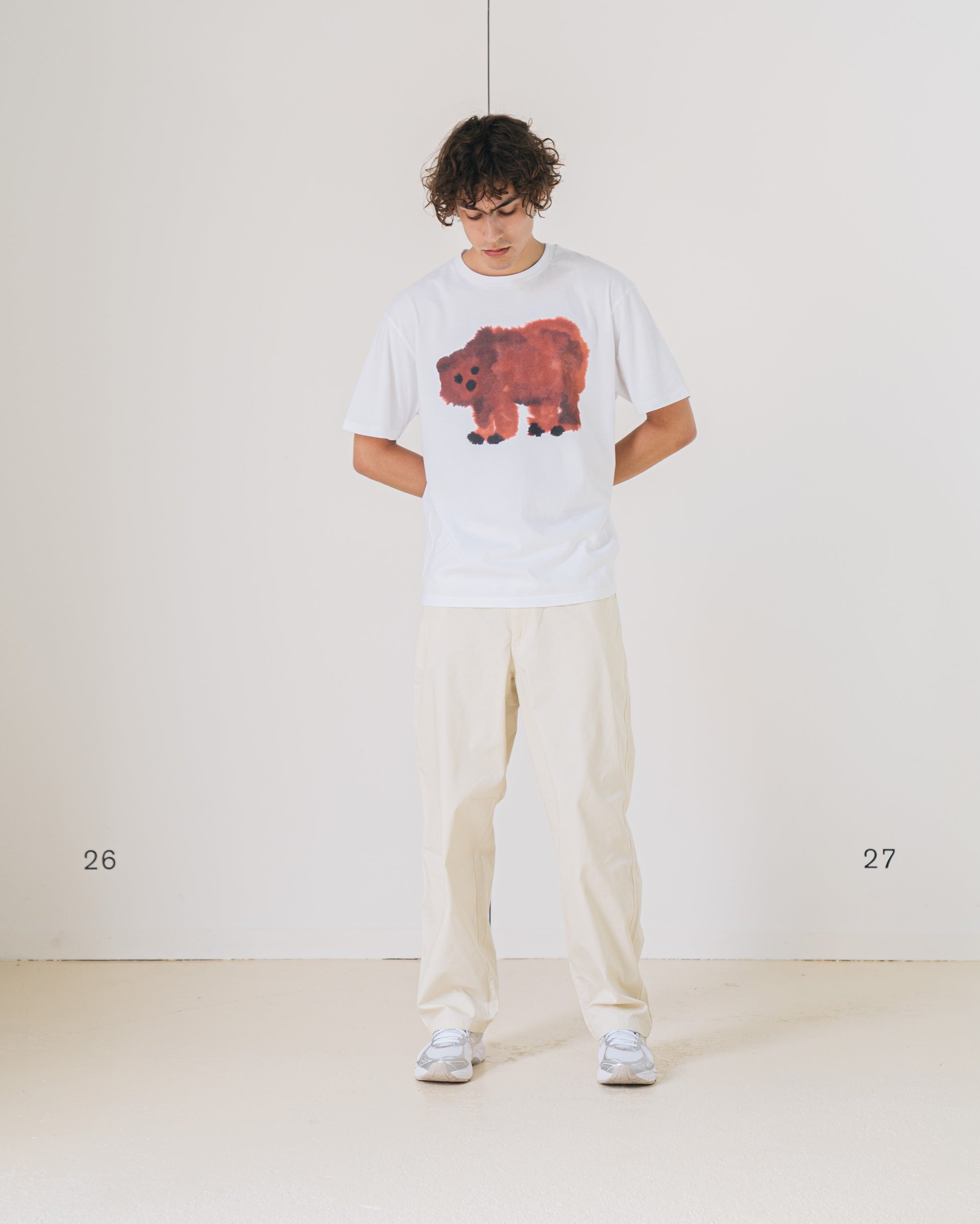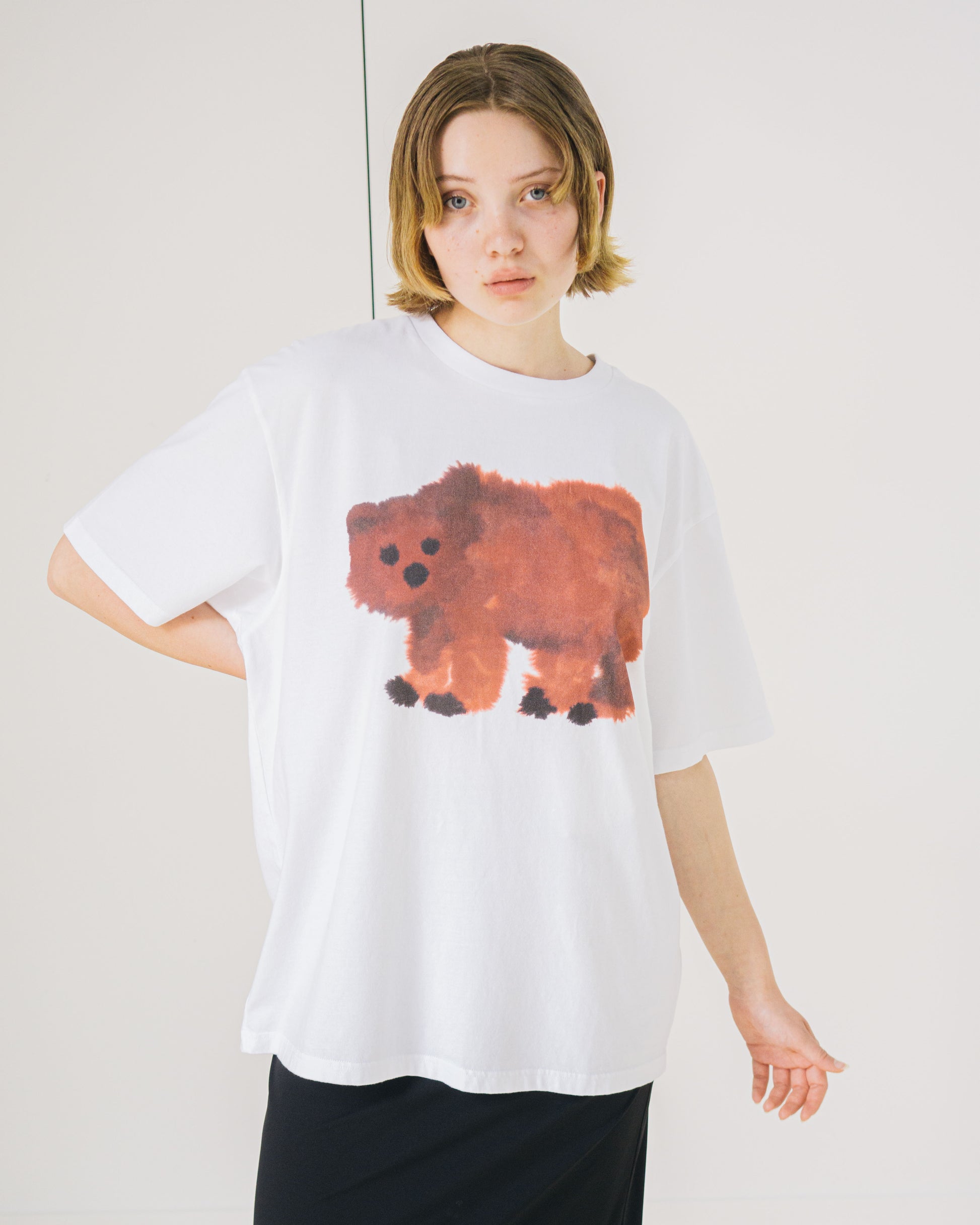 A white unisex t-shirt featuring a print of a Bear on the front. The fabric used to make this t-shirt is certified by GOTS. Tome is 1.89 cm and wears a size medium. Joy is 1.76 cm and wears a size medium.