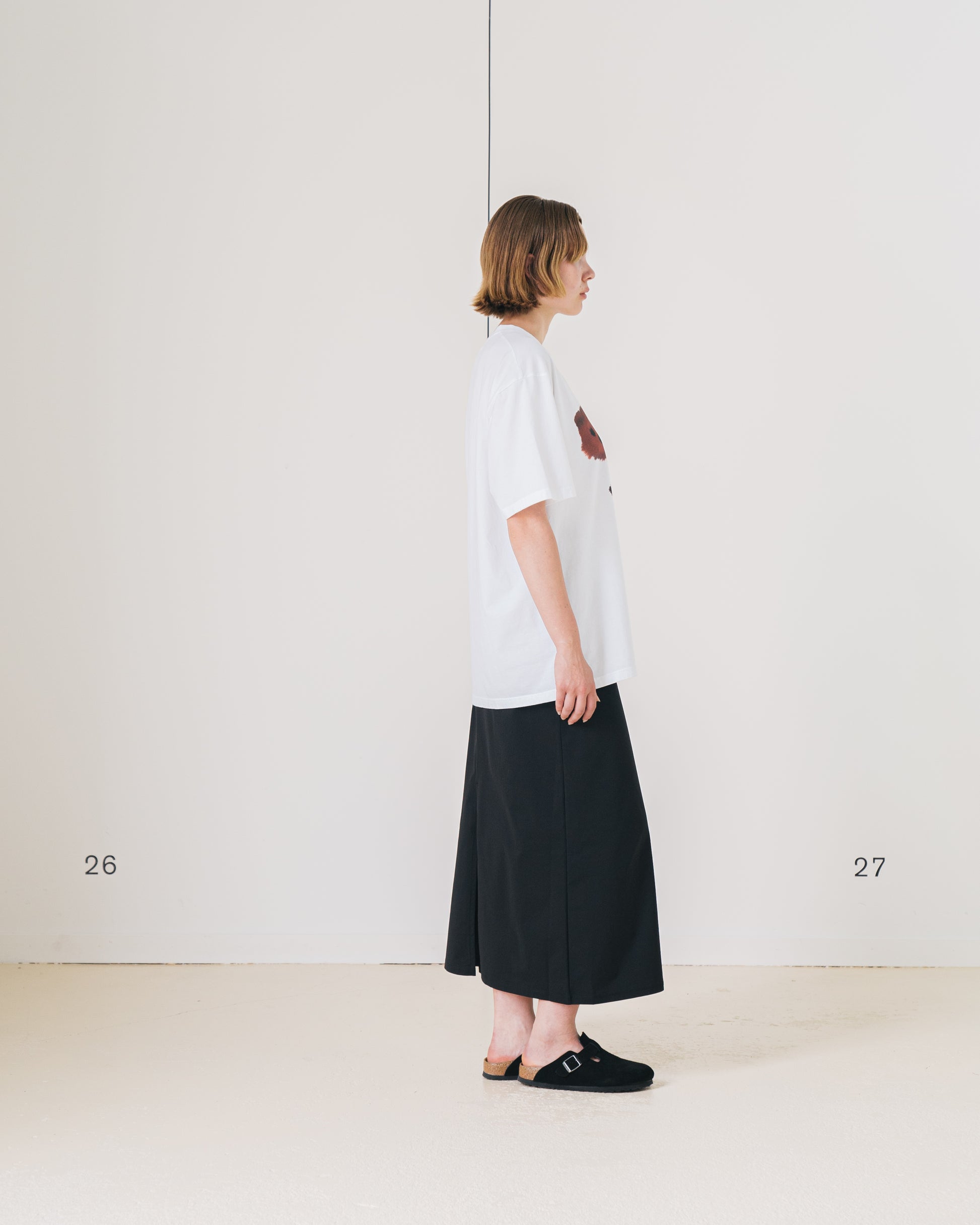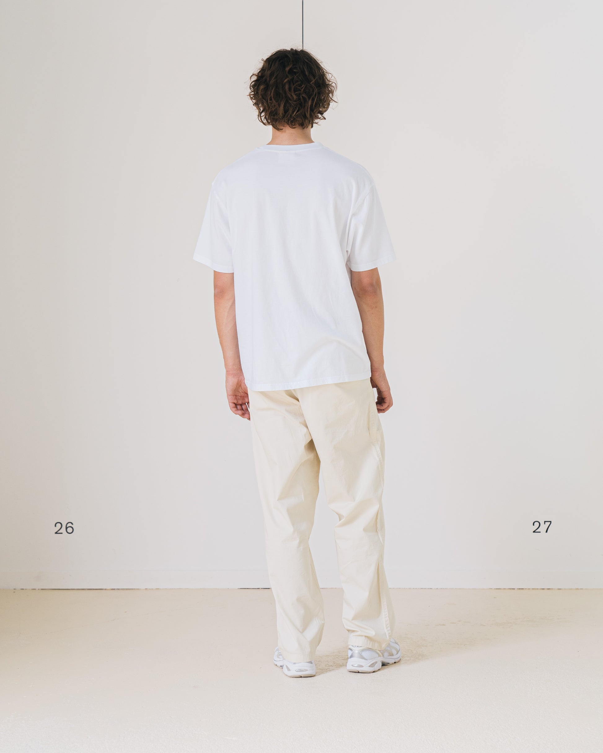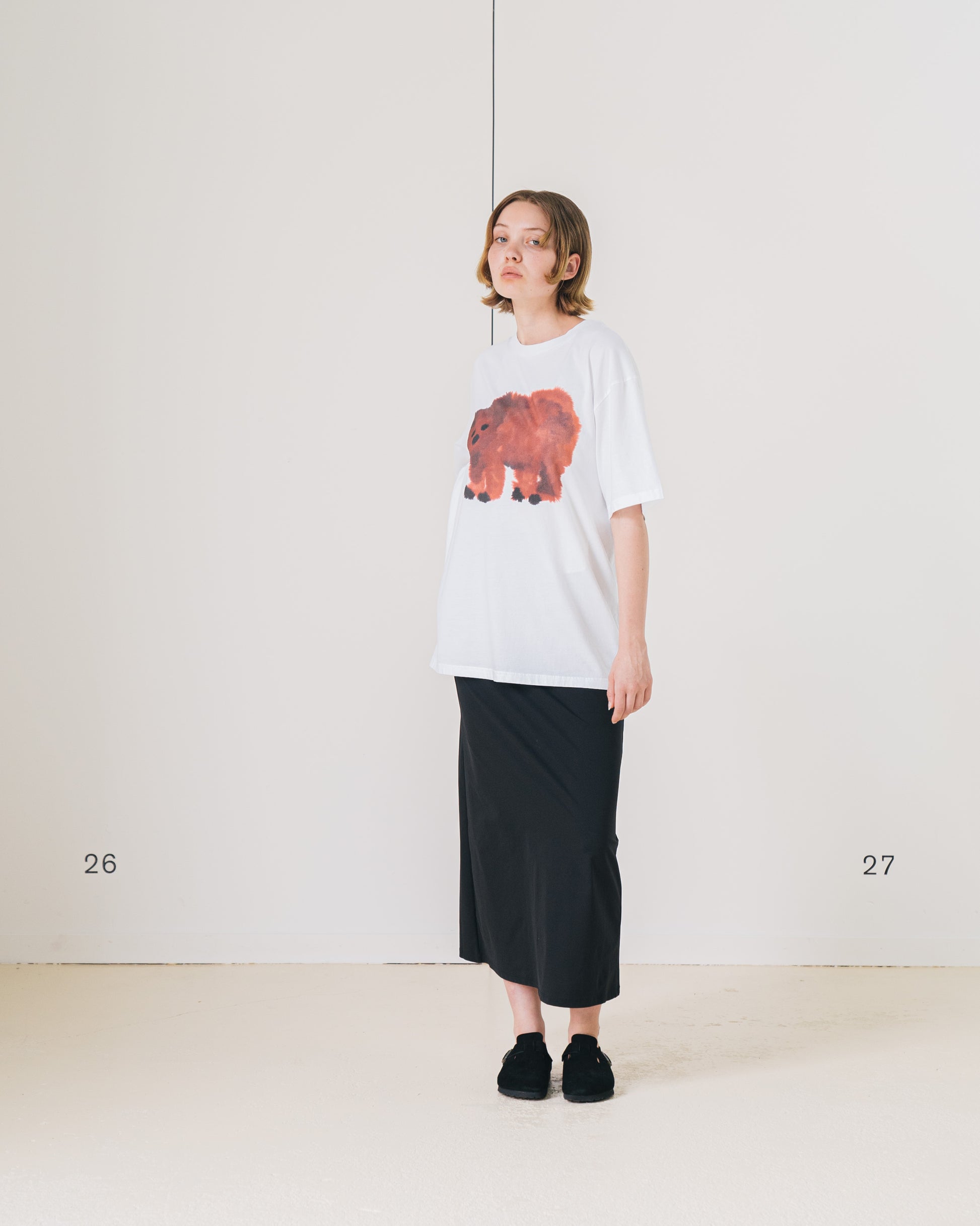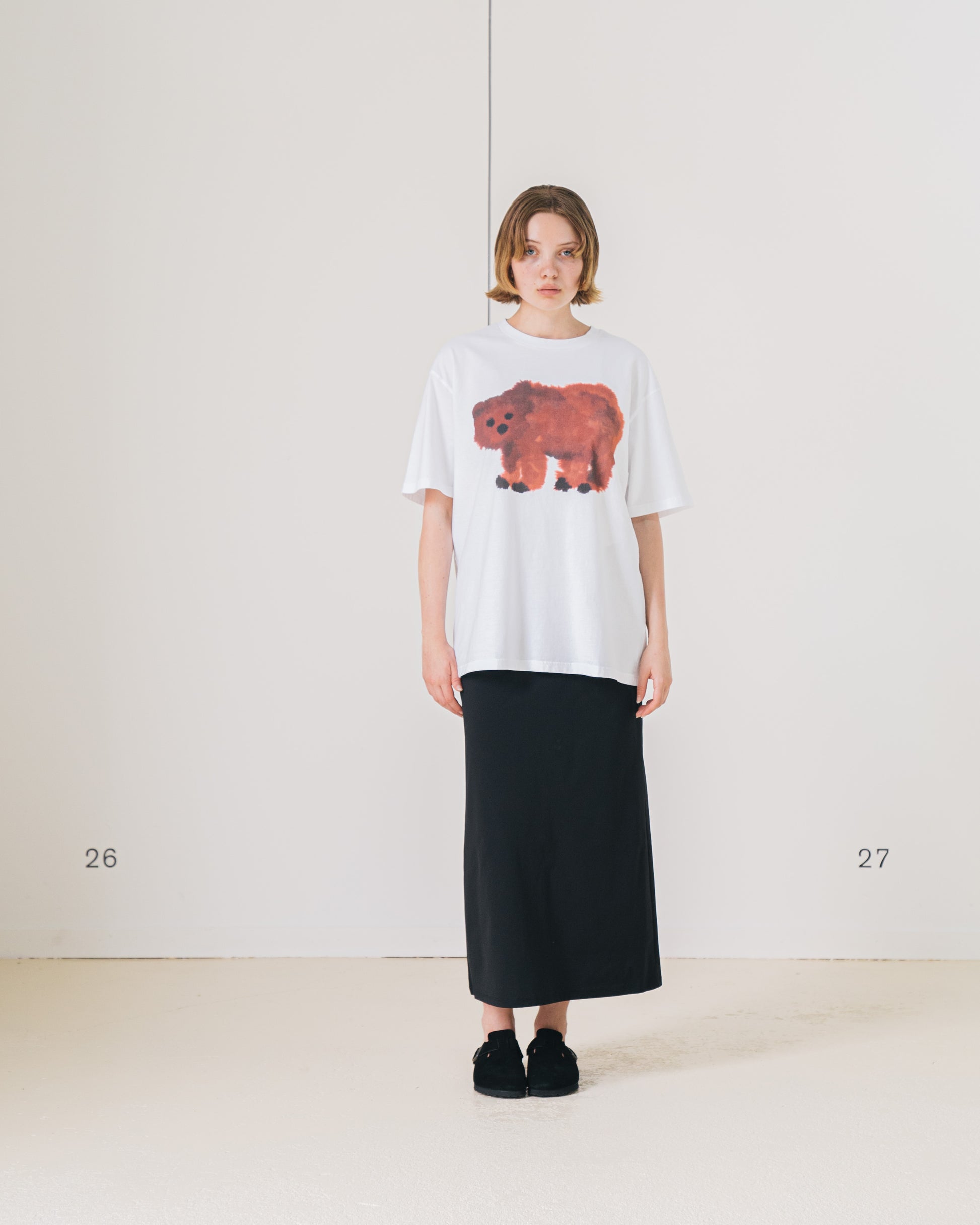 A white unisex t-shirt featuring a print of a Bear on the front. The fabric used to make this t-shirt is certified by GOTS. Tome is 1.89 cm and wears a size medium. Joy is 1.76 cm and wears a size medium.