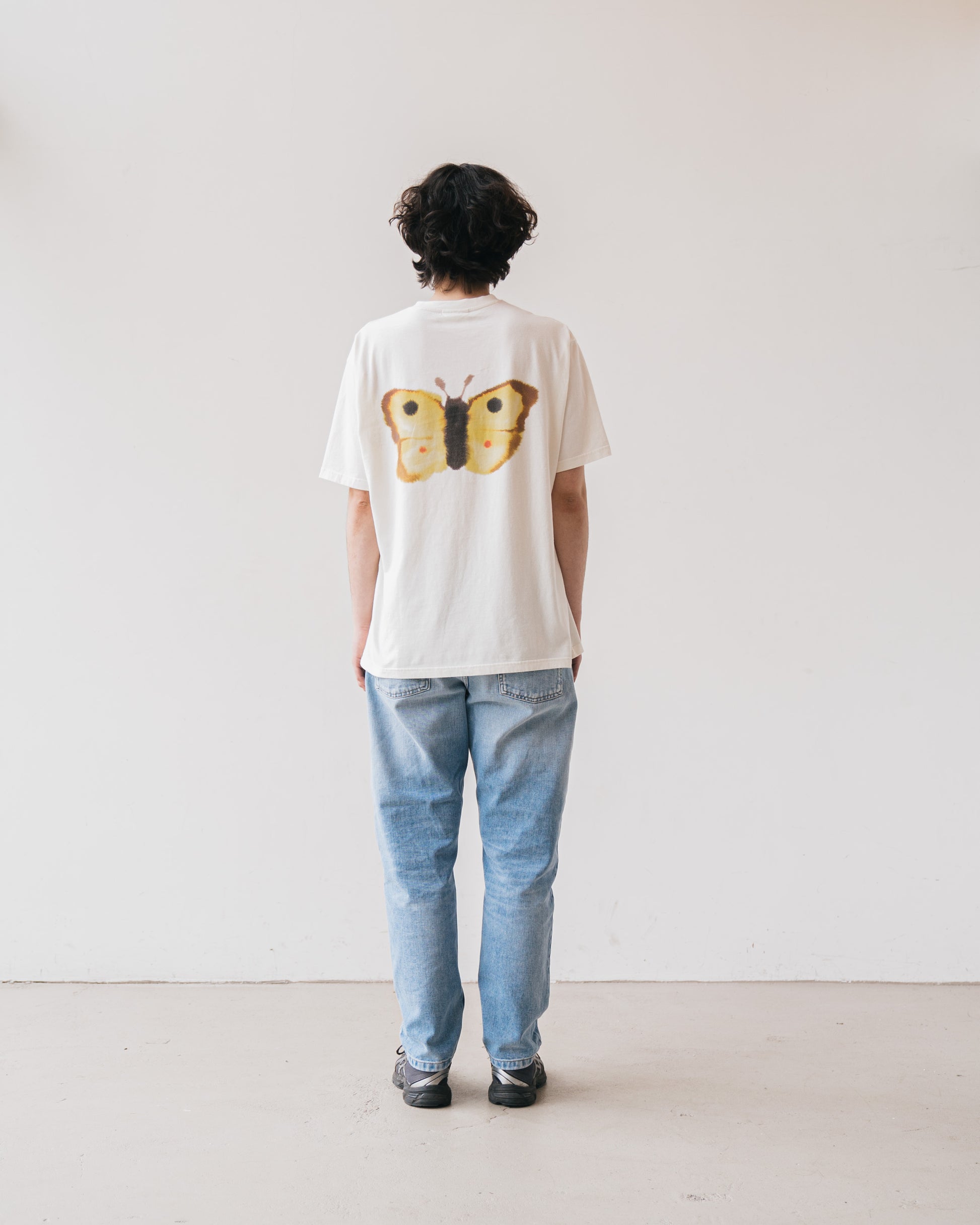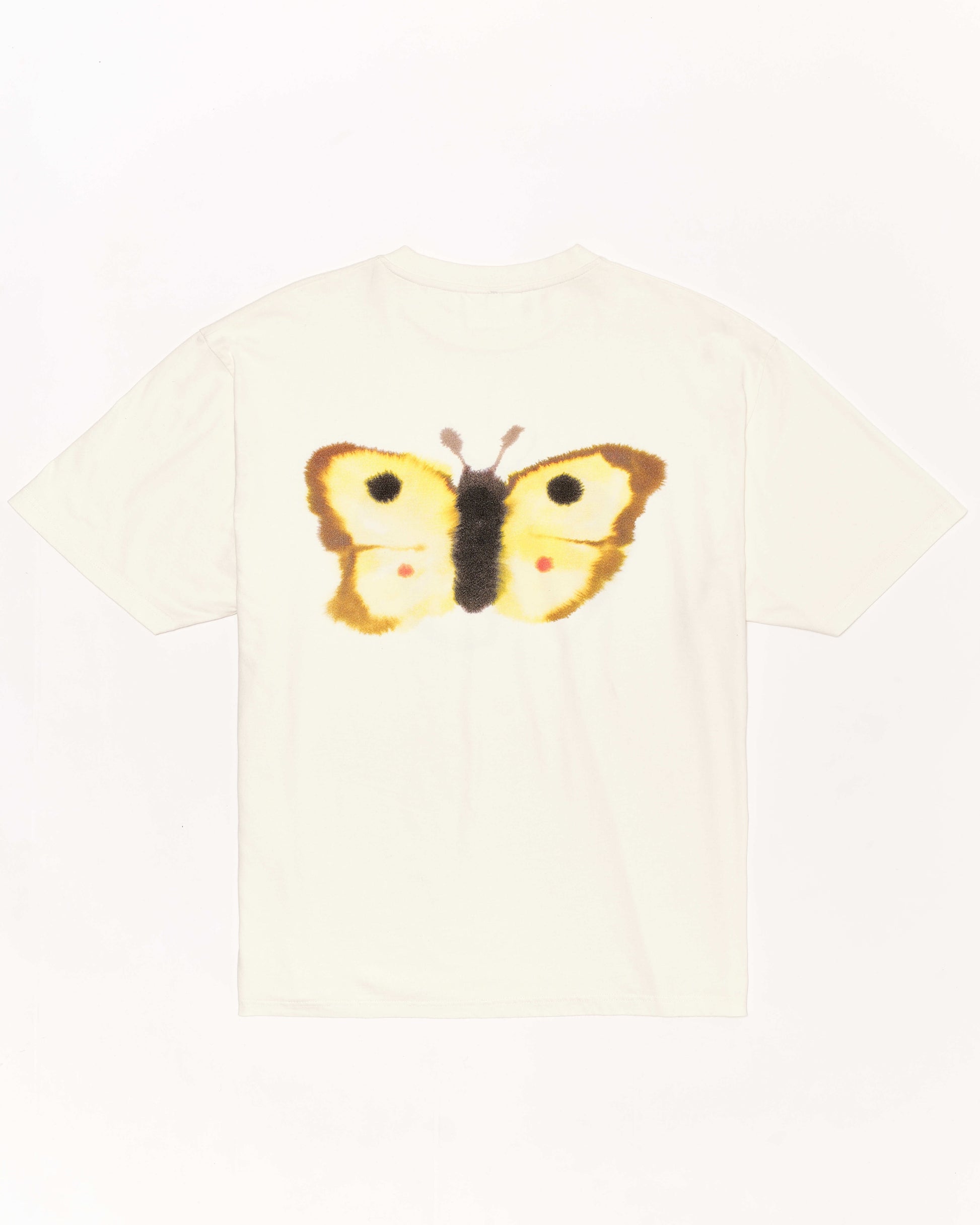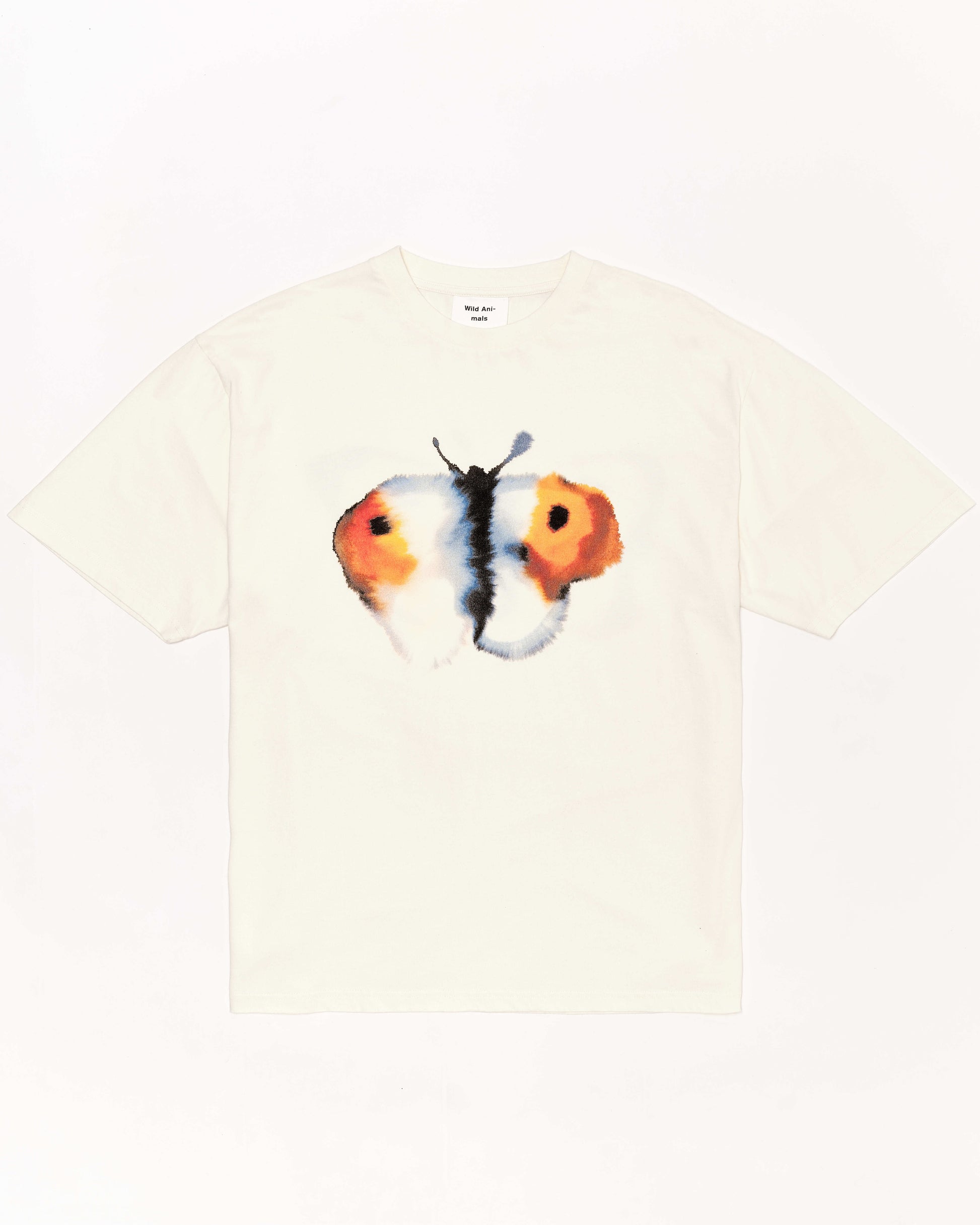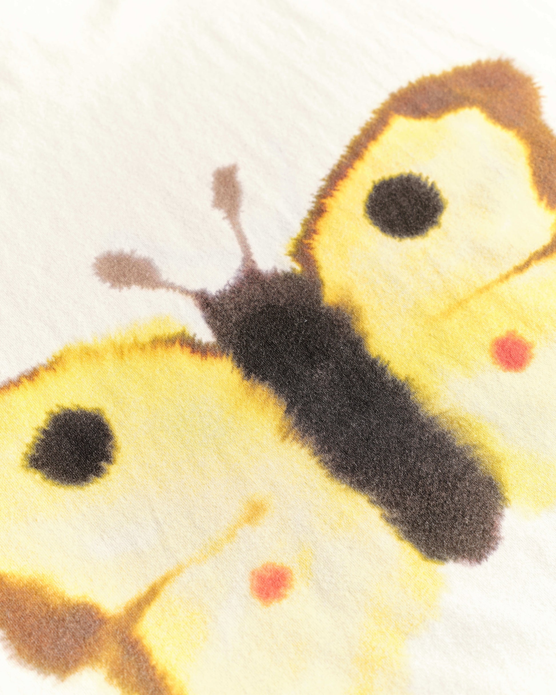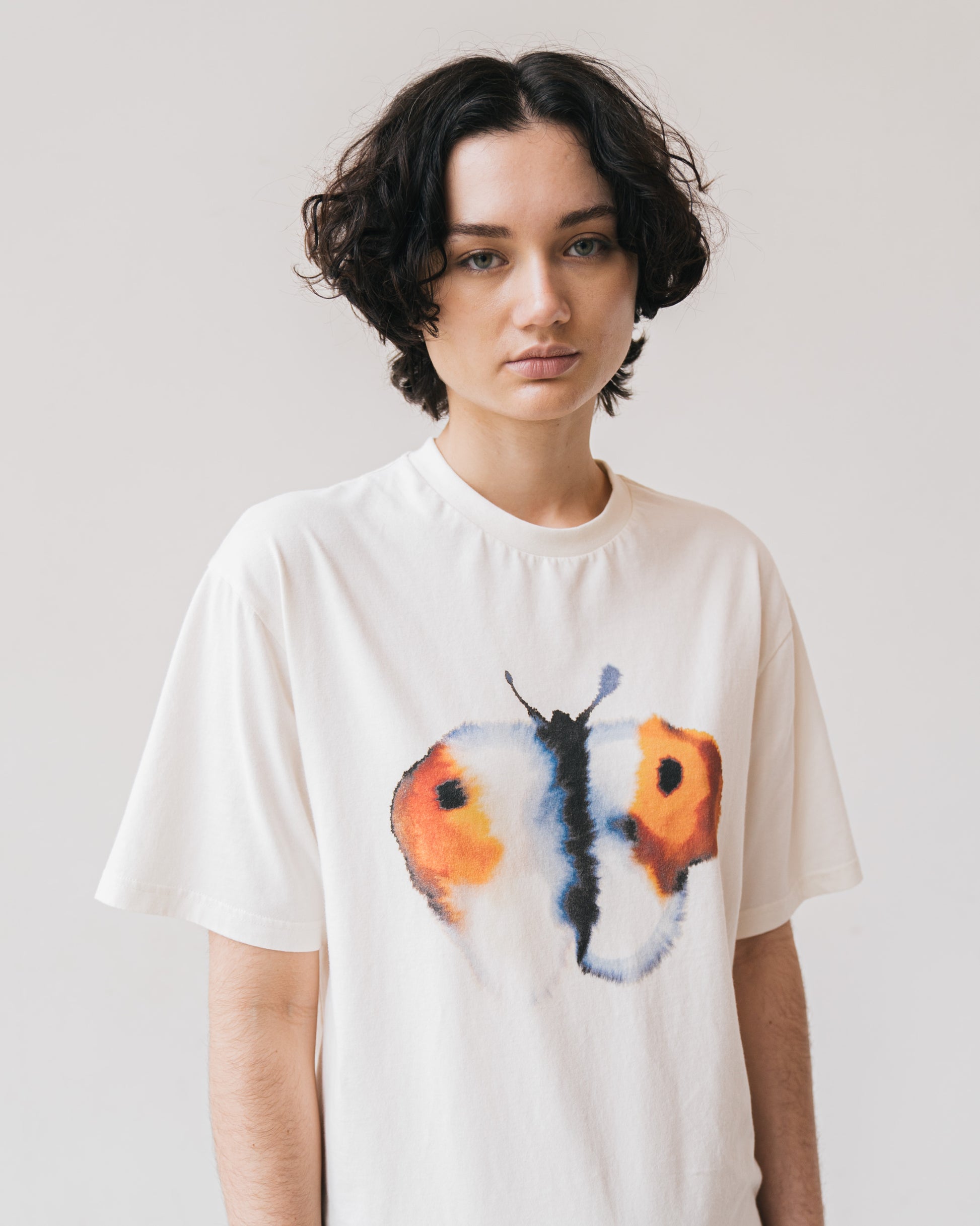 An off-white unisex t-shirt featuring a digital print of a two butterflies painted by Rop van Mierlo, one on the front and one on the back. The fabric used to make this t-shirt is certified by GOTS.