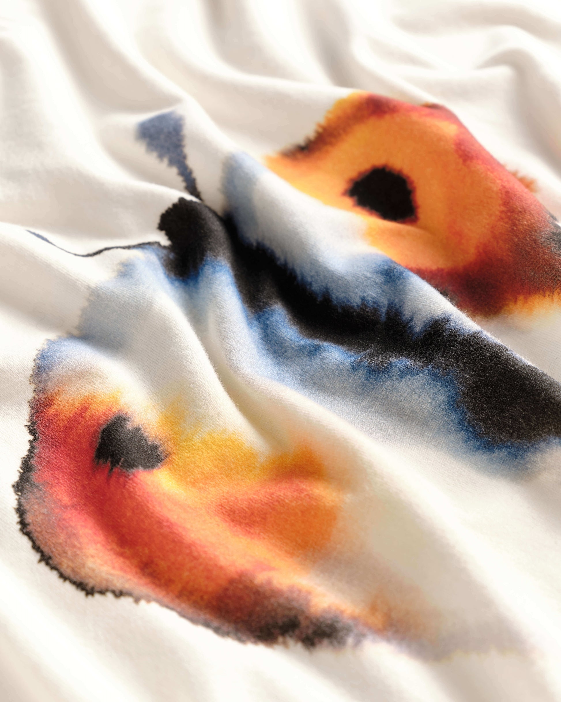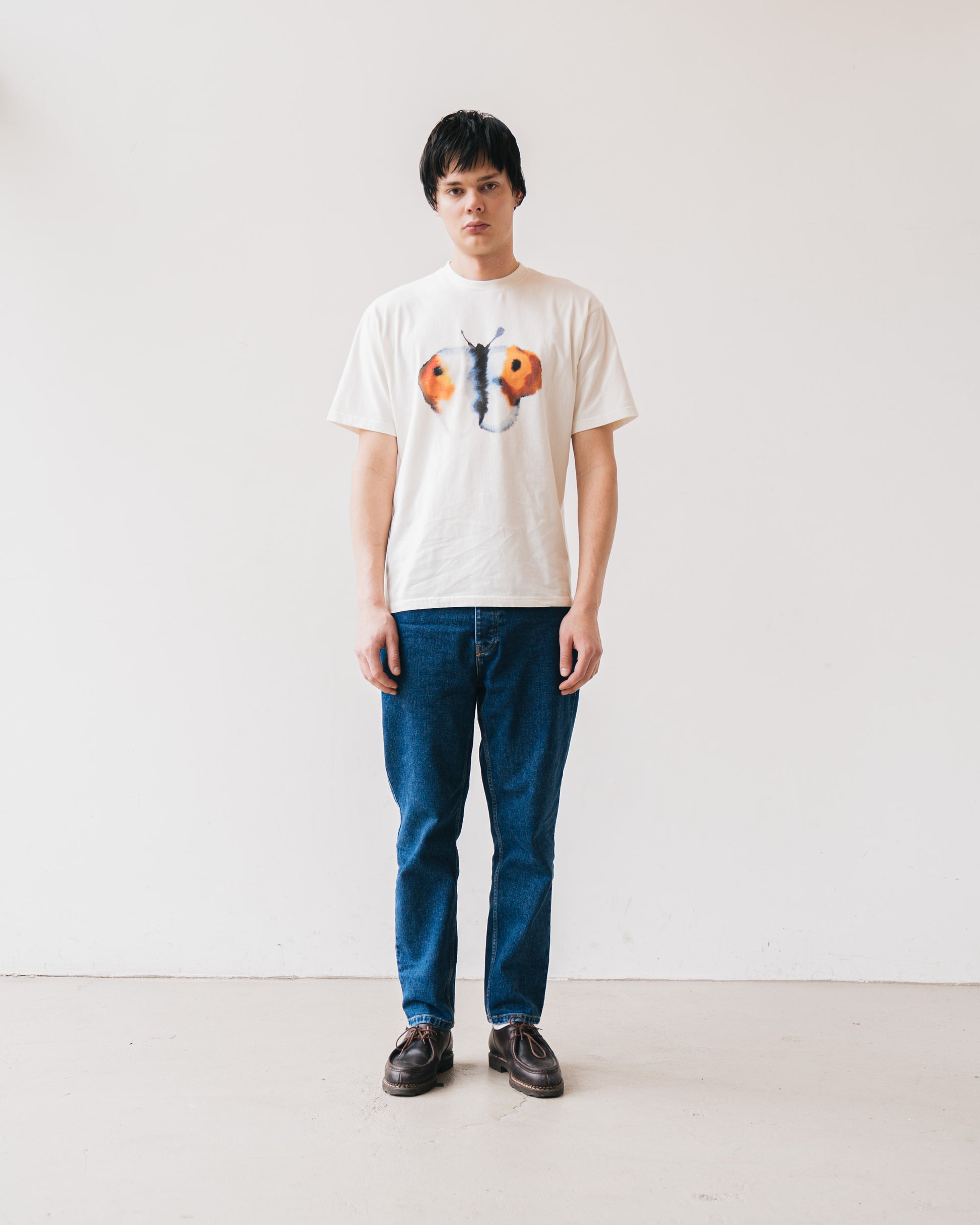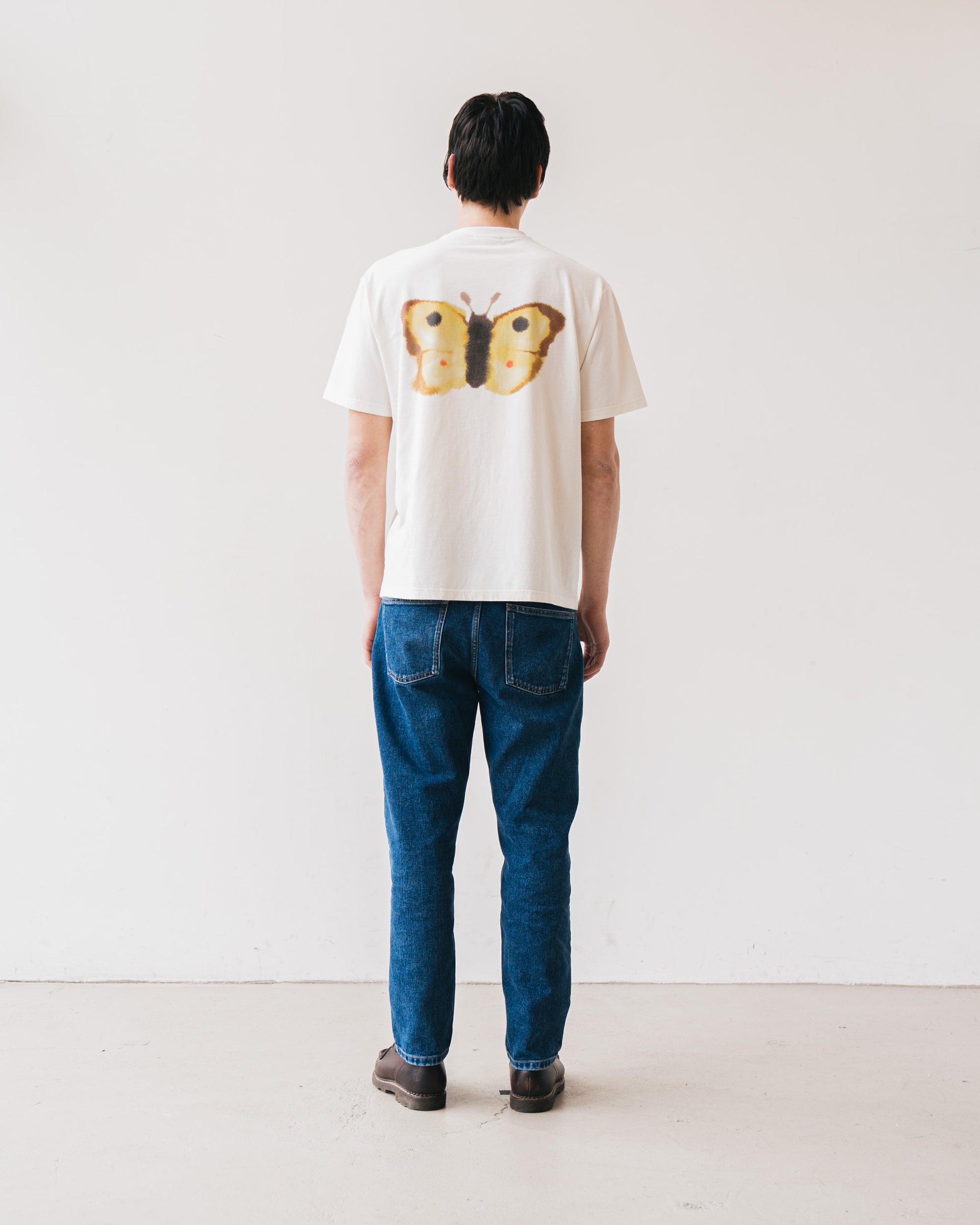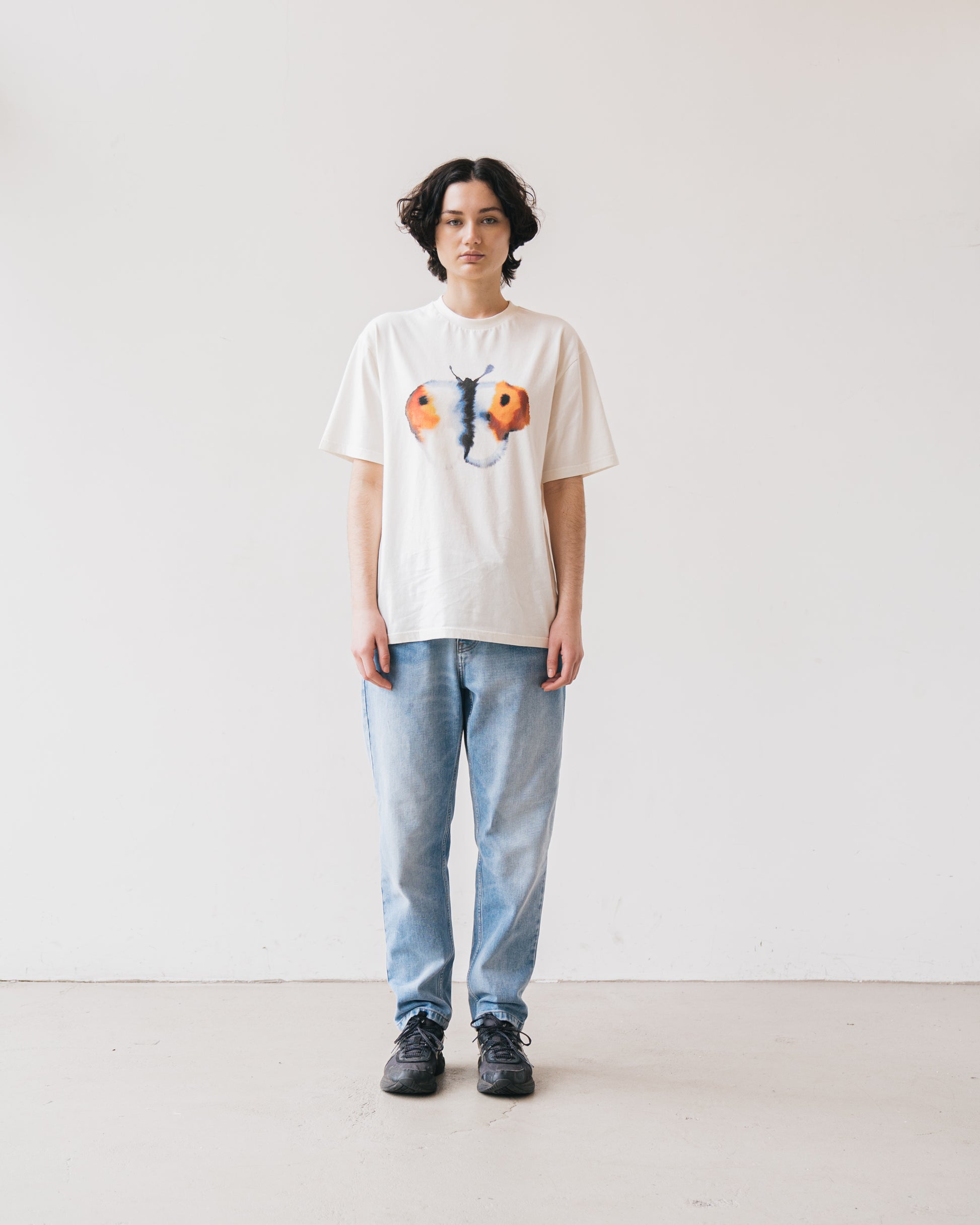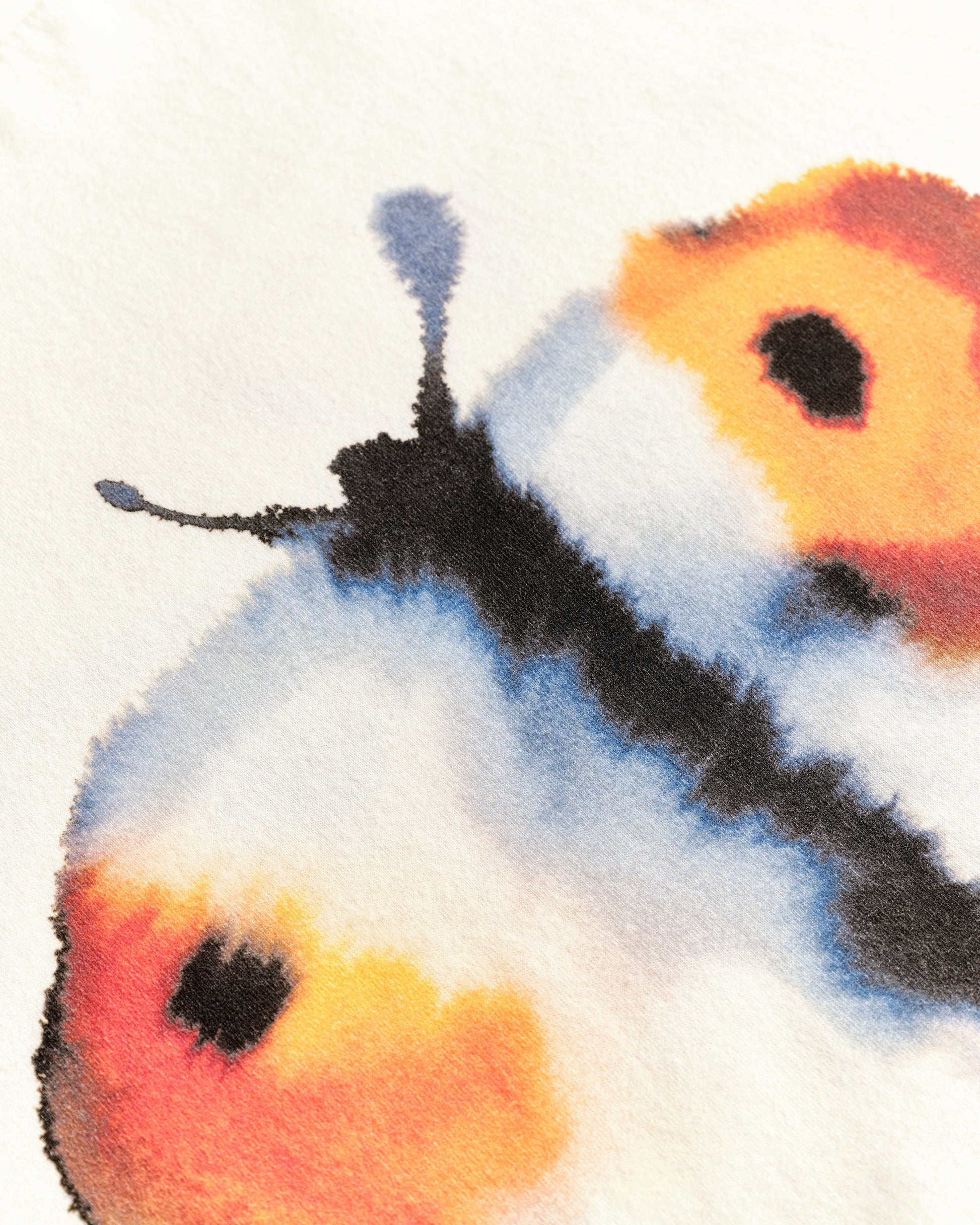 An off-white unisex t-shirt featuring a digital print of a two butterflies painted by Rop van Mierlo, one on the front and one on the back. The fabric used to make this t-shirt is certified by GOTS.