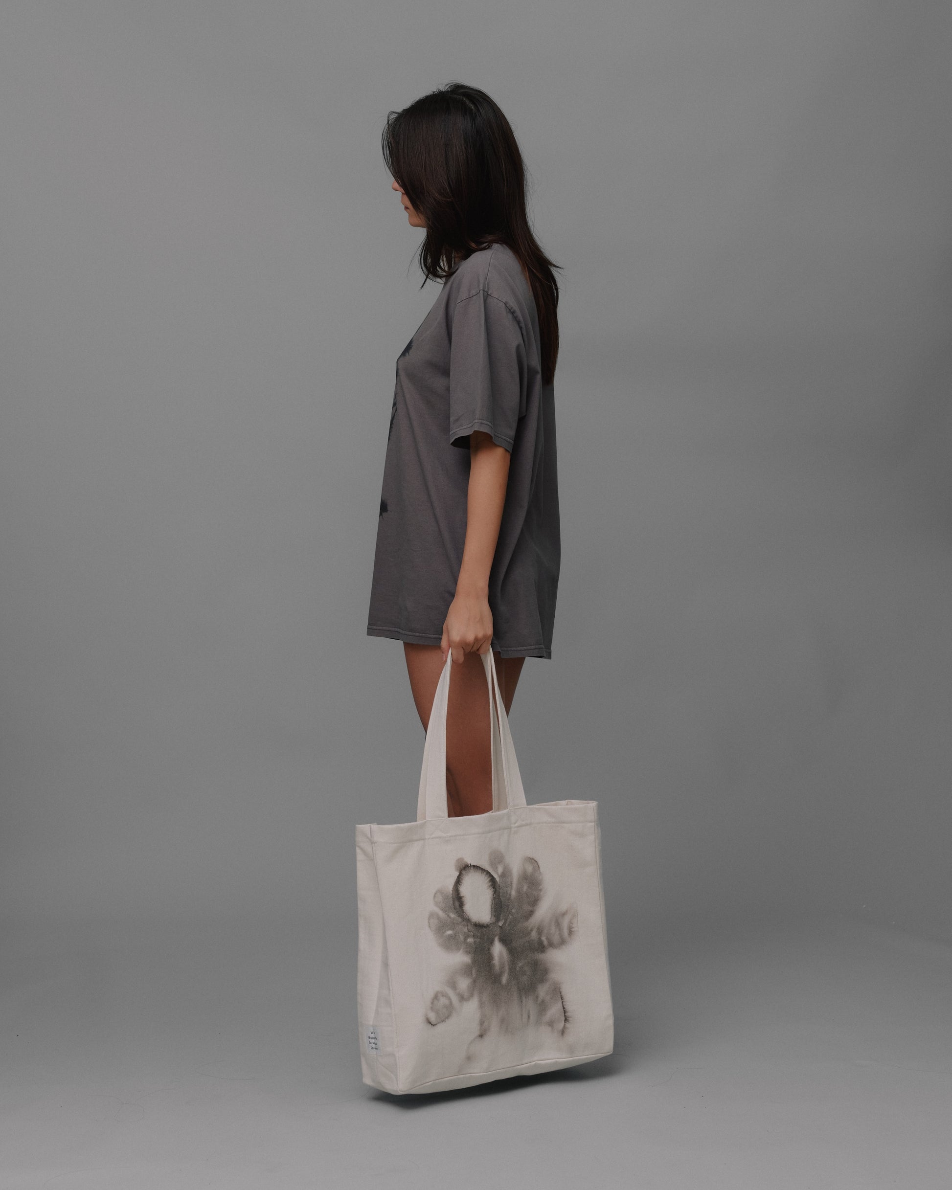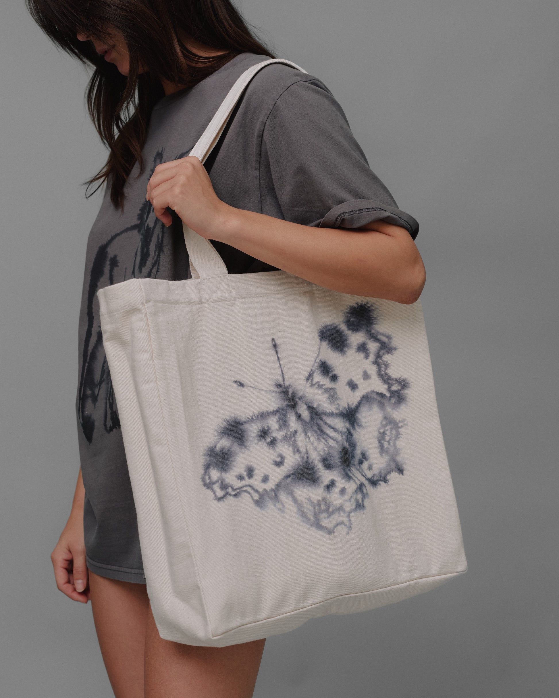 A cotton tote bag featuring a digital print of a Butterfly on the front and a Tarantula on the back.