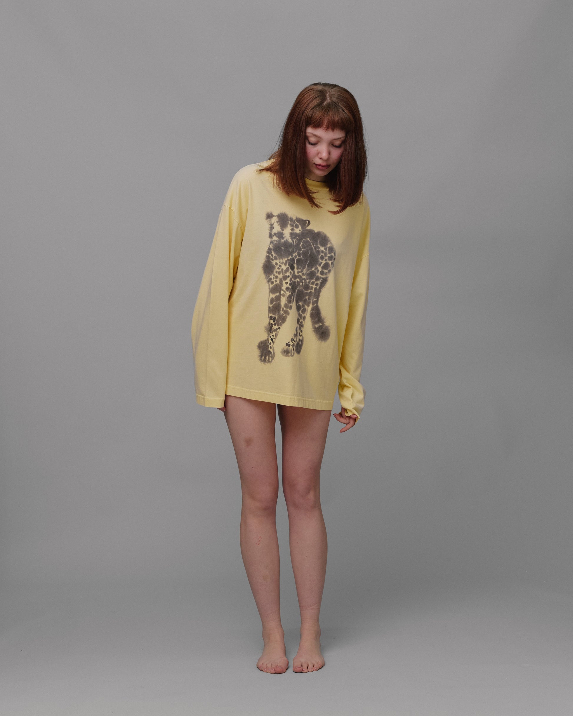 A unisex garment-dye yellow longsleeve featuring a Cheetah on the front. The fabric used to make this t-shirt is certified by GOTS.