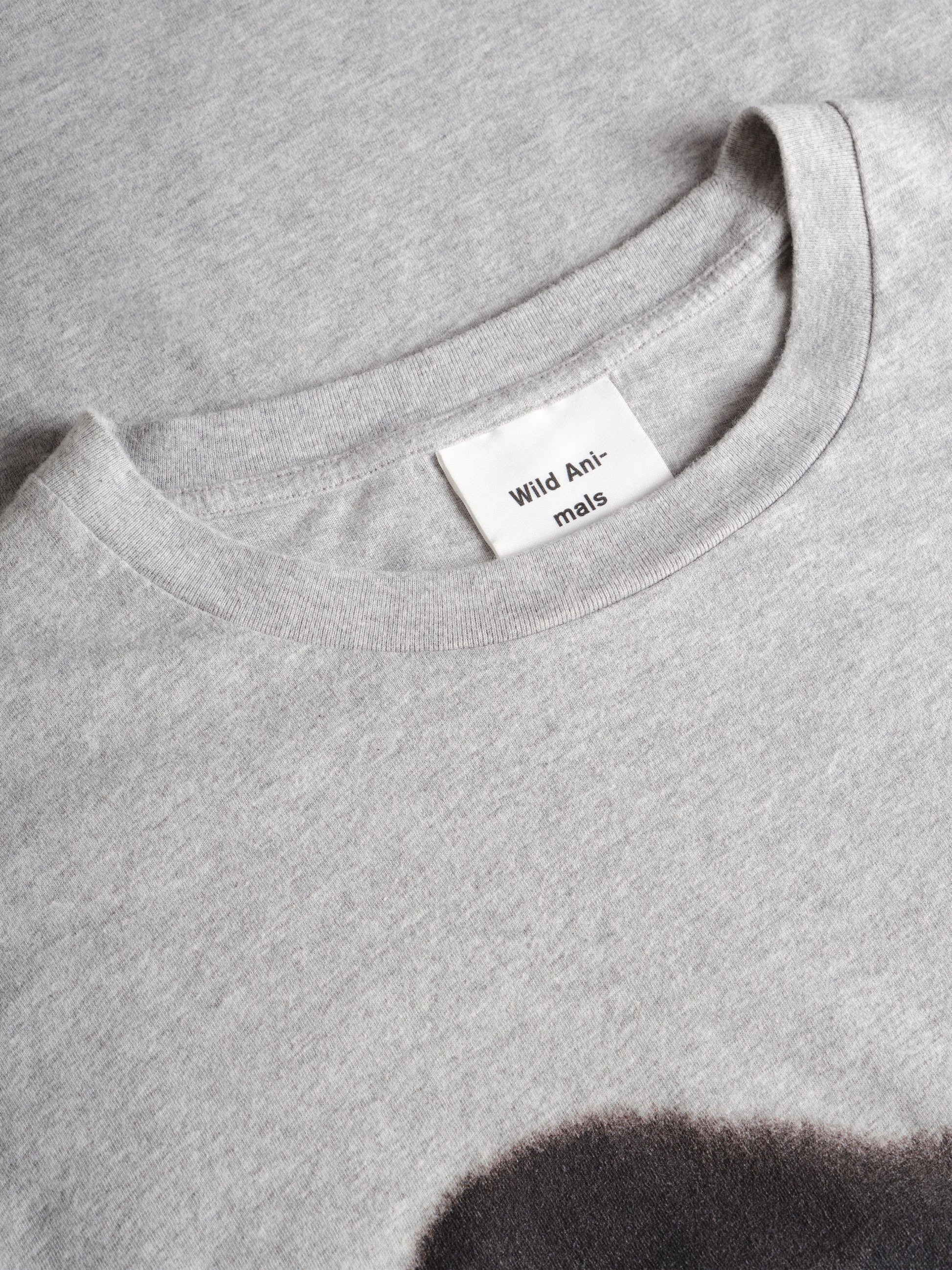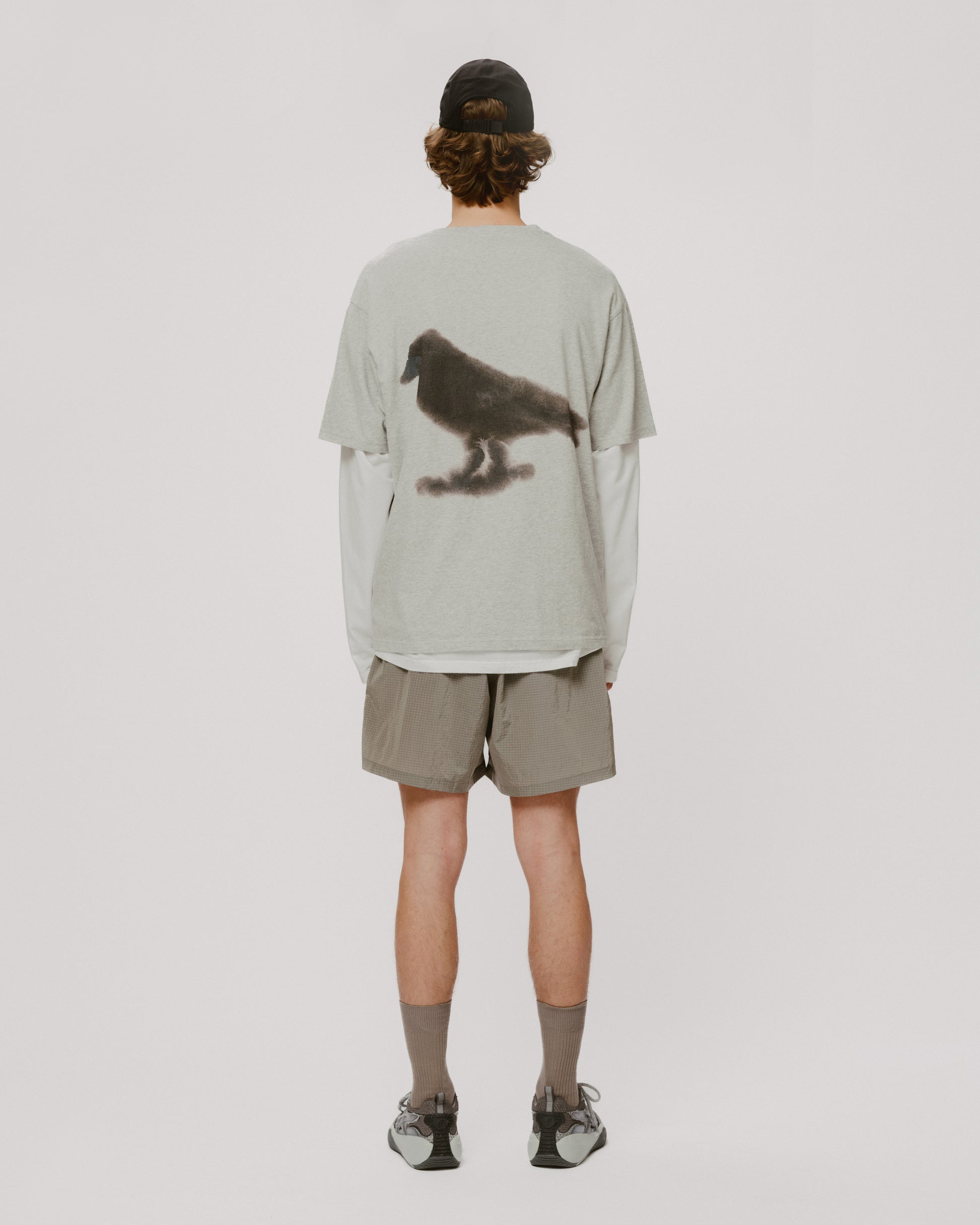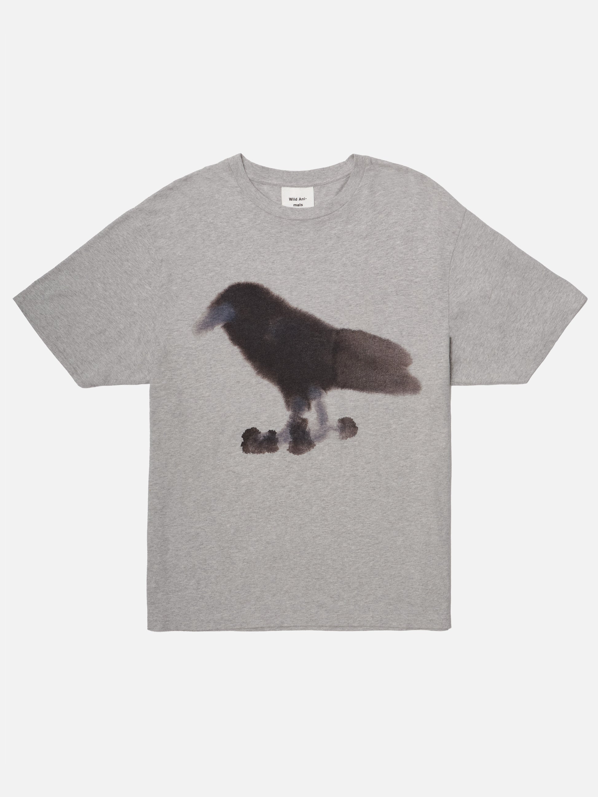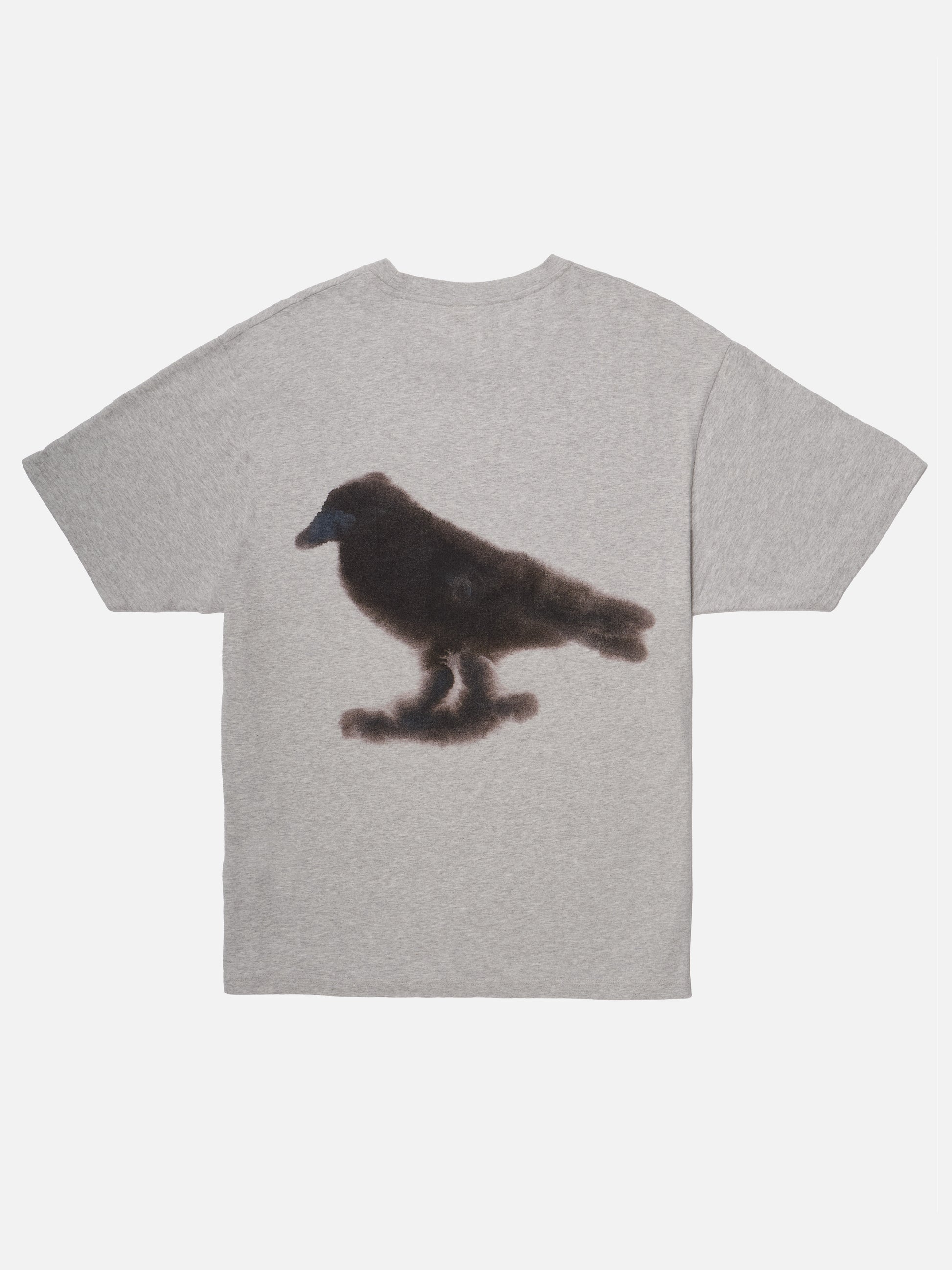 A heather grey unisex t-shirt featuring a Crow on the front and a Crow on the back. The fabric used to make this t-shirt is certified by GOTS.