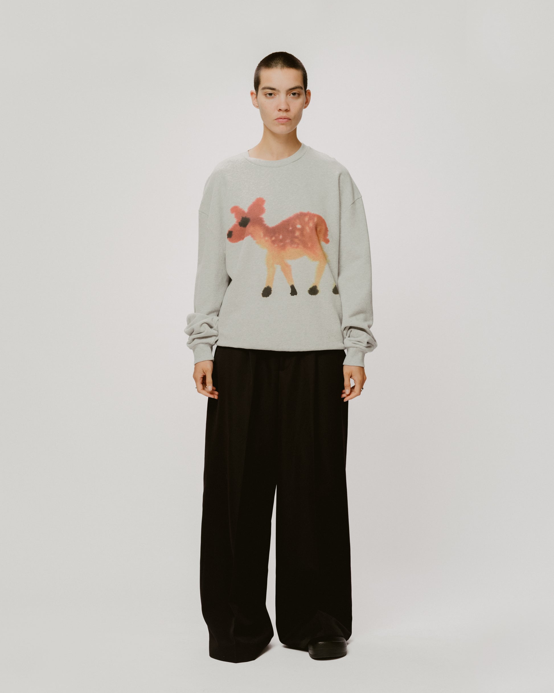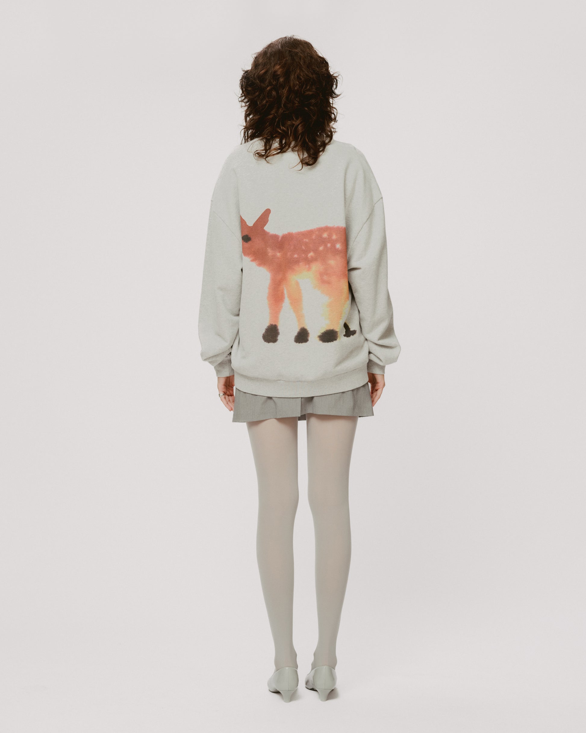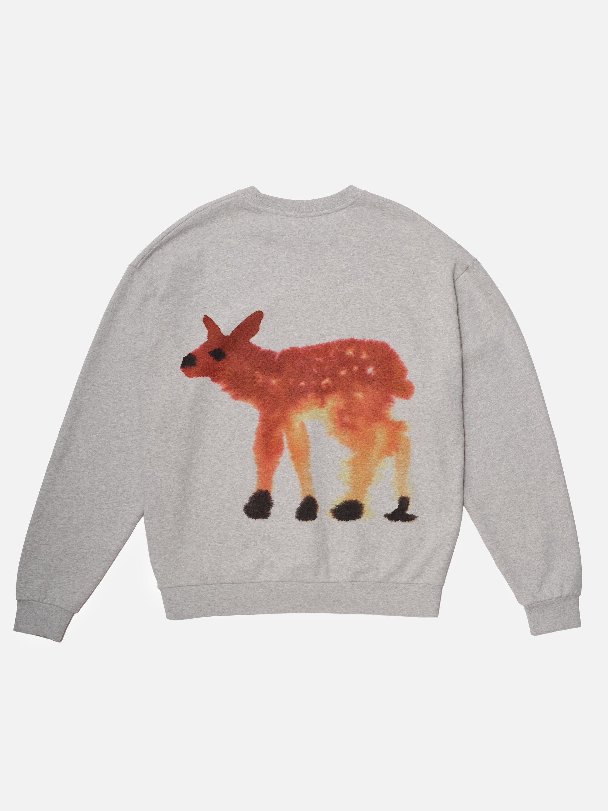 A heather grey unisex sweater featuring a Deer on the front and a Deer on the back. The fabric used to make this sweater is certified by GOTS.