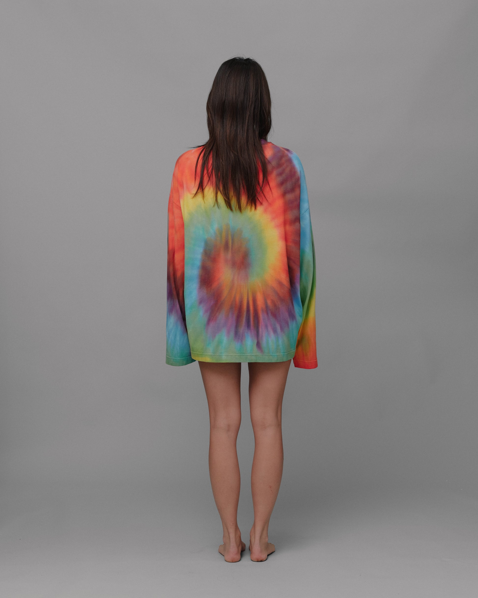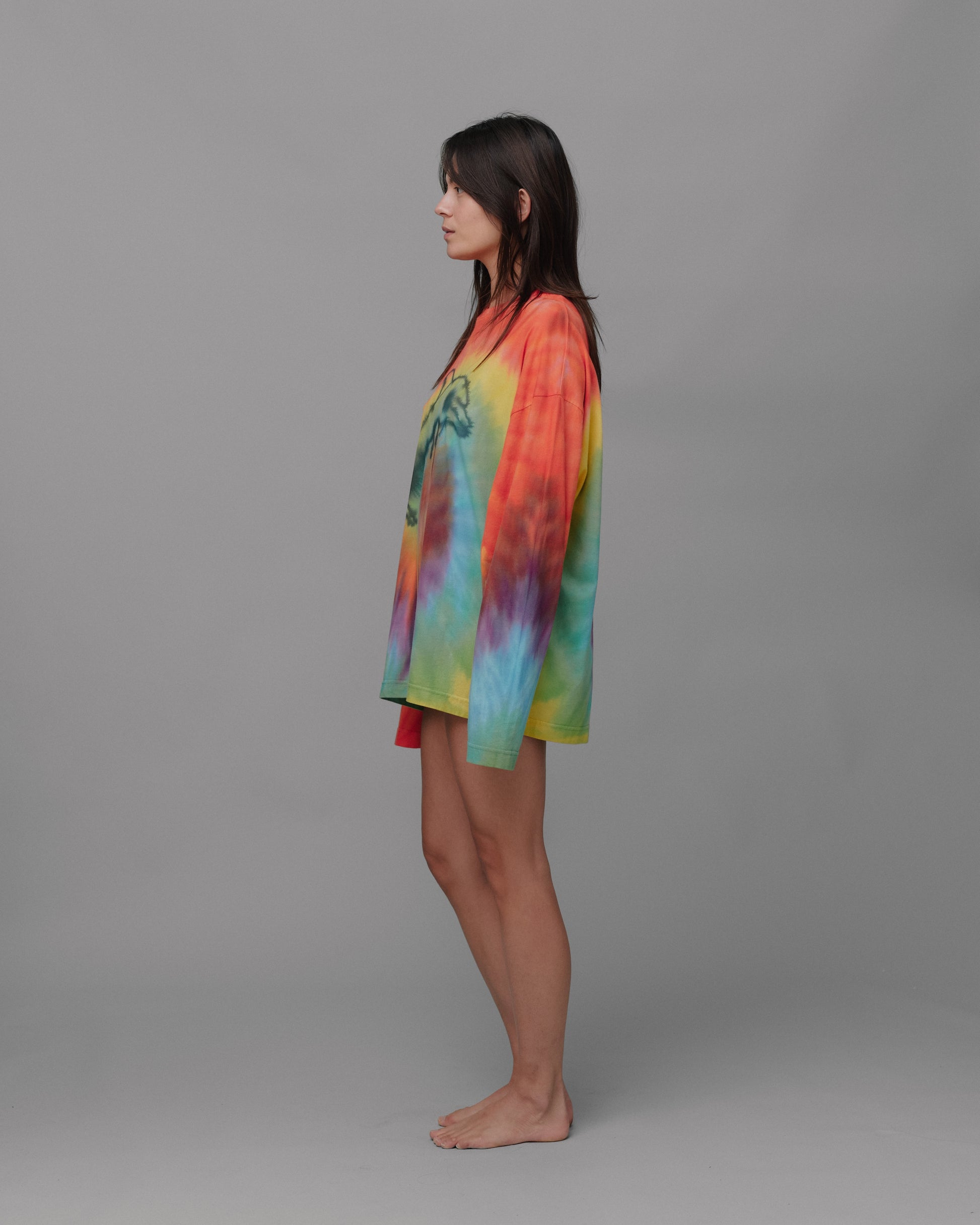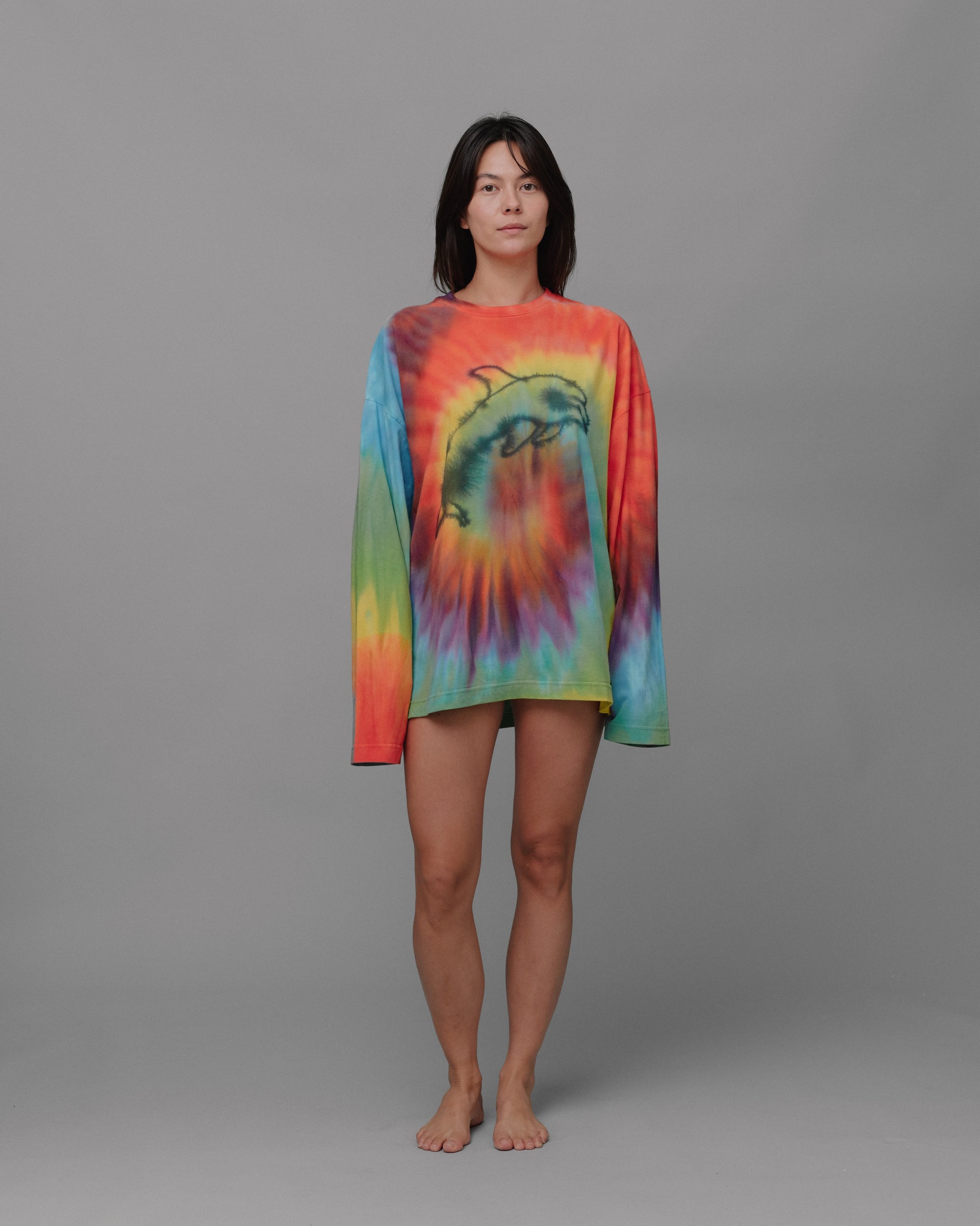 A tie dye unisex longsleeve featuring a Dolphin on the front. The fabric used to make this t-shirt is certified by GOTS.