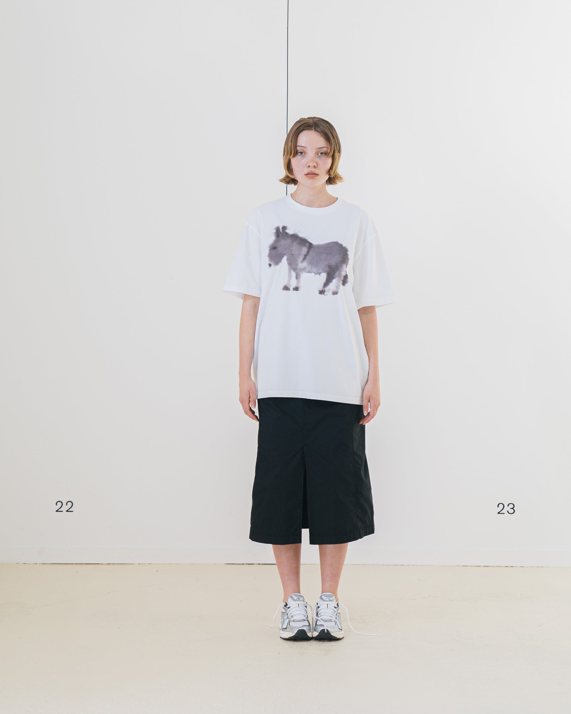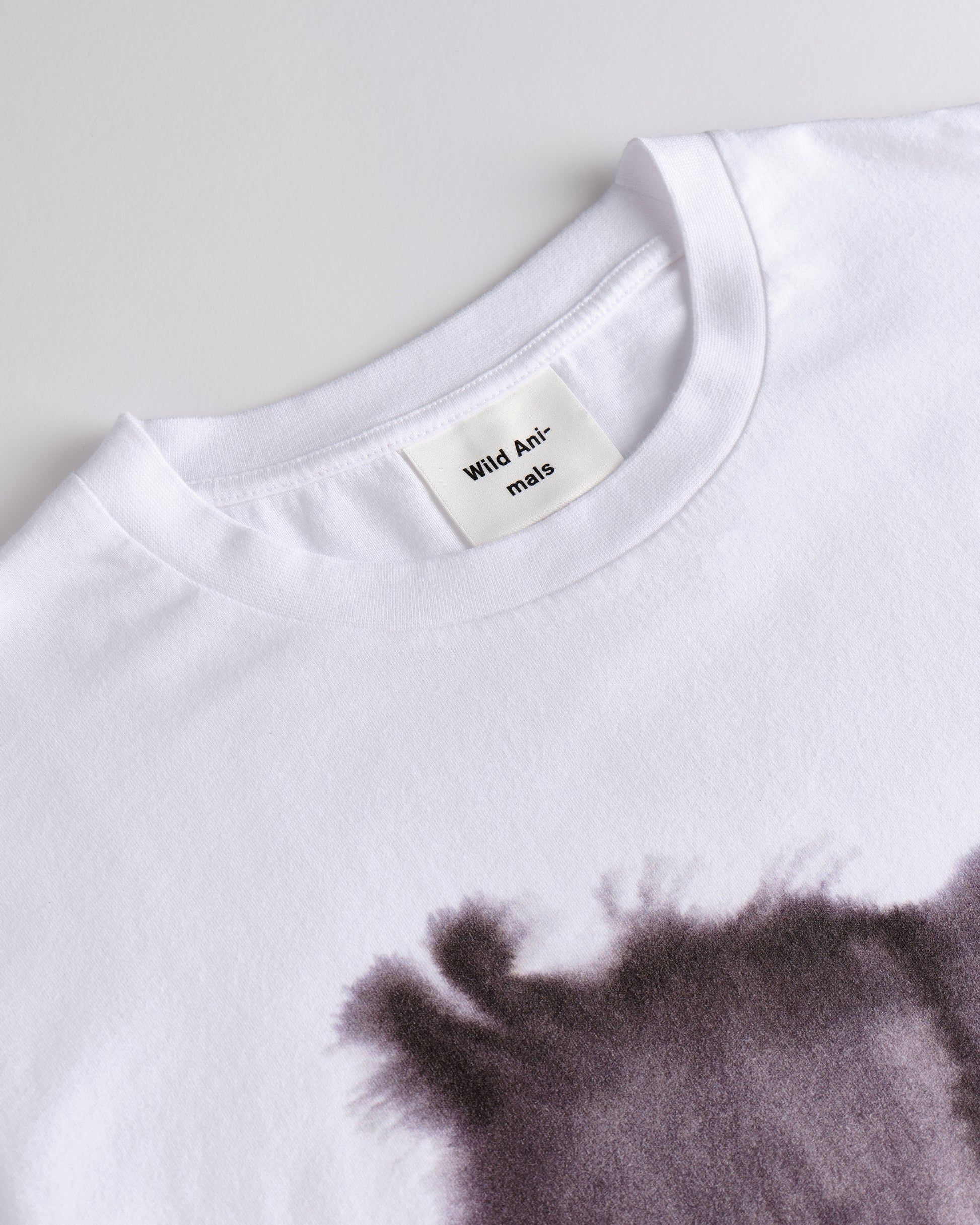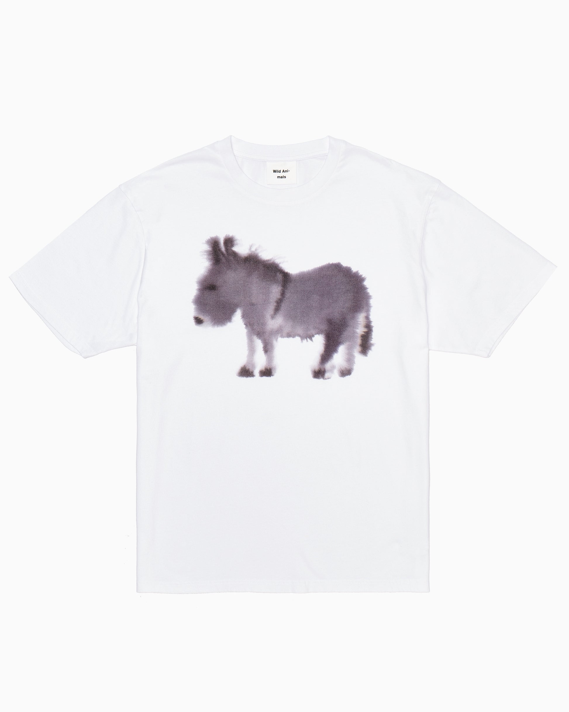 A white unisex t-shirt featuring a print of a Donkey on the front. The fabric used to make this t-shirt is certified by GOTS. Tome is 1.89 cm and wears a size medium. Joy is 1.76 cm and wears a size medium.