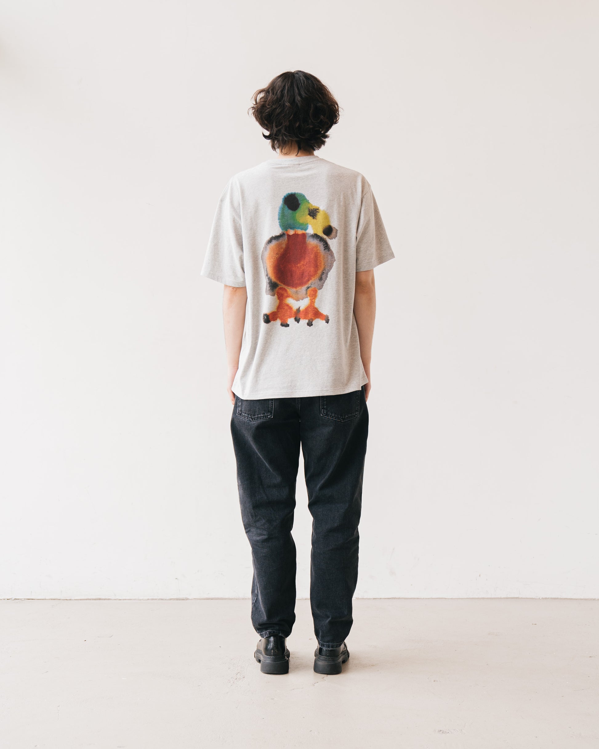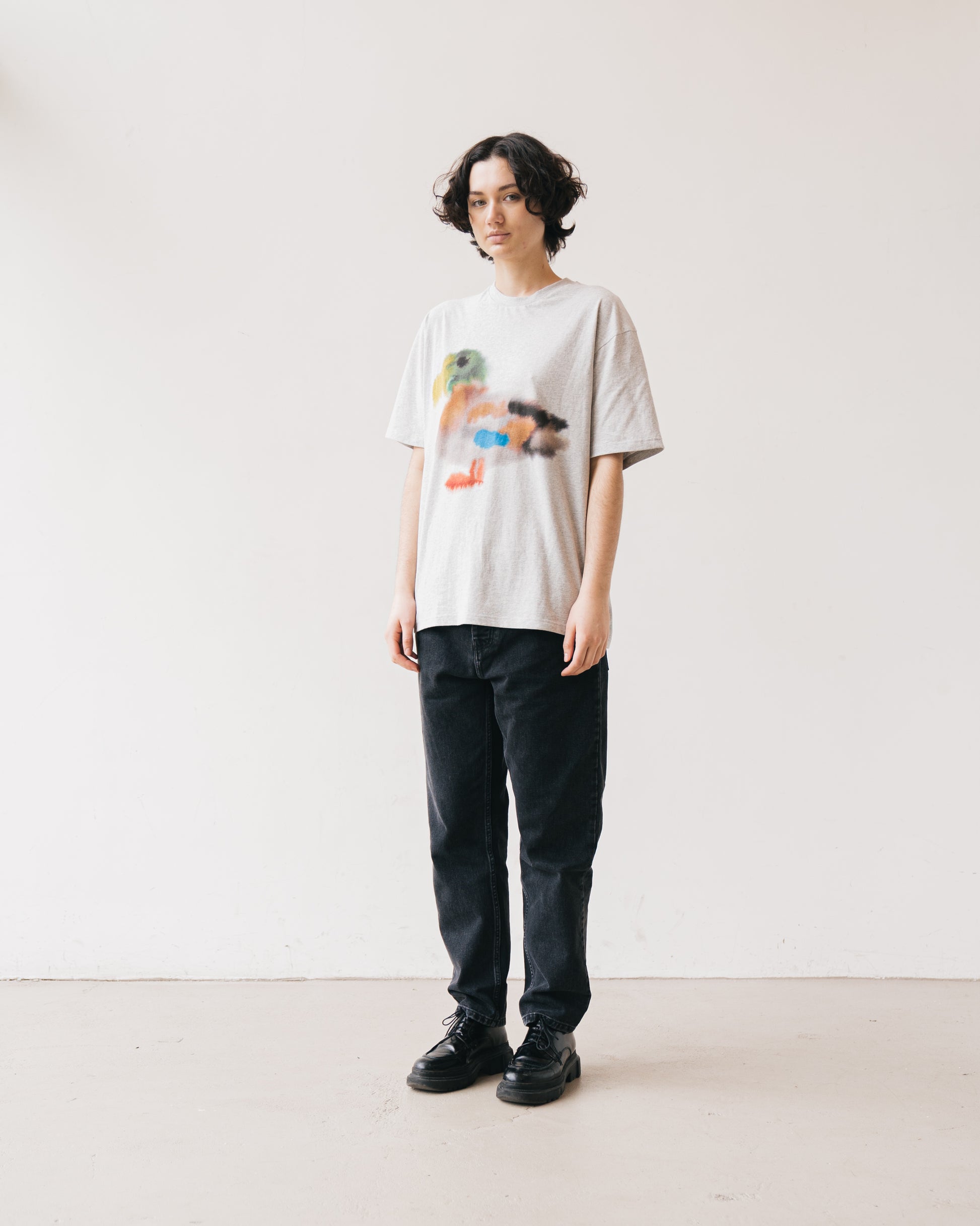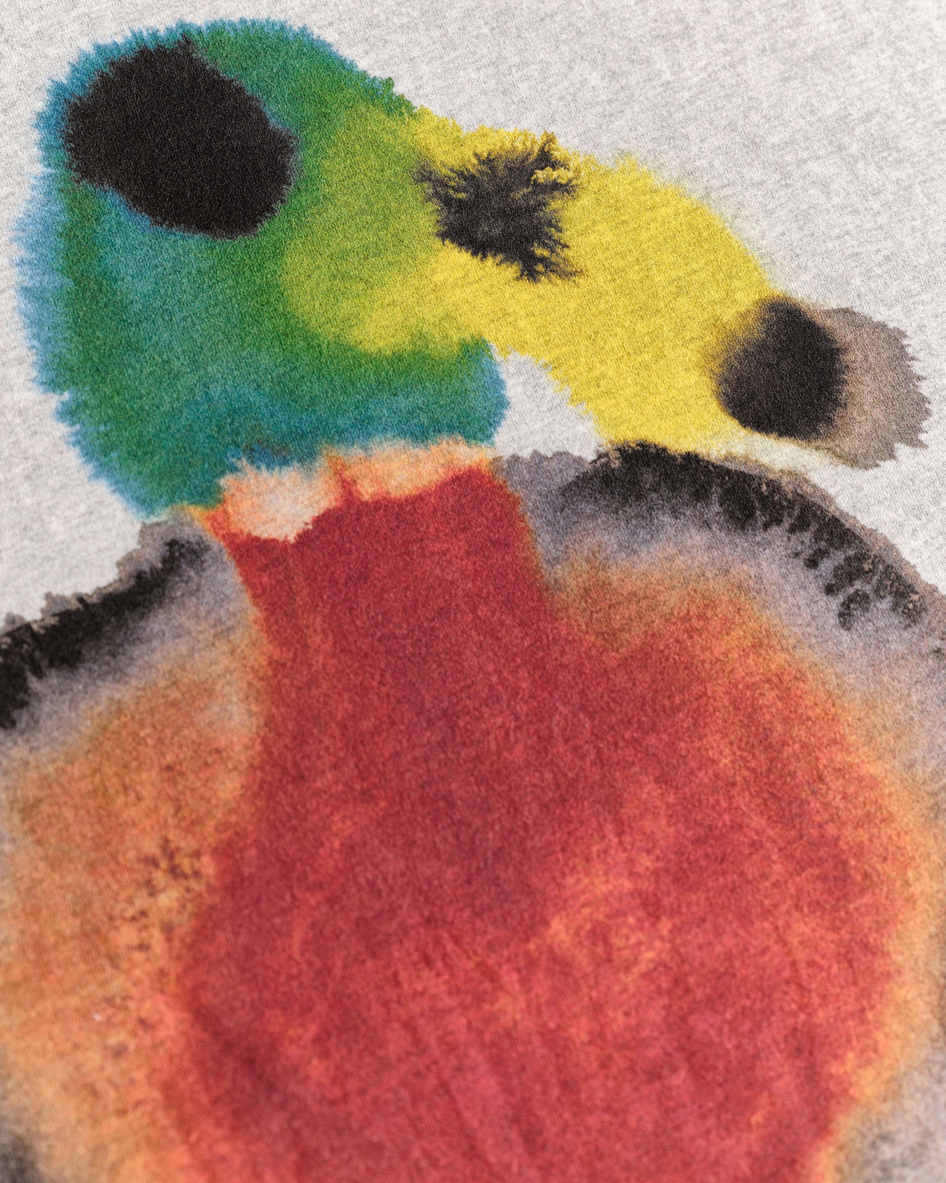 An grey unisex t-shirt featuring a digital print of an Duck on the front and back. The fabric used to make this t-shirt is certified by GOTS.