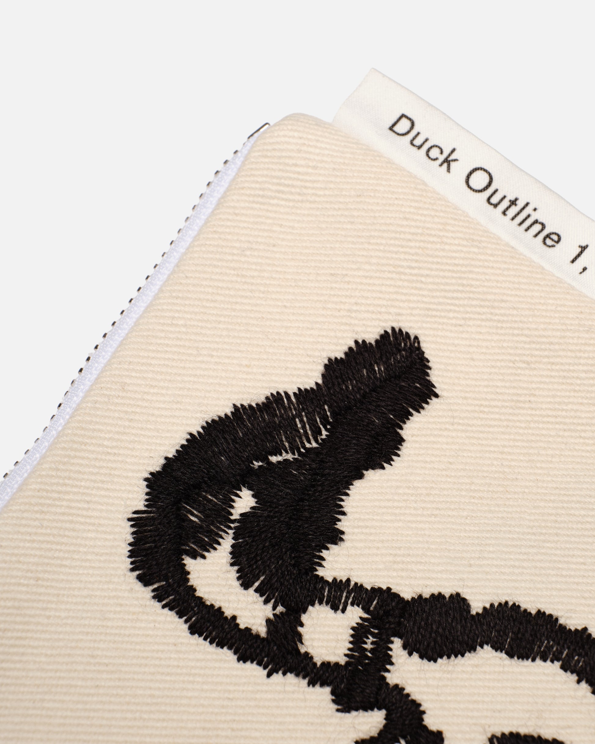 A pencil case with an embroidered Duck on the front and on the back. Featuring a metal zipper to close the case.
