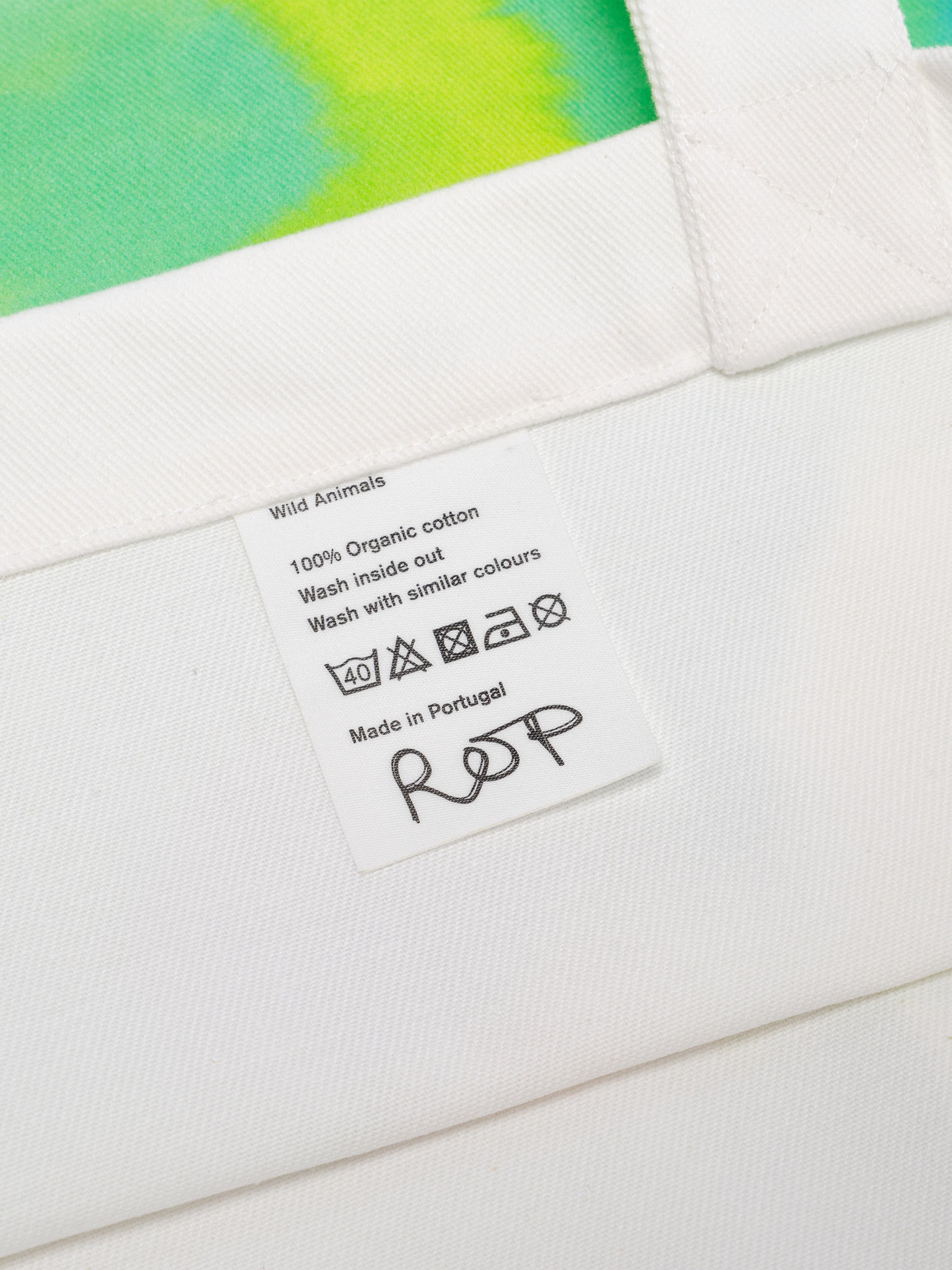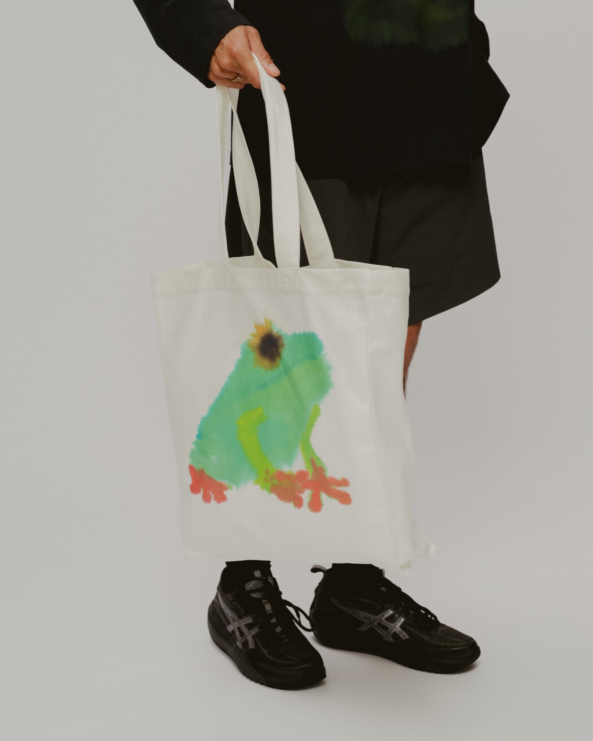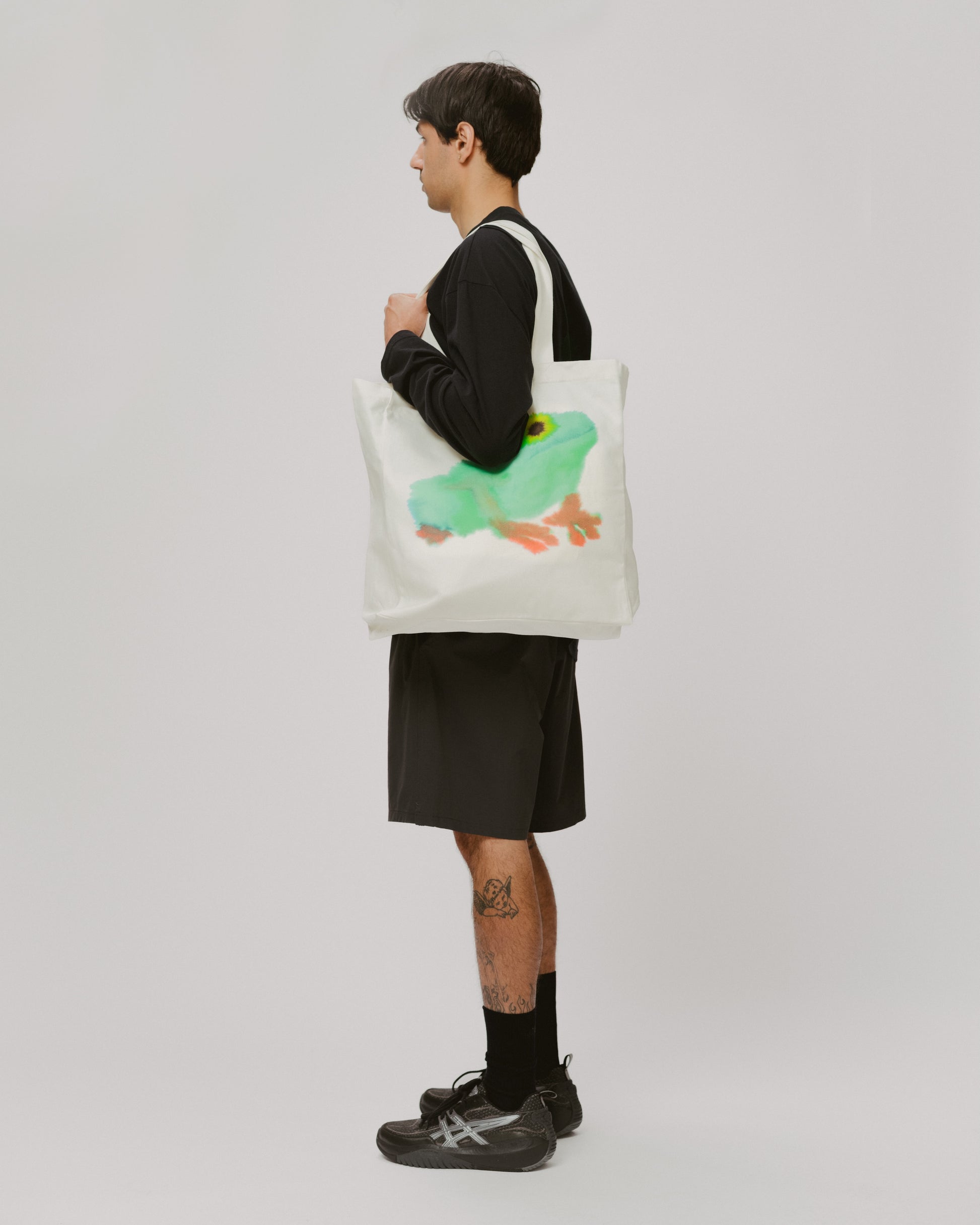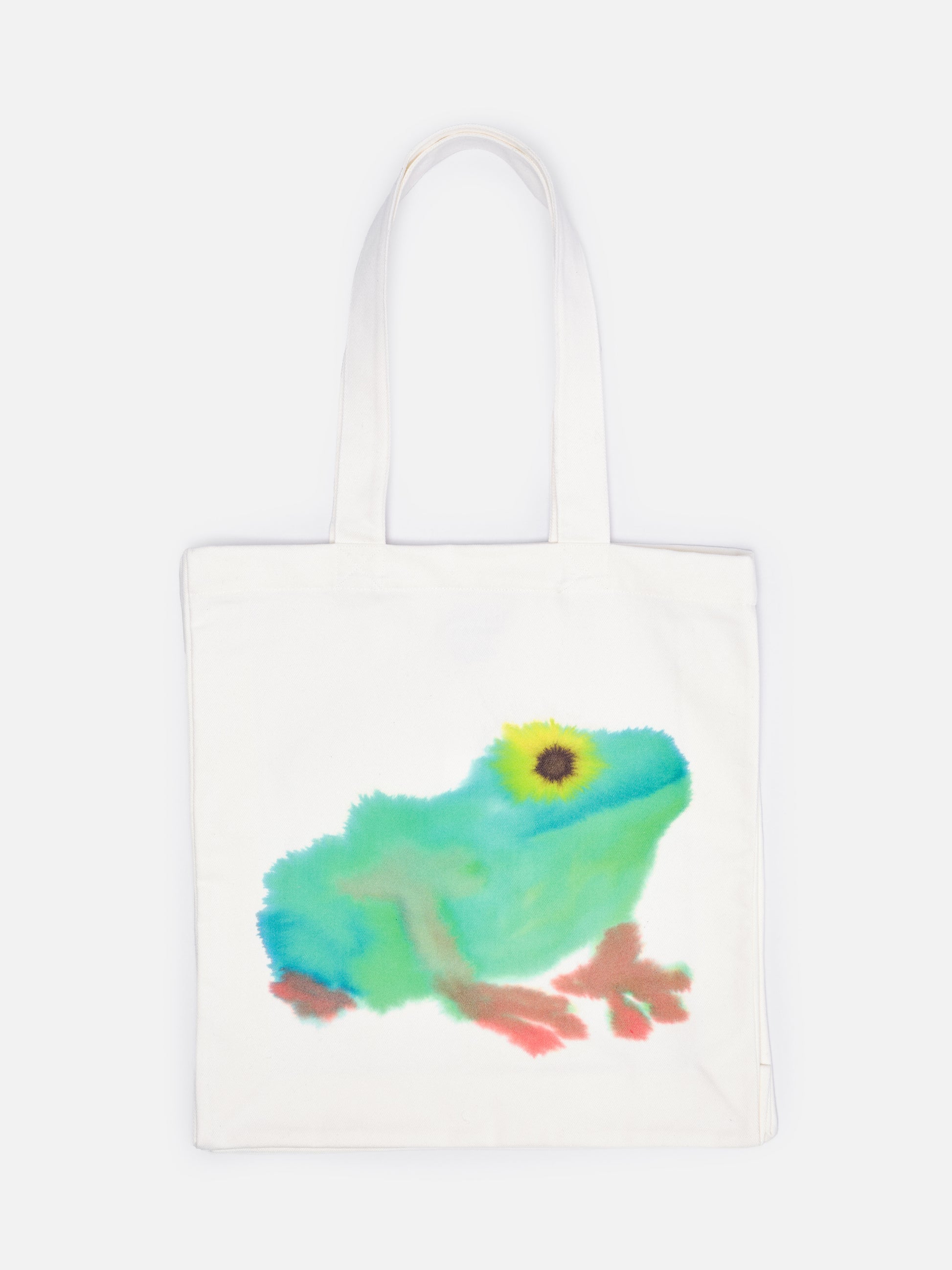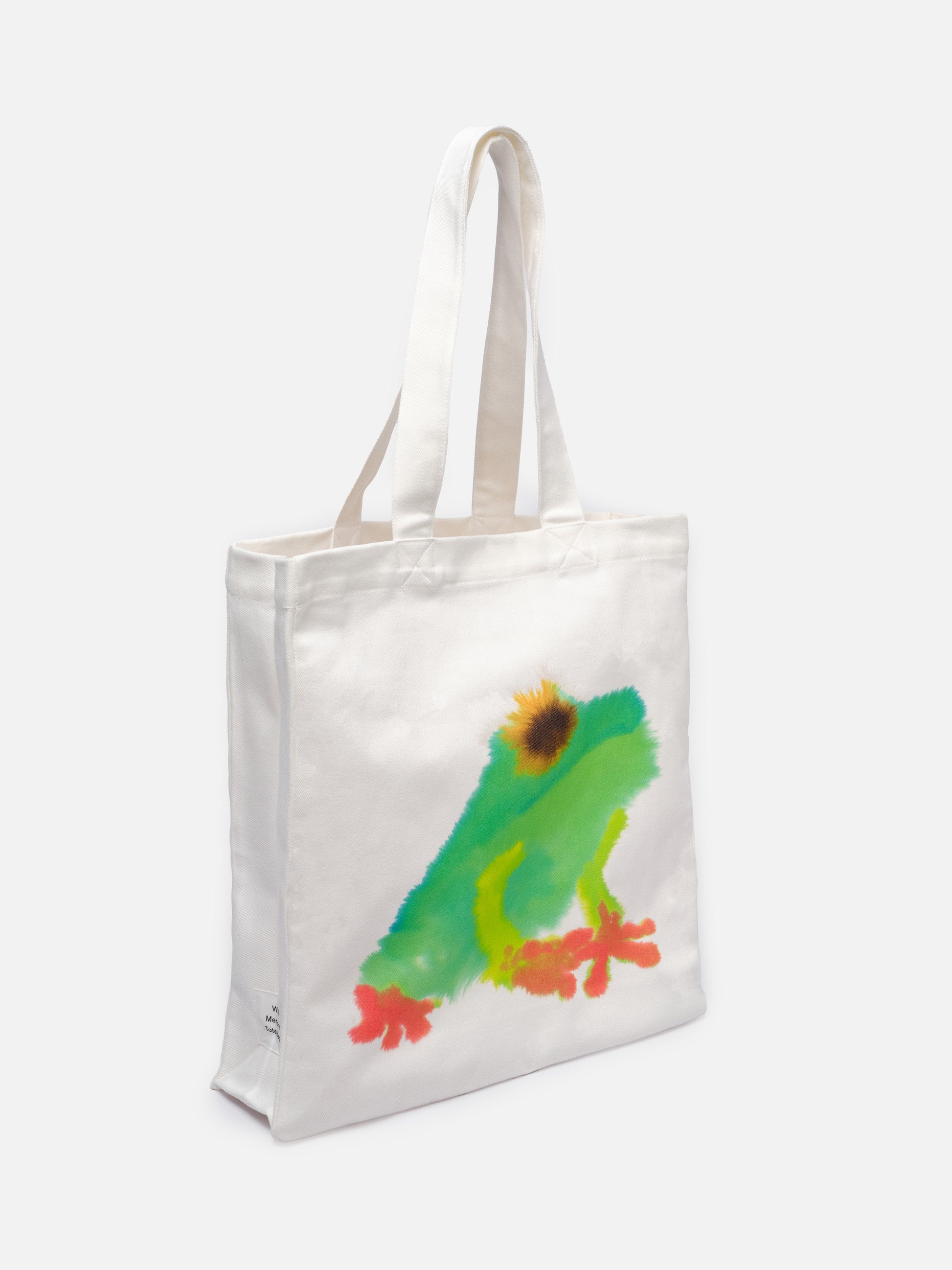 A tote bag featuring a digital print of a Frog on the front and a Frog on the back. The fabric used to make this tote is certified by GOTS.