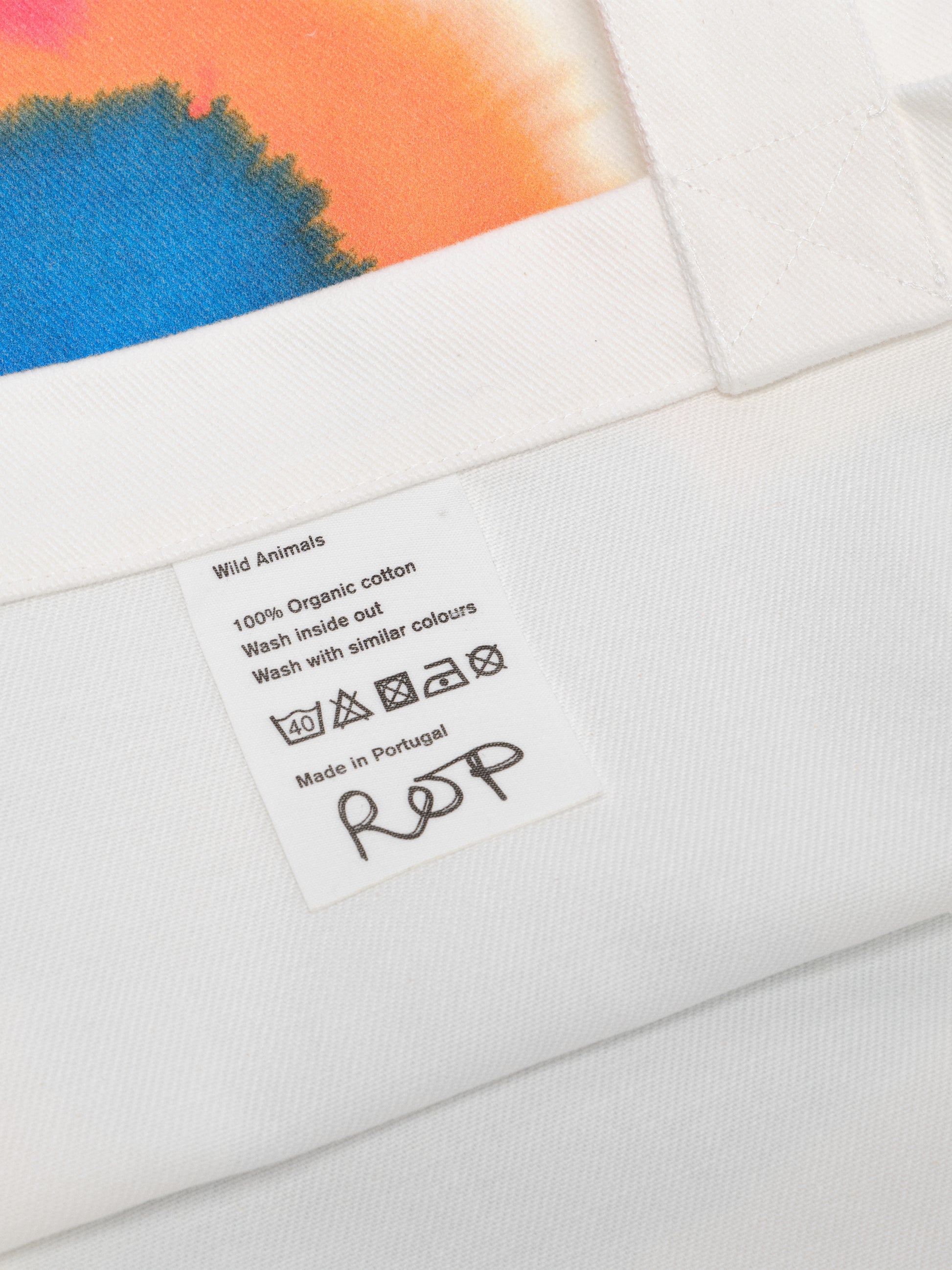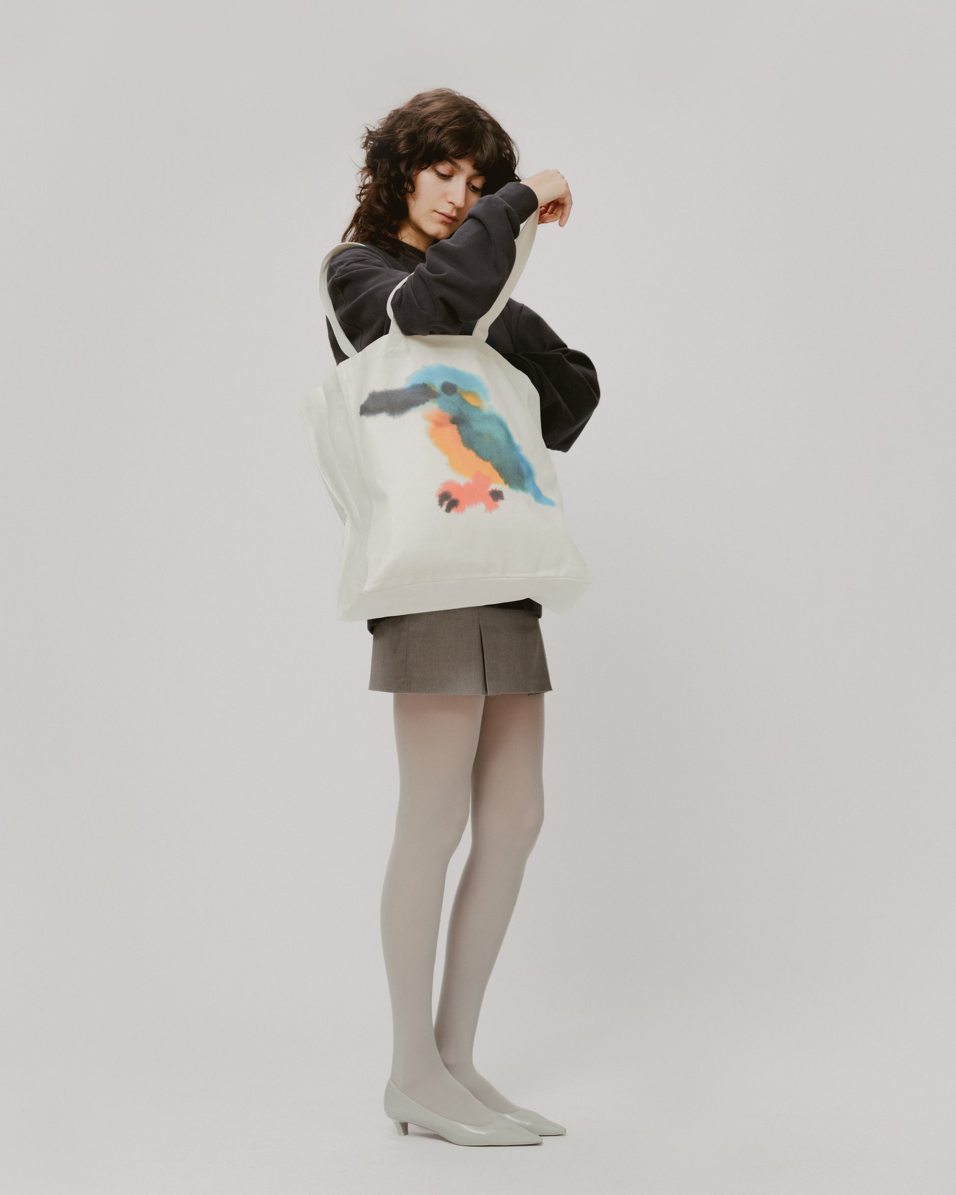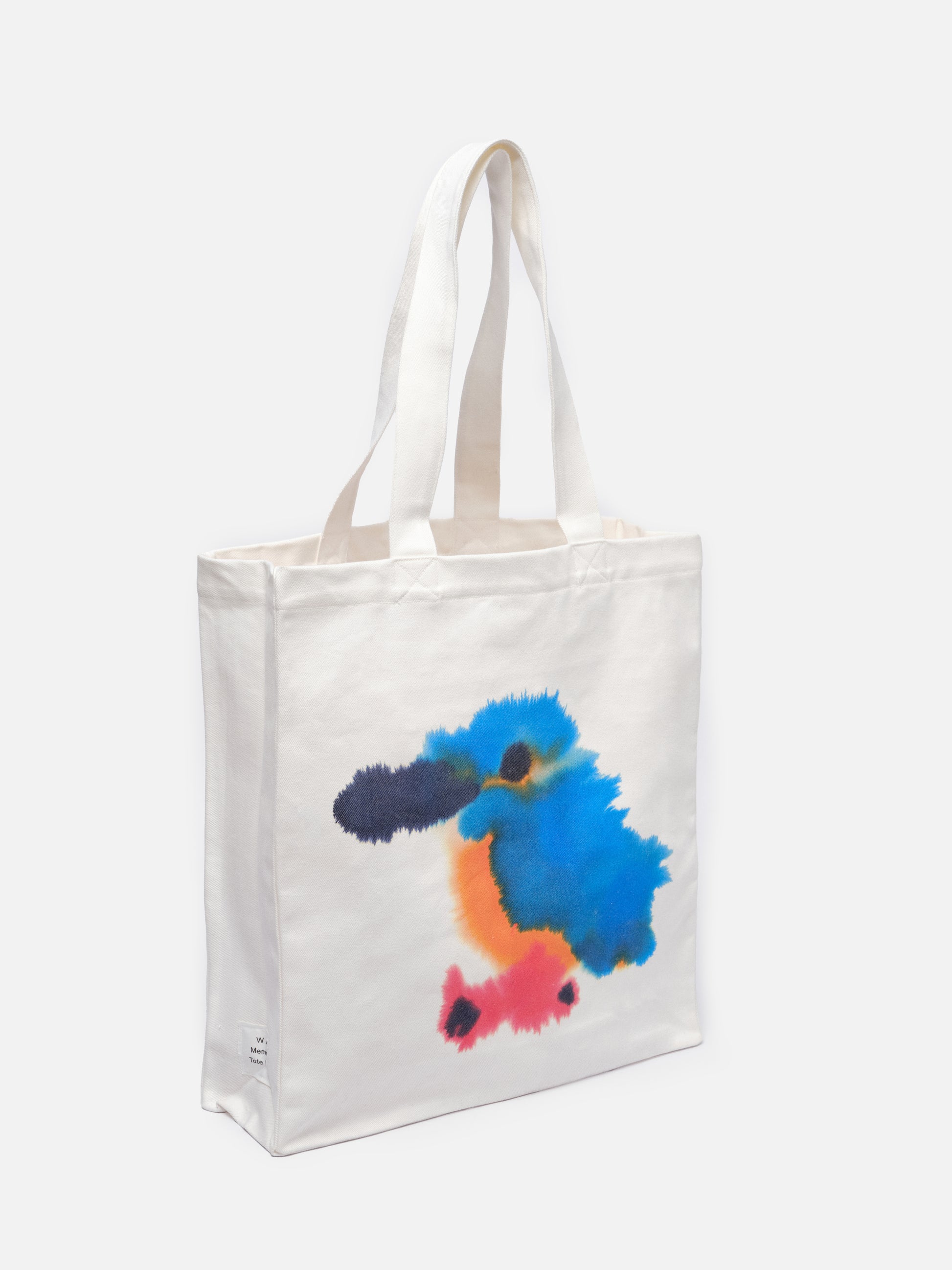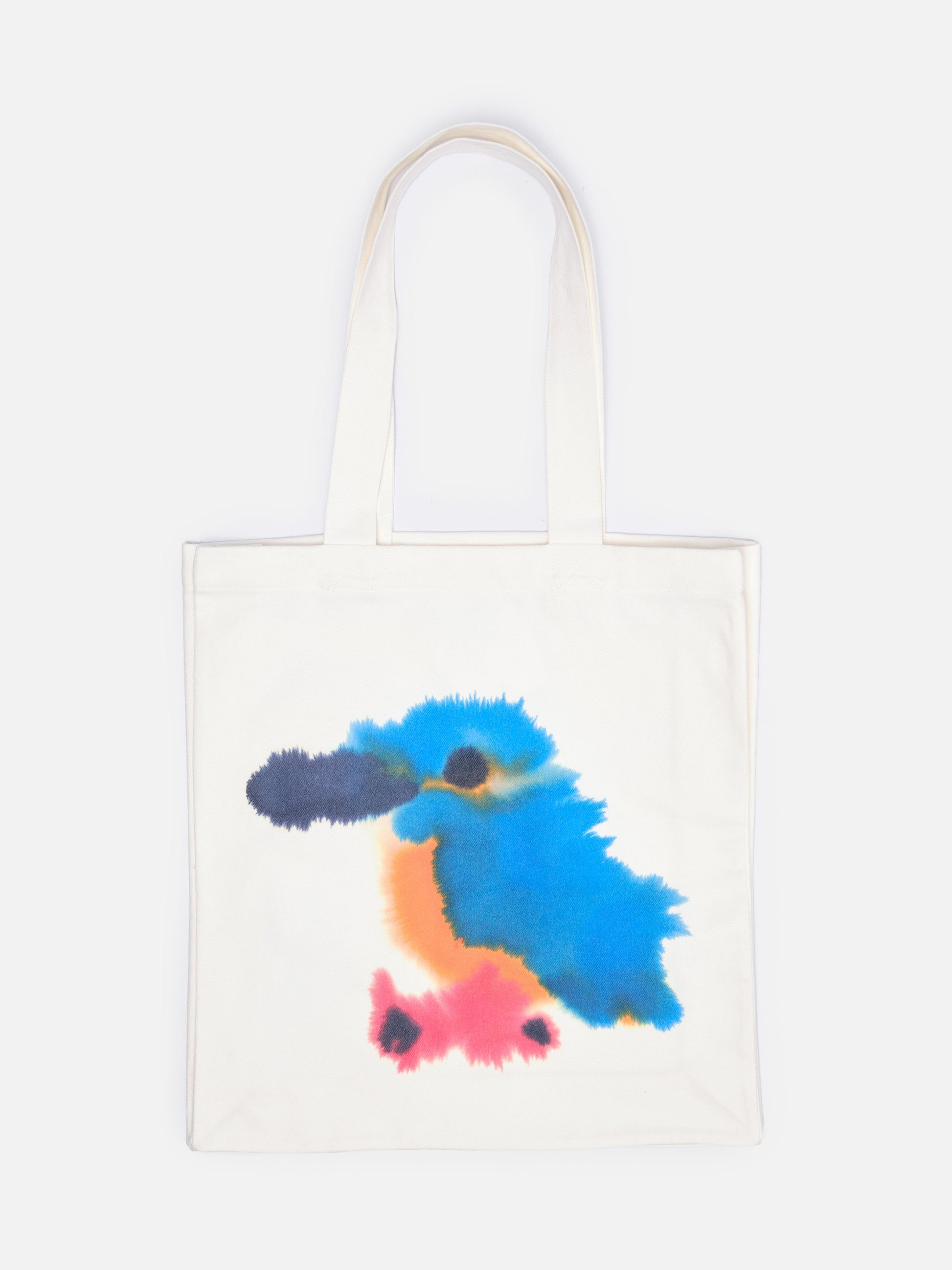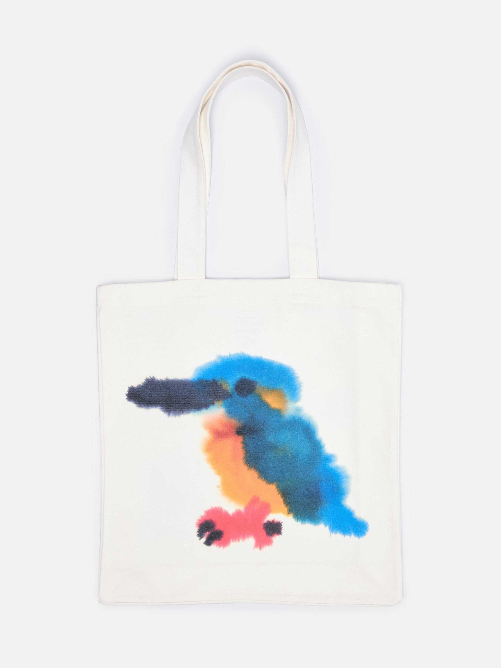 A tote bag featuring a digital print of a Kingfisher on the front and a Kingfisher on the back. The fabric used to make this tote is certified by GOTS.