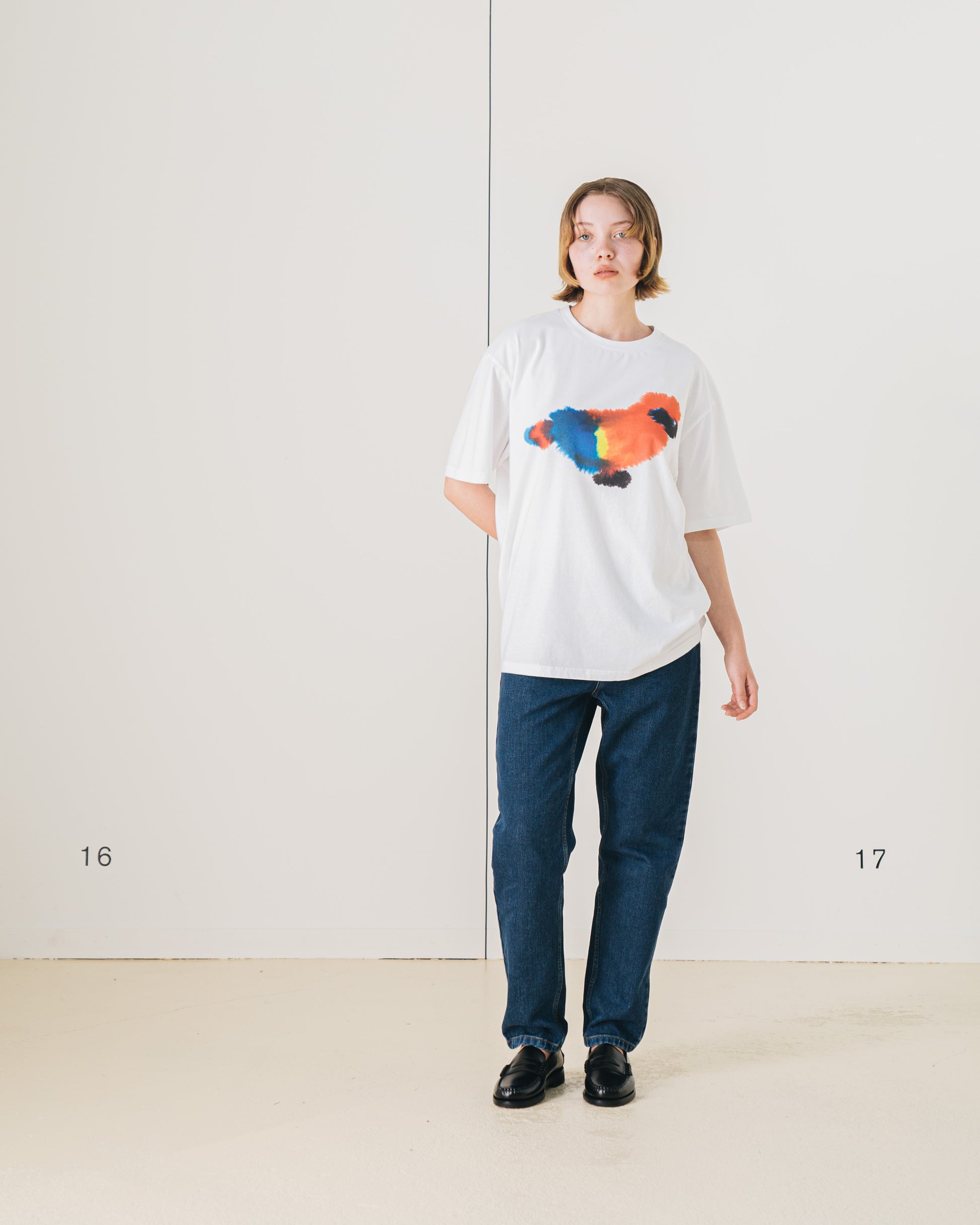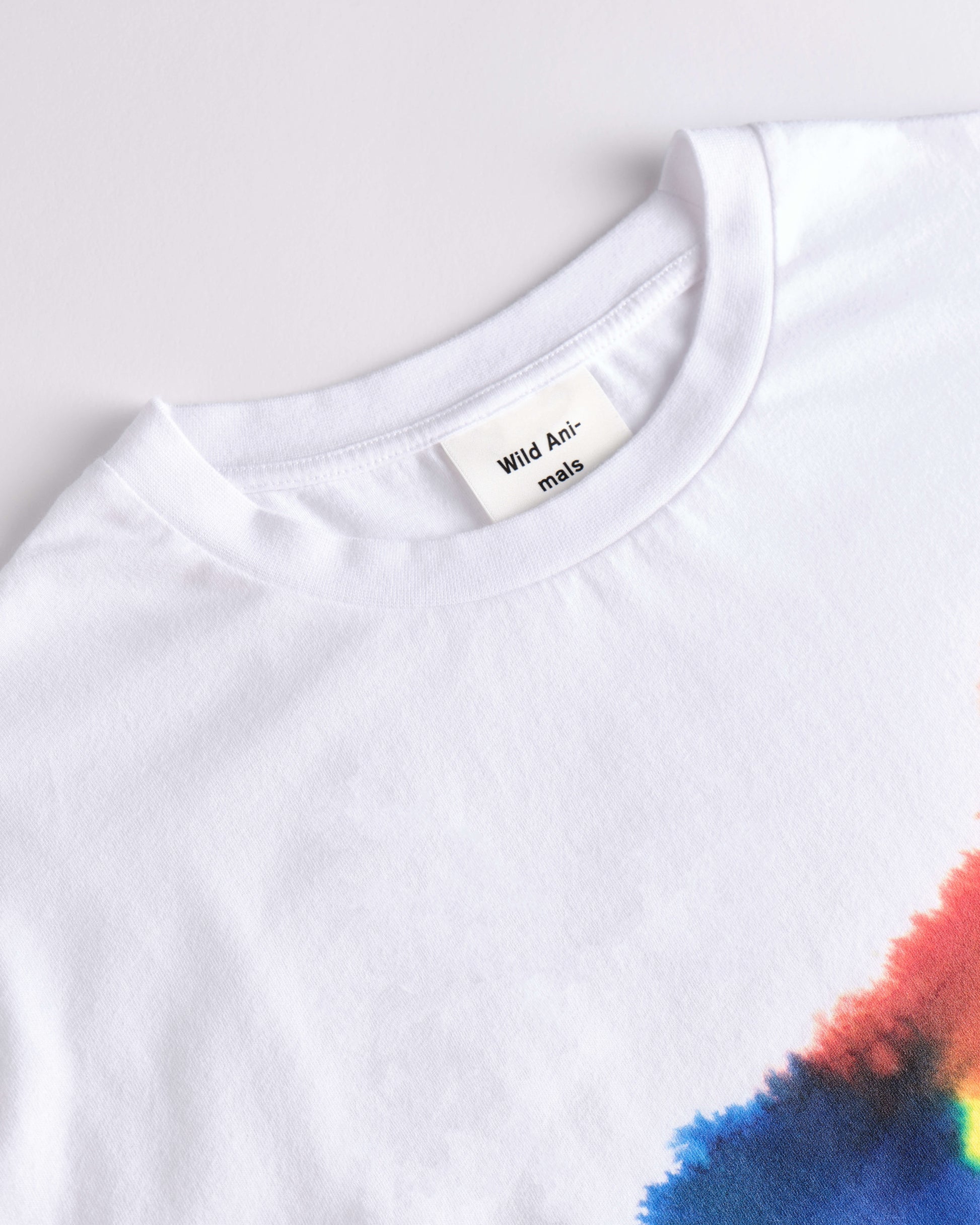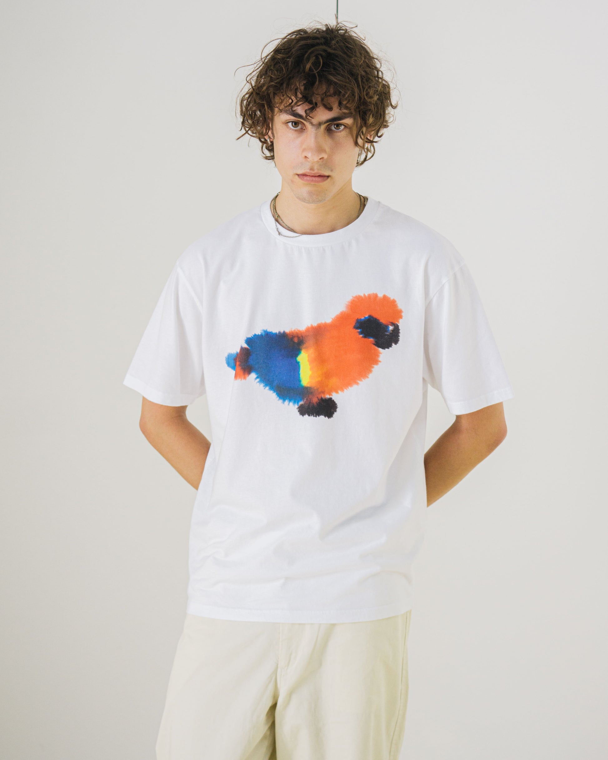 A white unisex t-shirt featuring a print of a Parrot on the front. The fabric used to make this t-shirt is certified by GOTS. Tome is 1.89 cm and wears a size medium. Joy is 1.76 cm and wears a size medium.