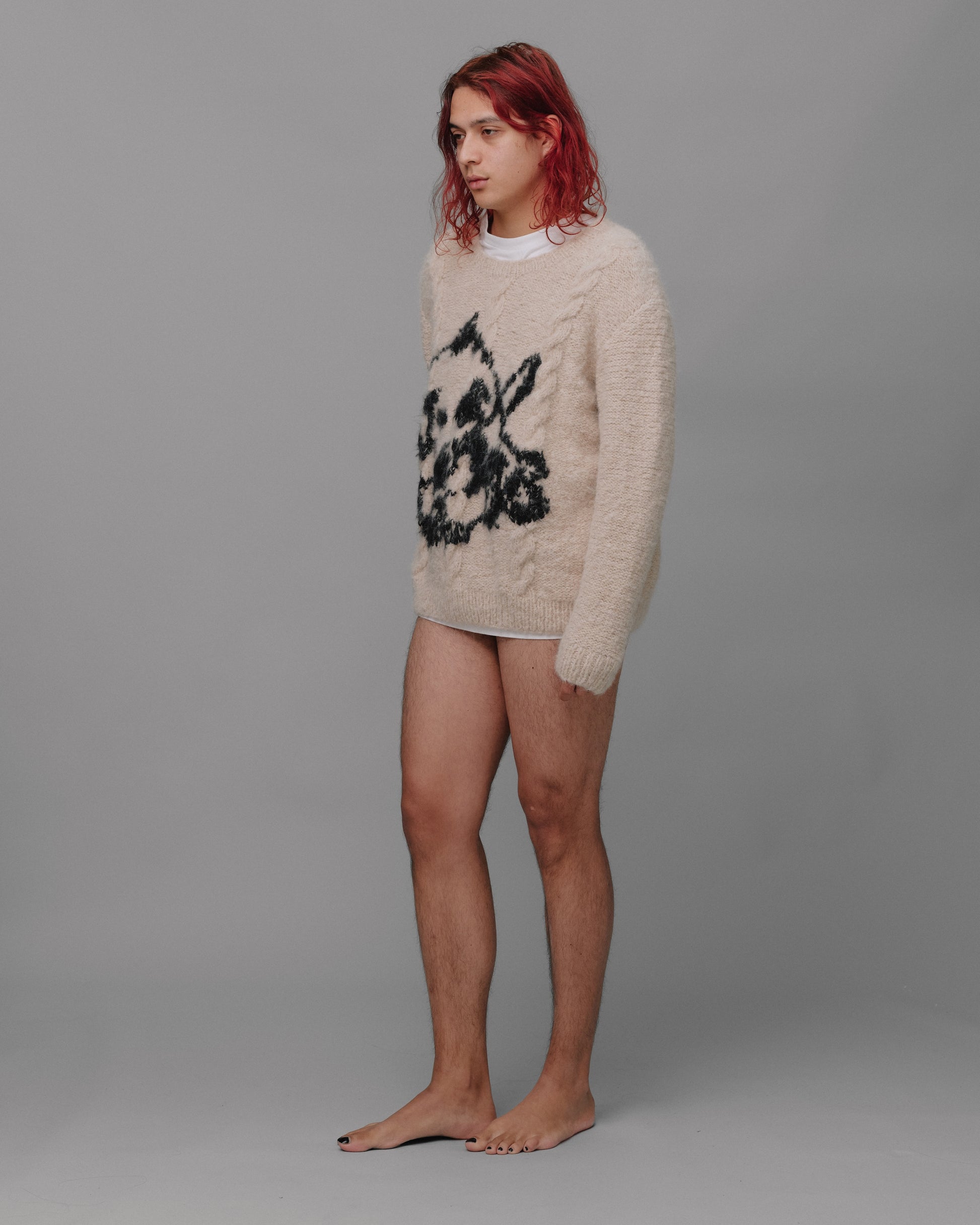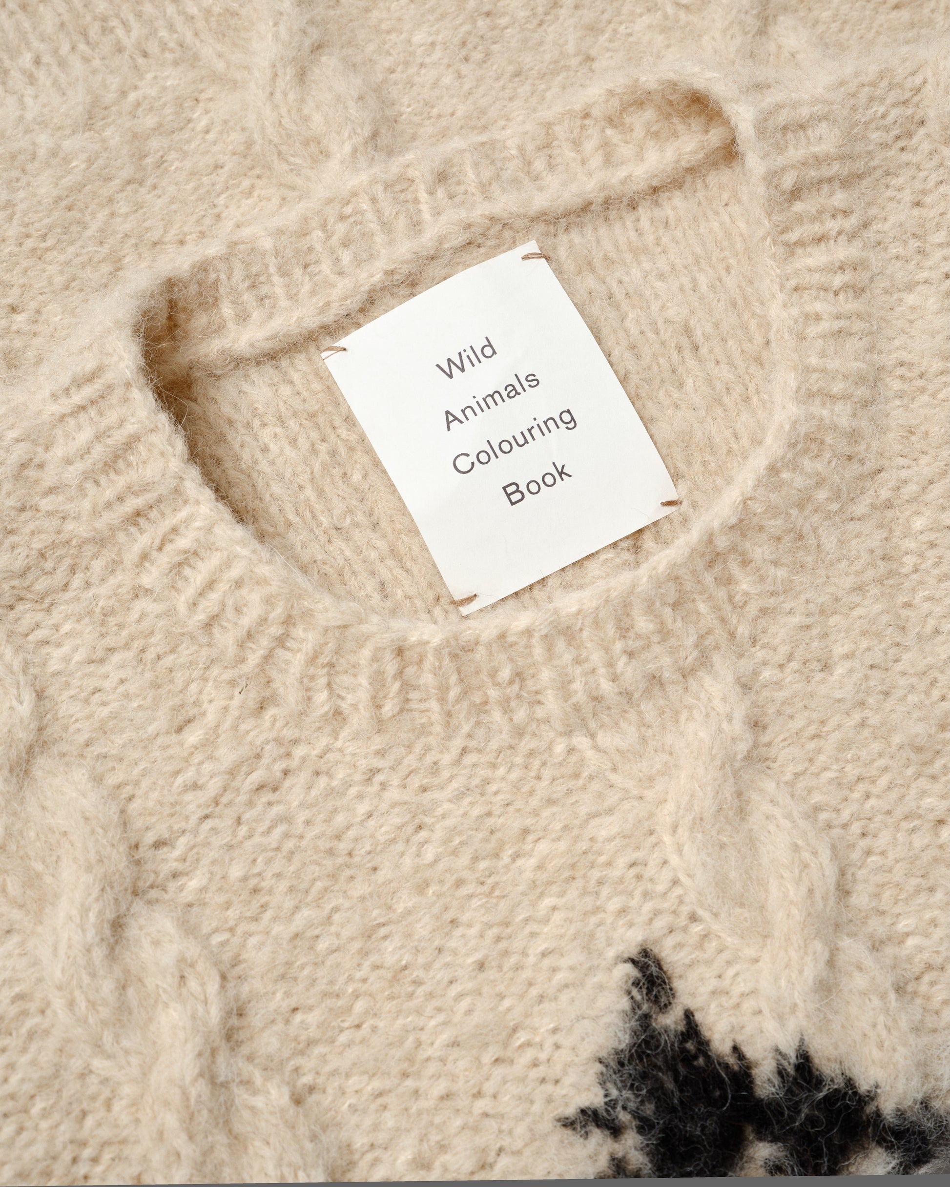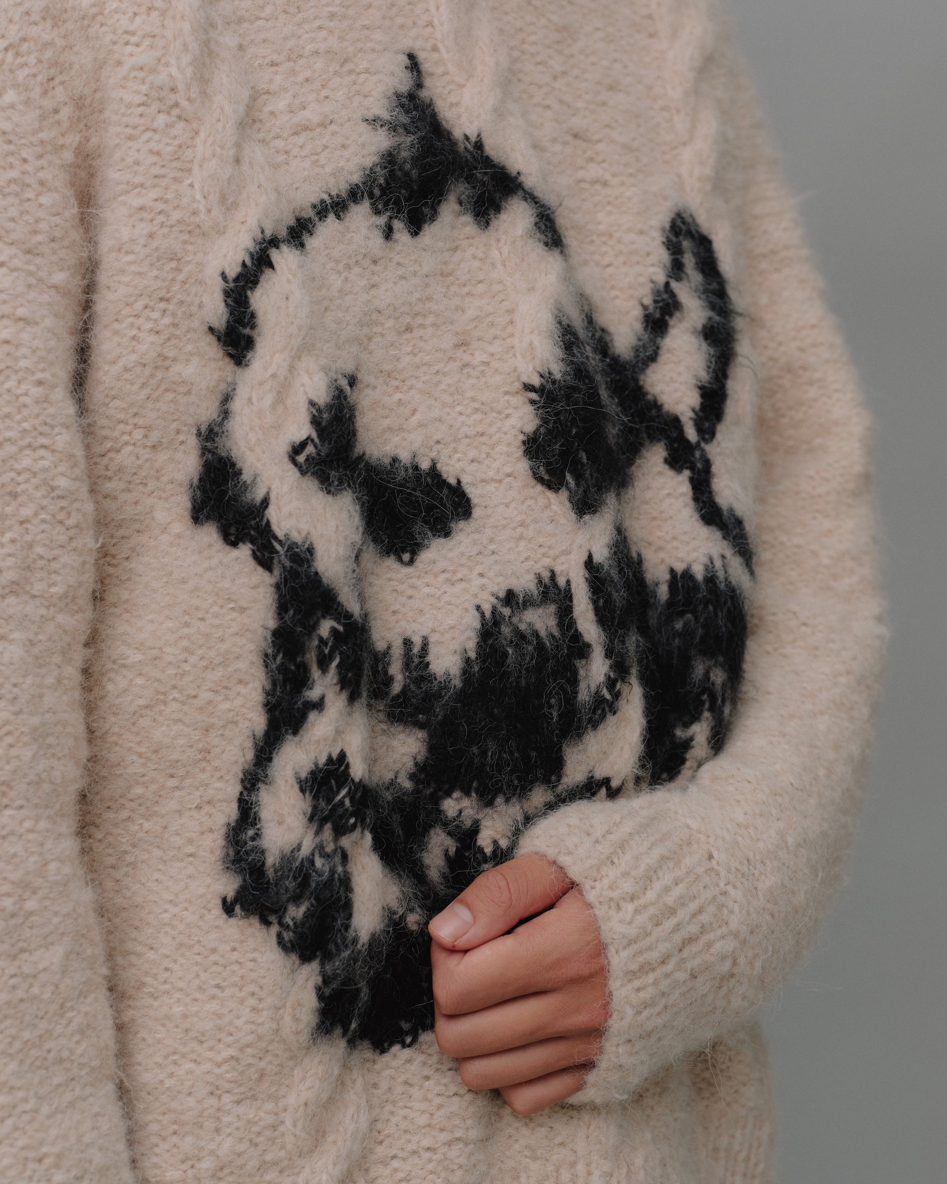 Unisex cable knit crewneck based on the paintings of Rop van Mierlo. Each garment from this collection is hand knitted in Bosnia, using traditional techniques by a team of 30 craftswomen.