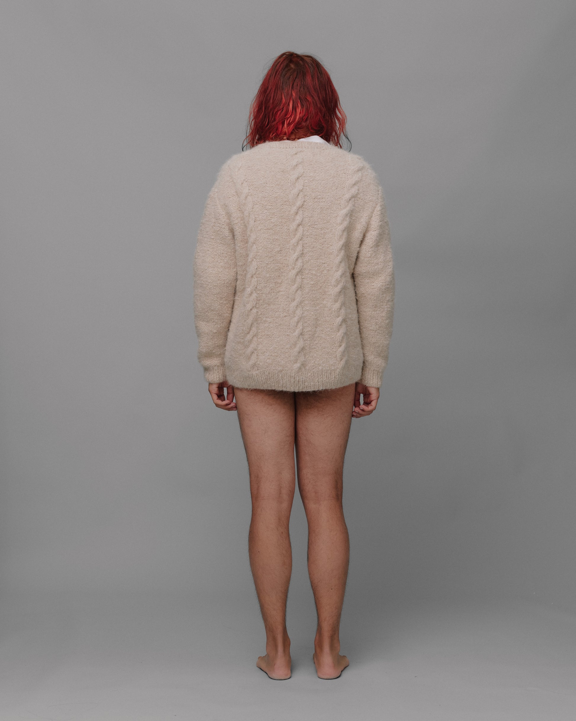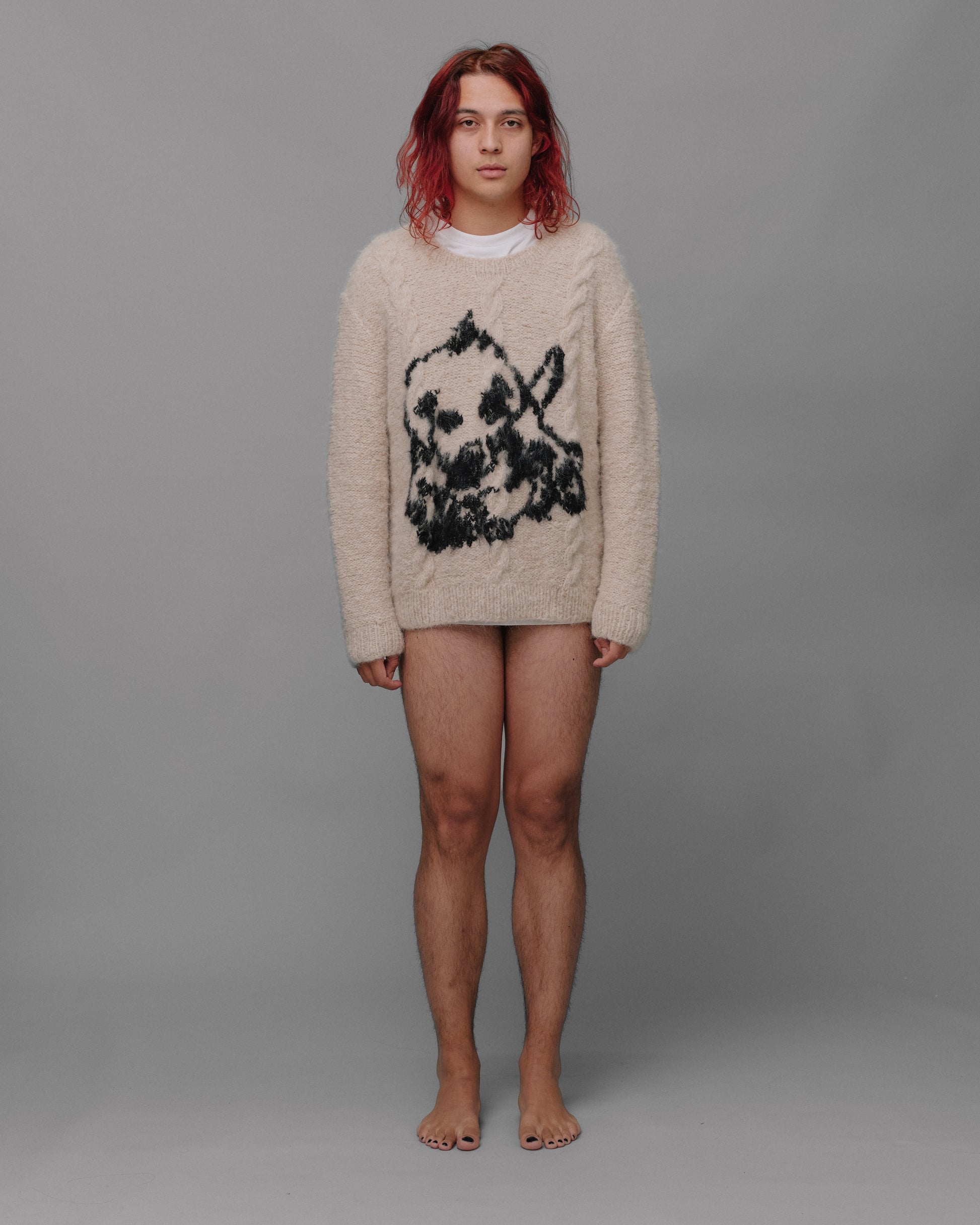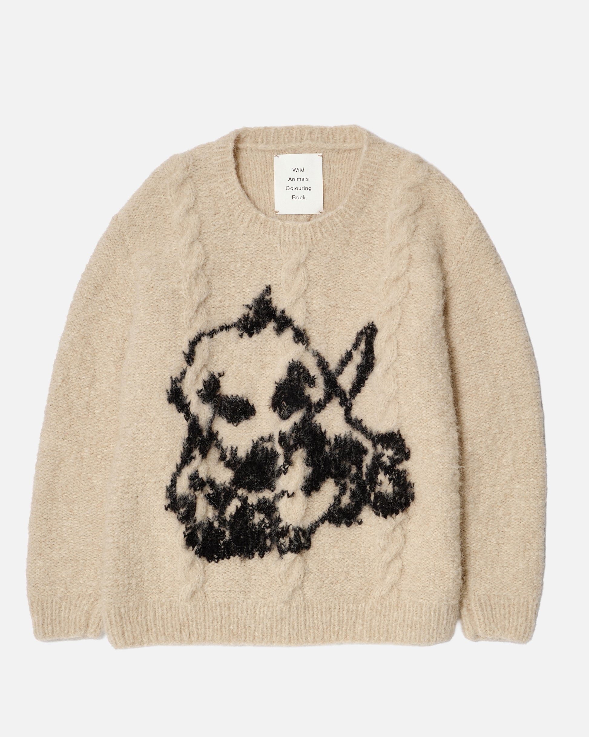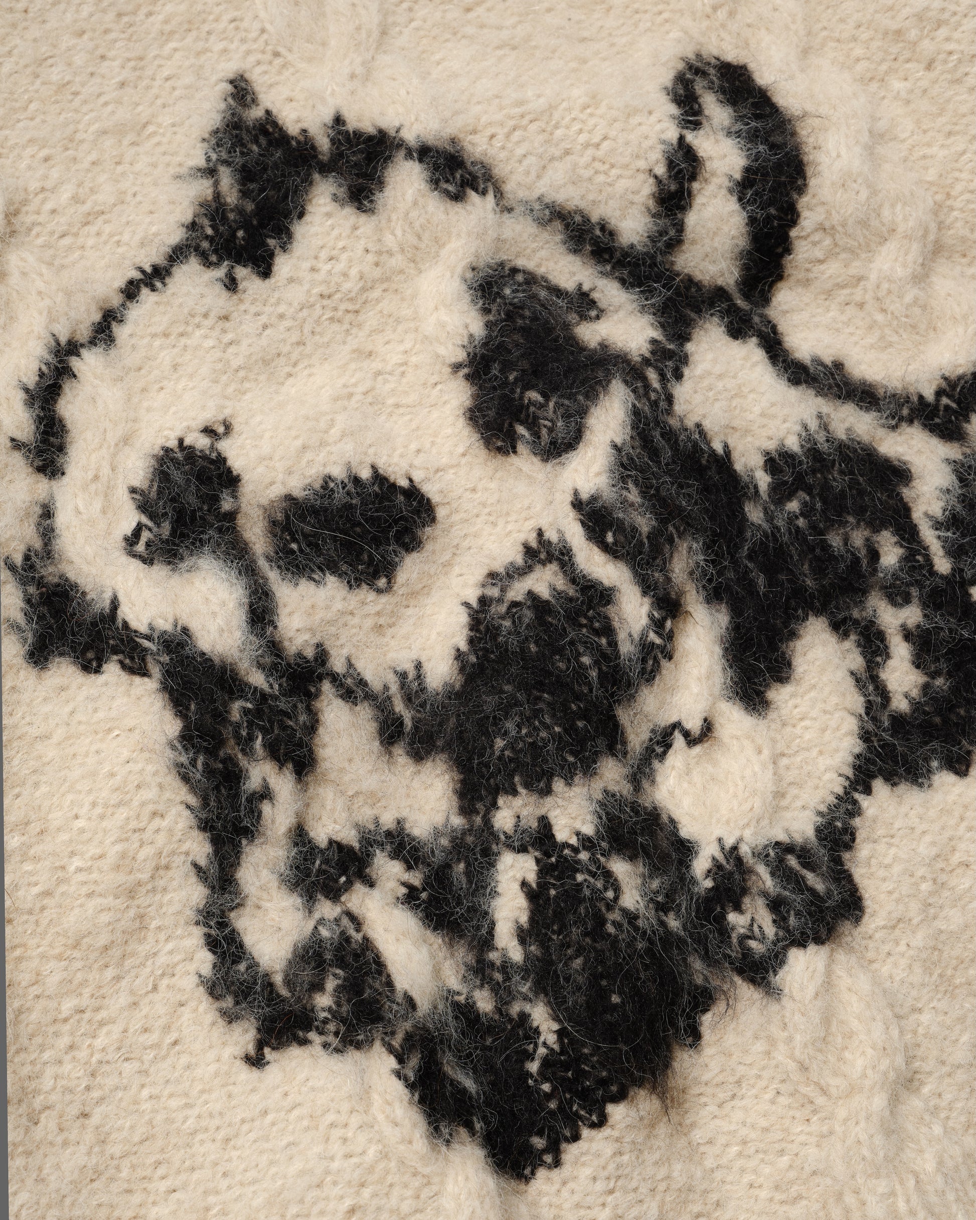 Unisex cable knit crewneck based on the paintings of Rop van Mierlo. Each garment from this collection is hand knitted in Bosnia, using traditional techniques by a team of 30 craftswomen.