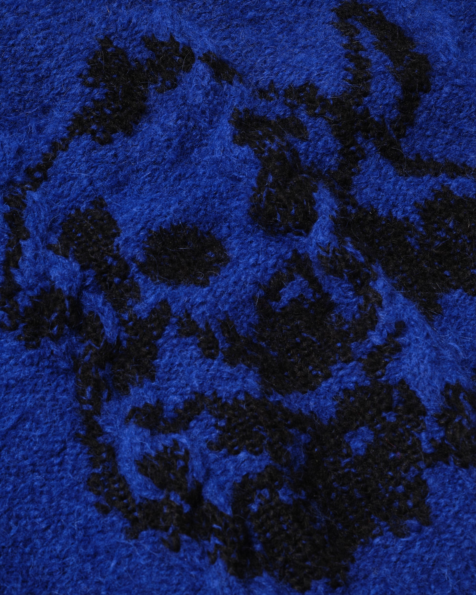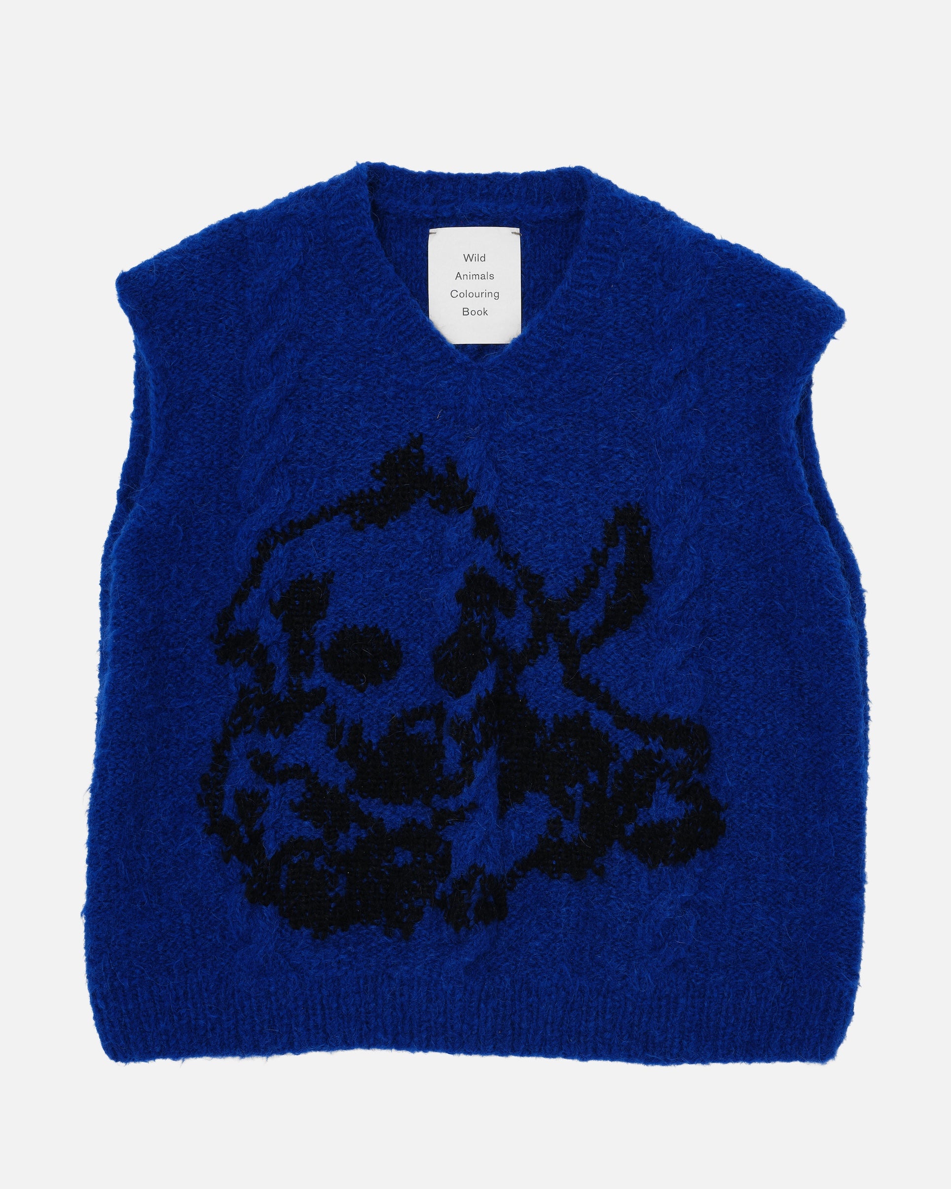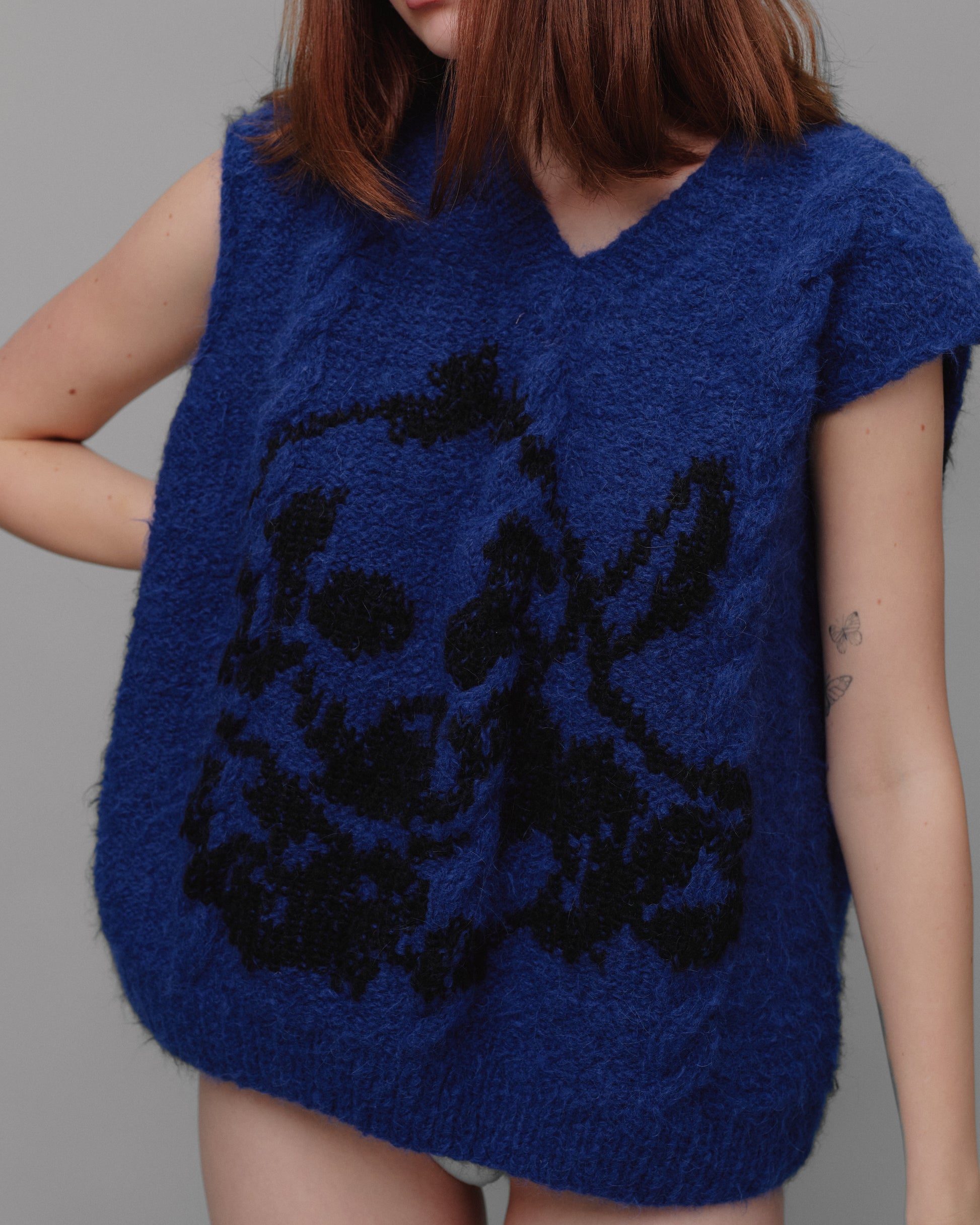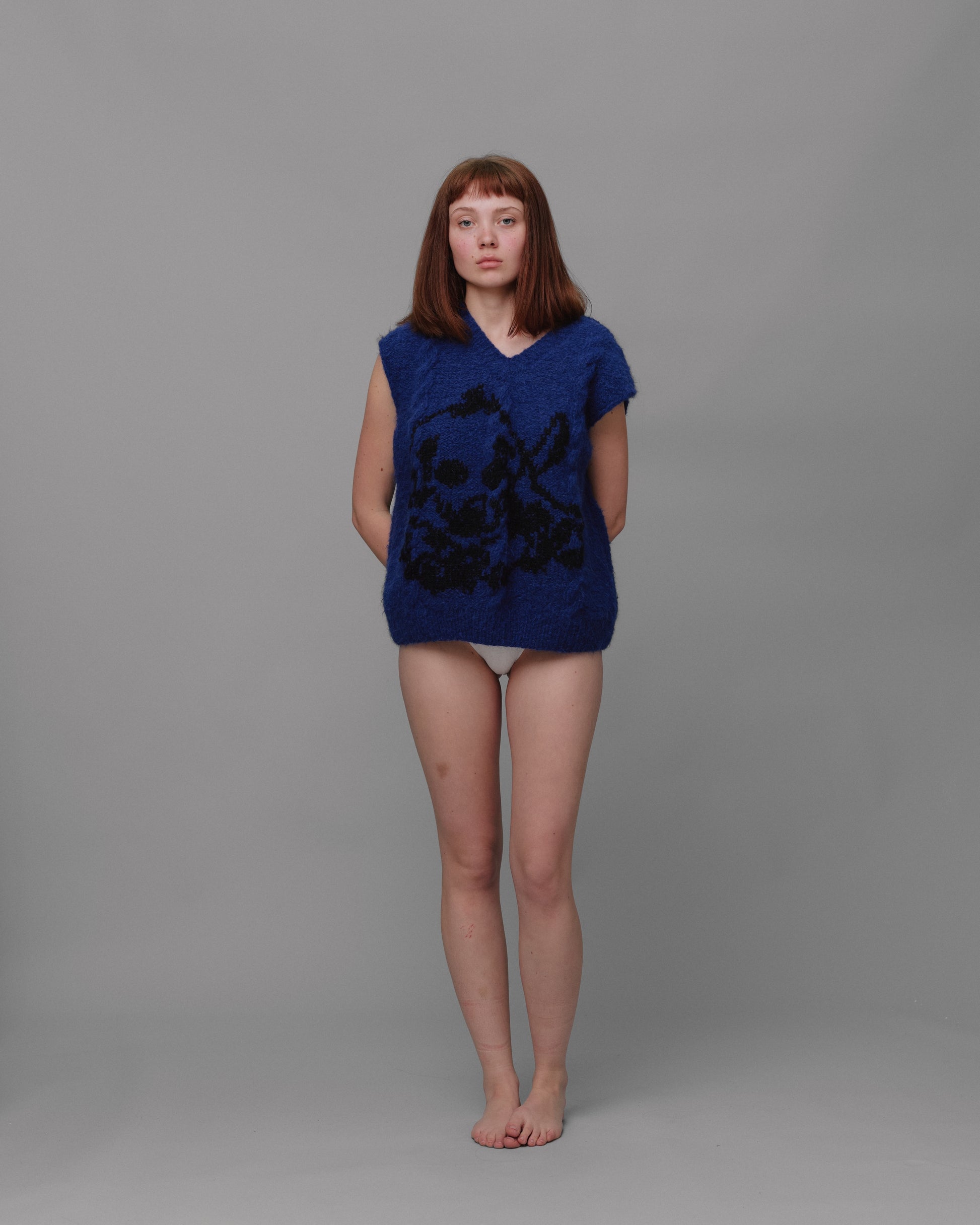 Unisex blue vest based on the pattern paintings of Rop van Mierlo. Each garment from this collection is hand knitted in Bosnia, using traditional techniques by a team of 30 craftswomen.