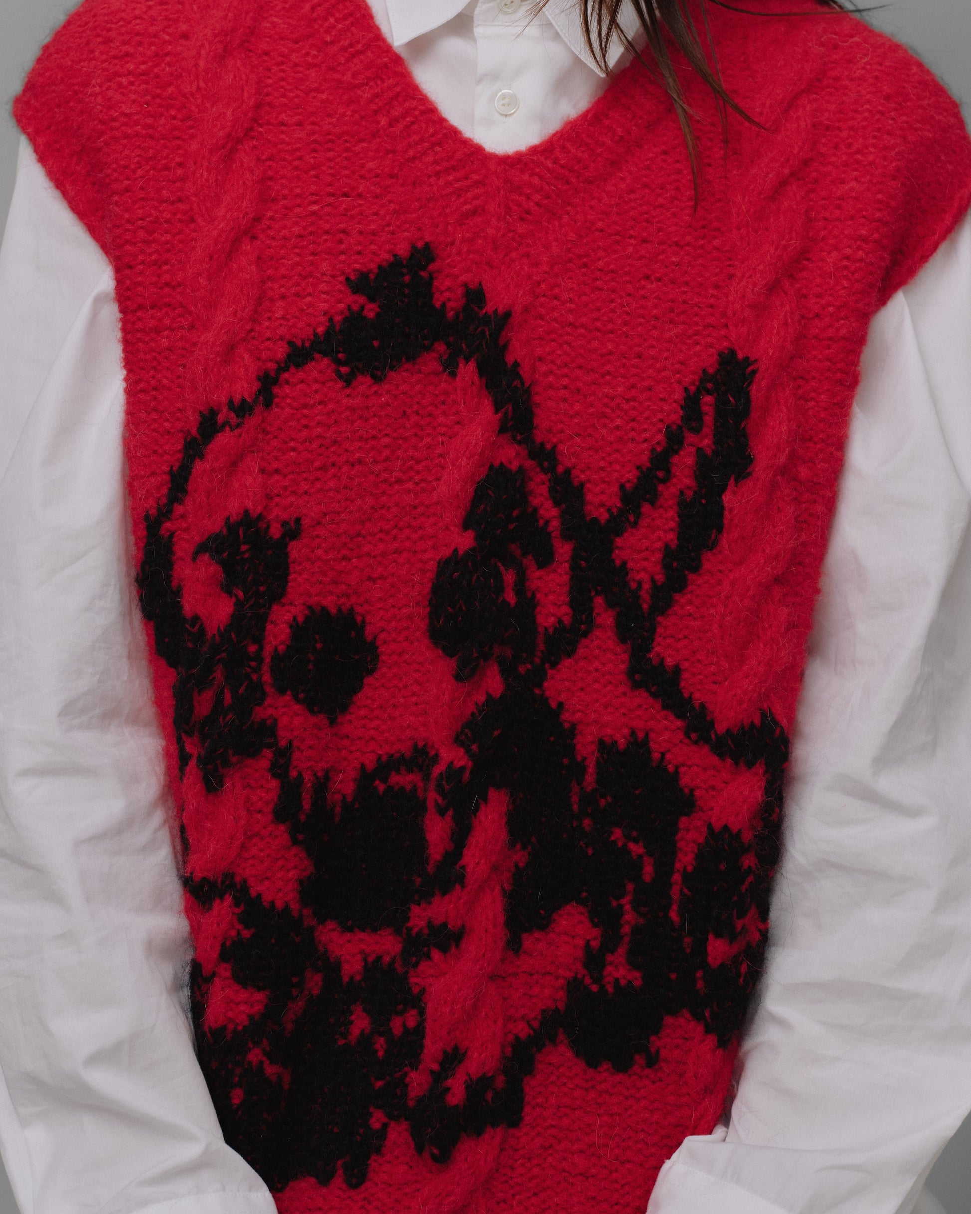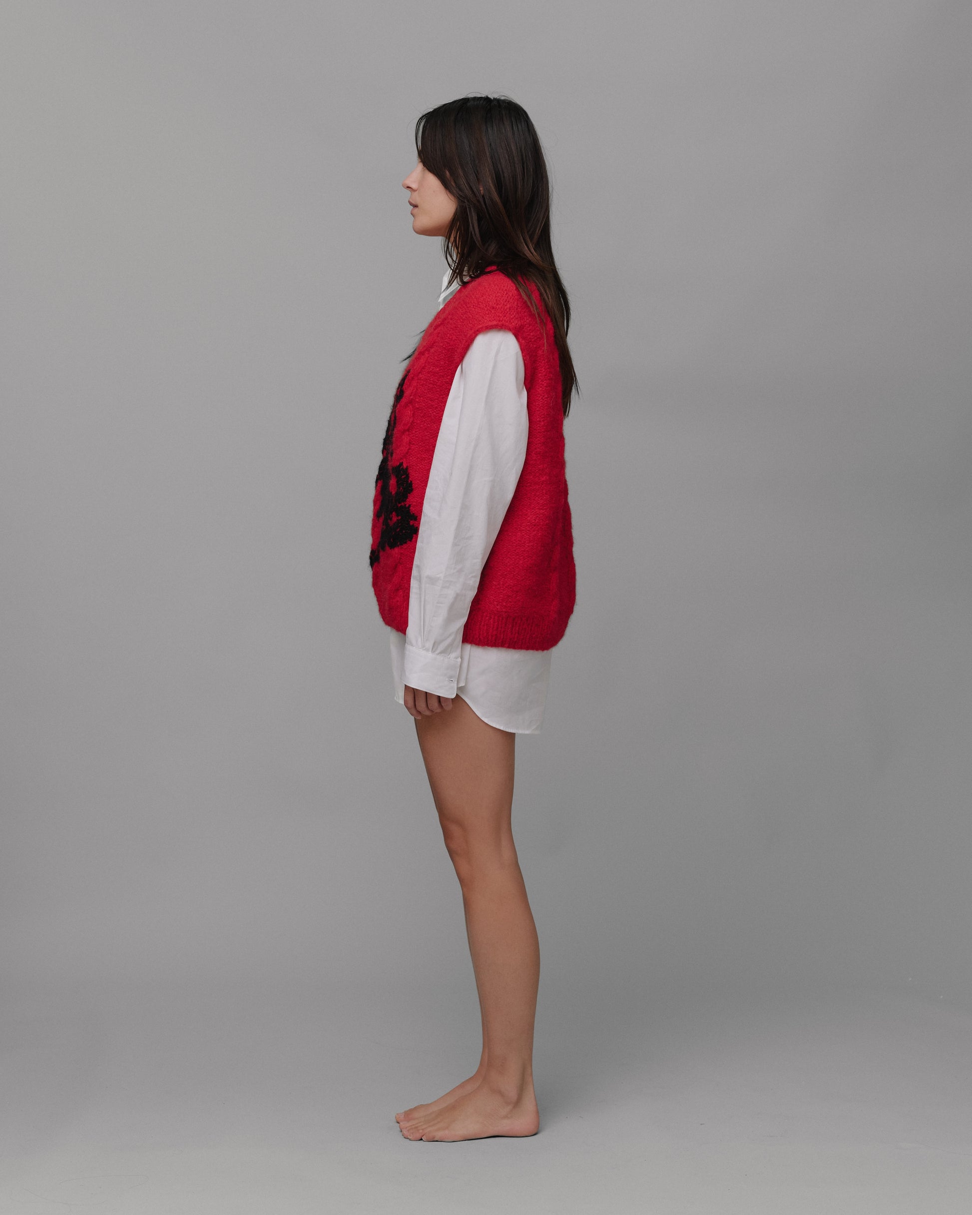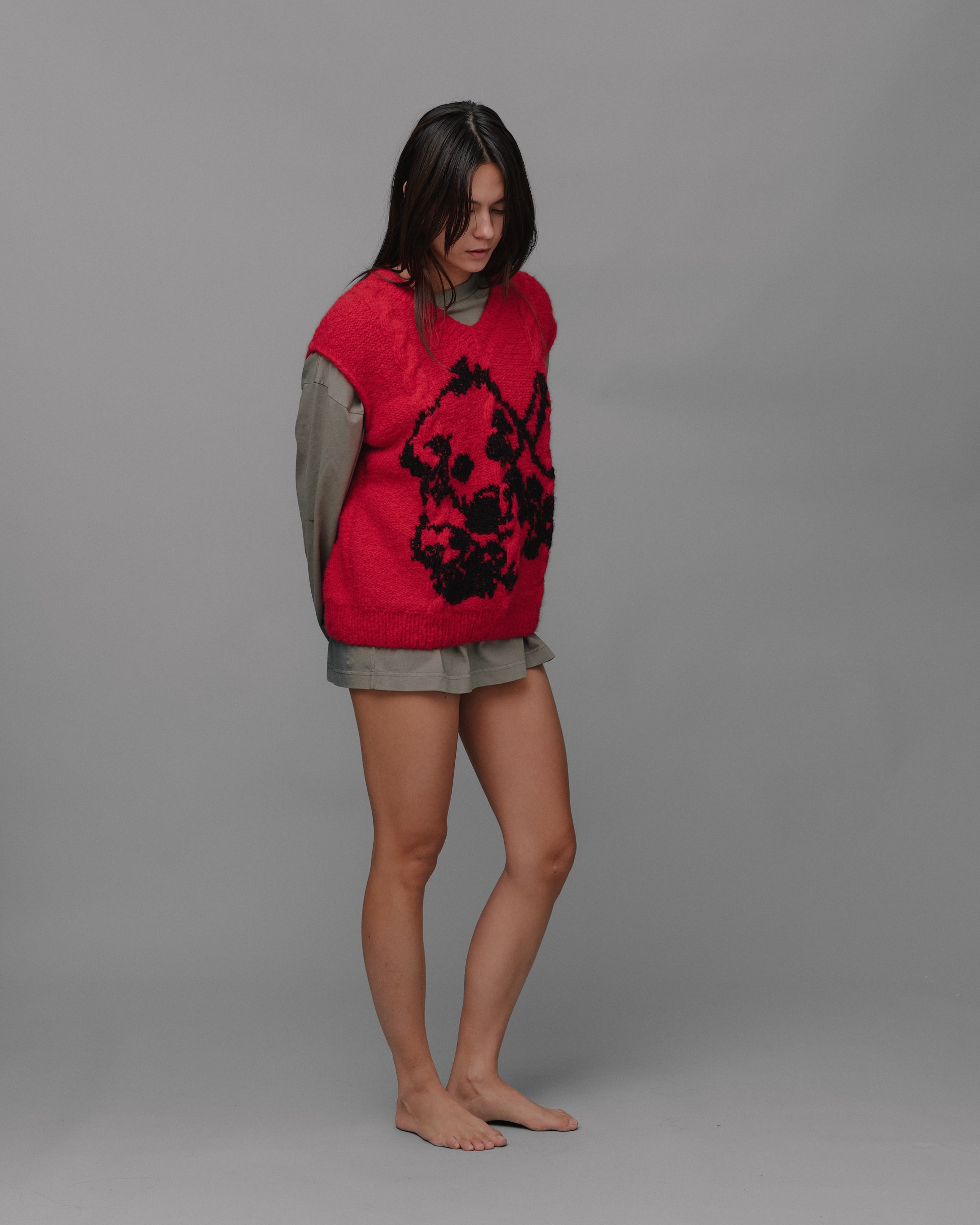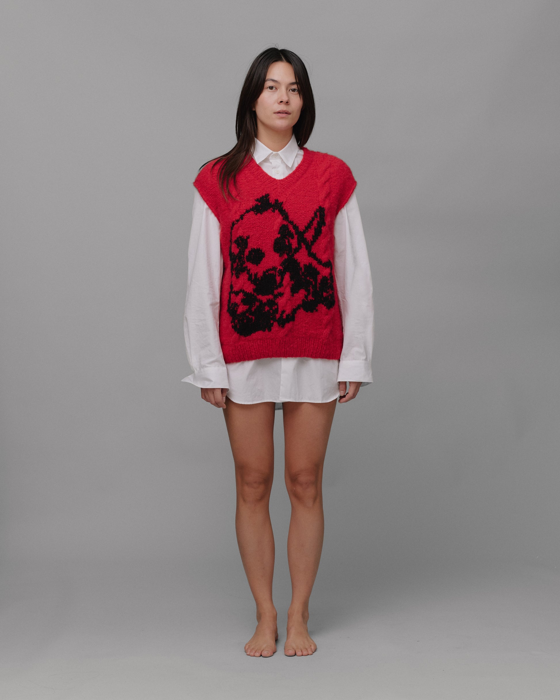 Unisex red vest based on the pattern paintings of Rop van Mierlo. Each garment from this collection is hand knitted in Bosnia, using traditional techniques by a team of 30 craftswomen.