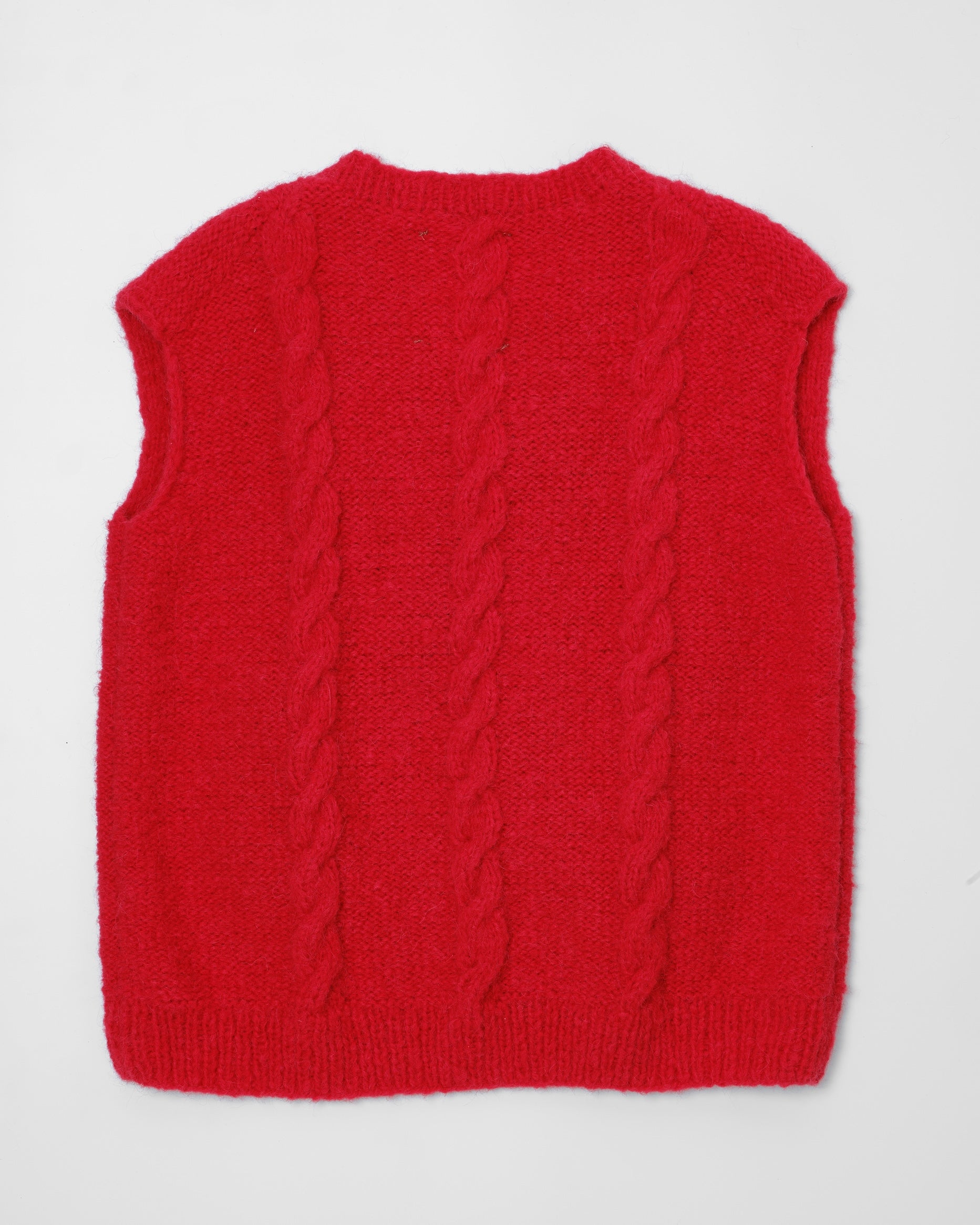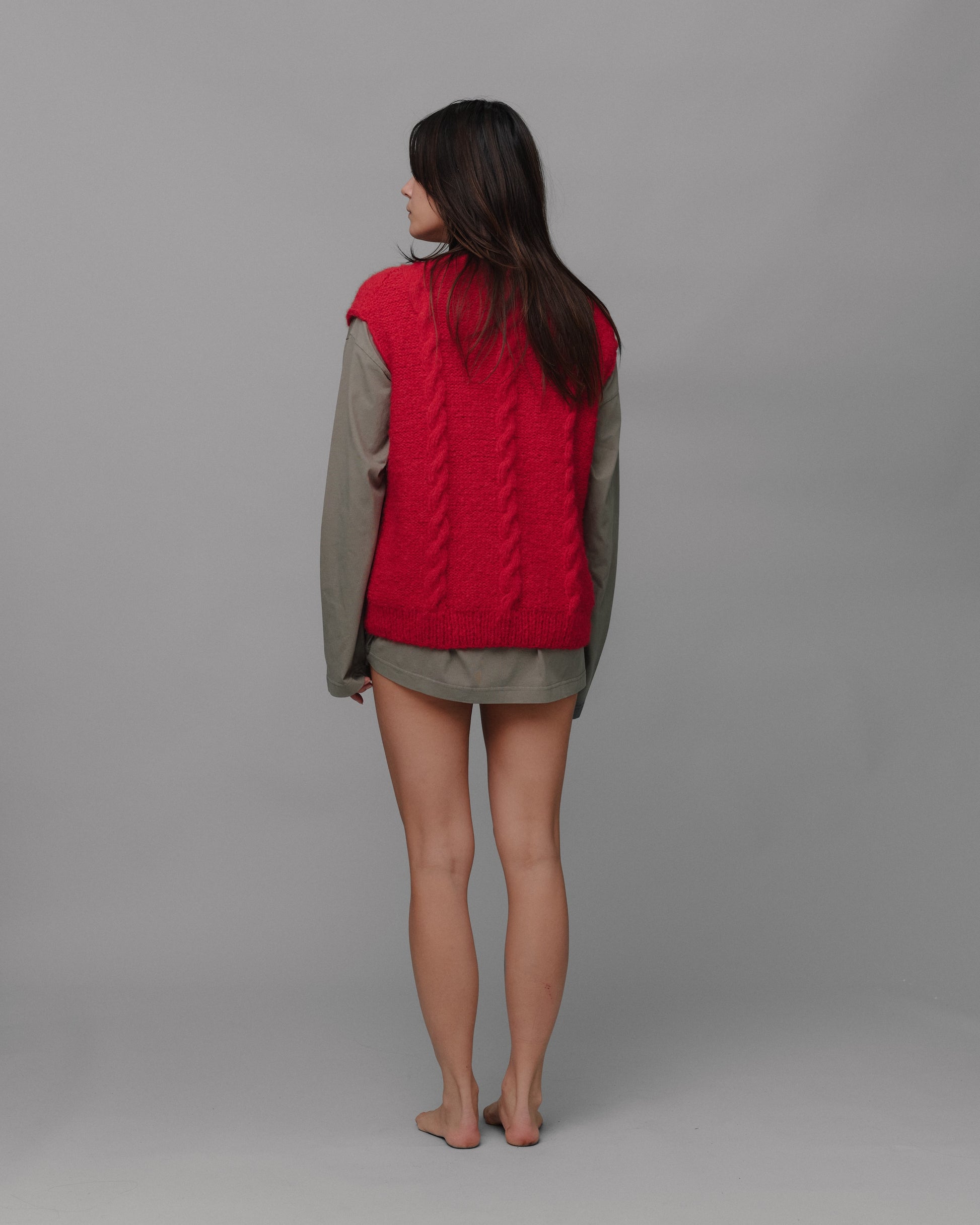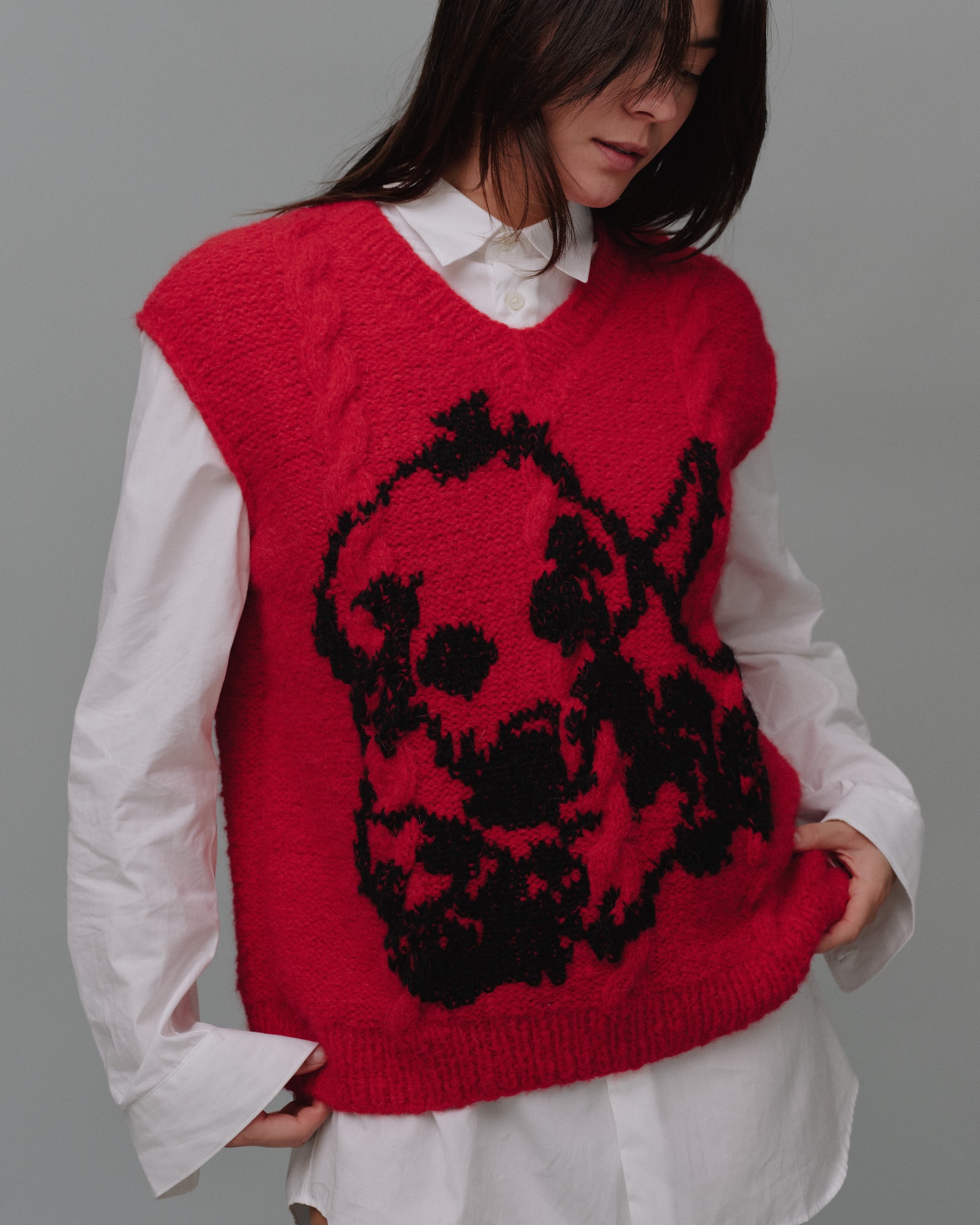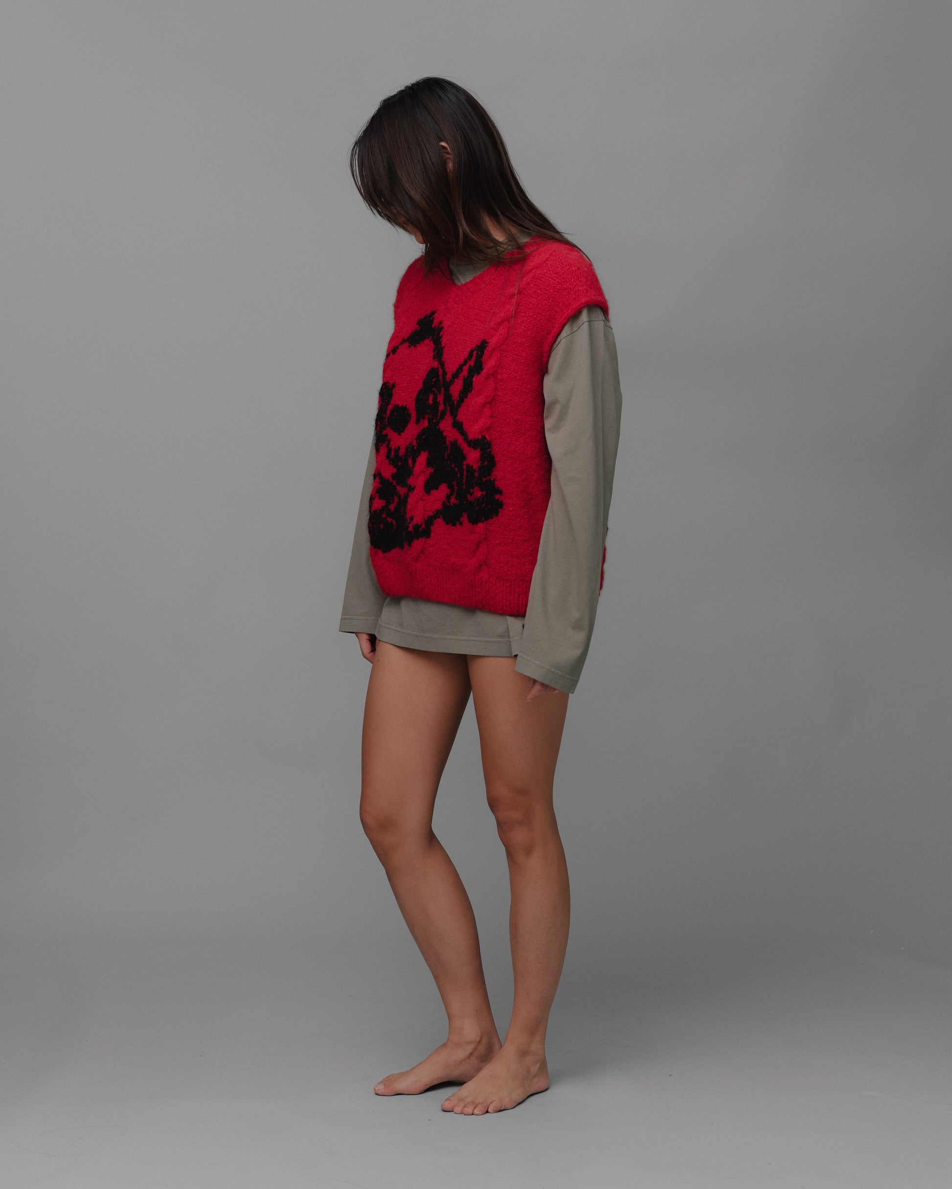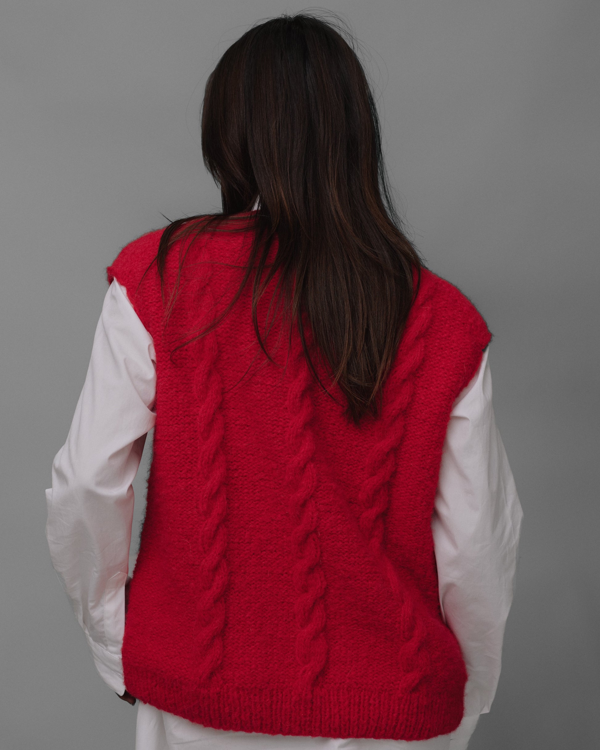 Unisex red vest based on the pattern paintings of Rop van Mierlo. Each garment from this collection is hand knitted in Bosnia, using traditional techniques by a team of 30 craftswomen.