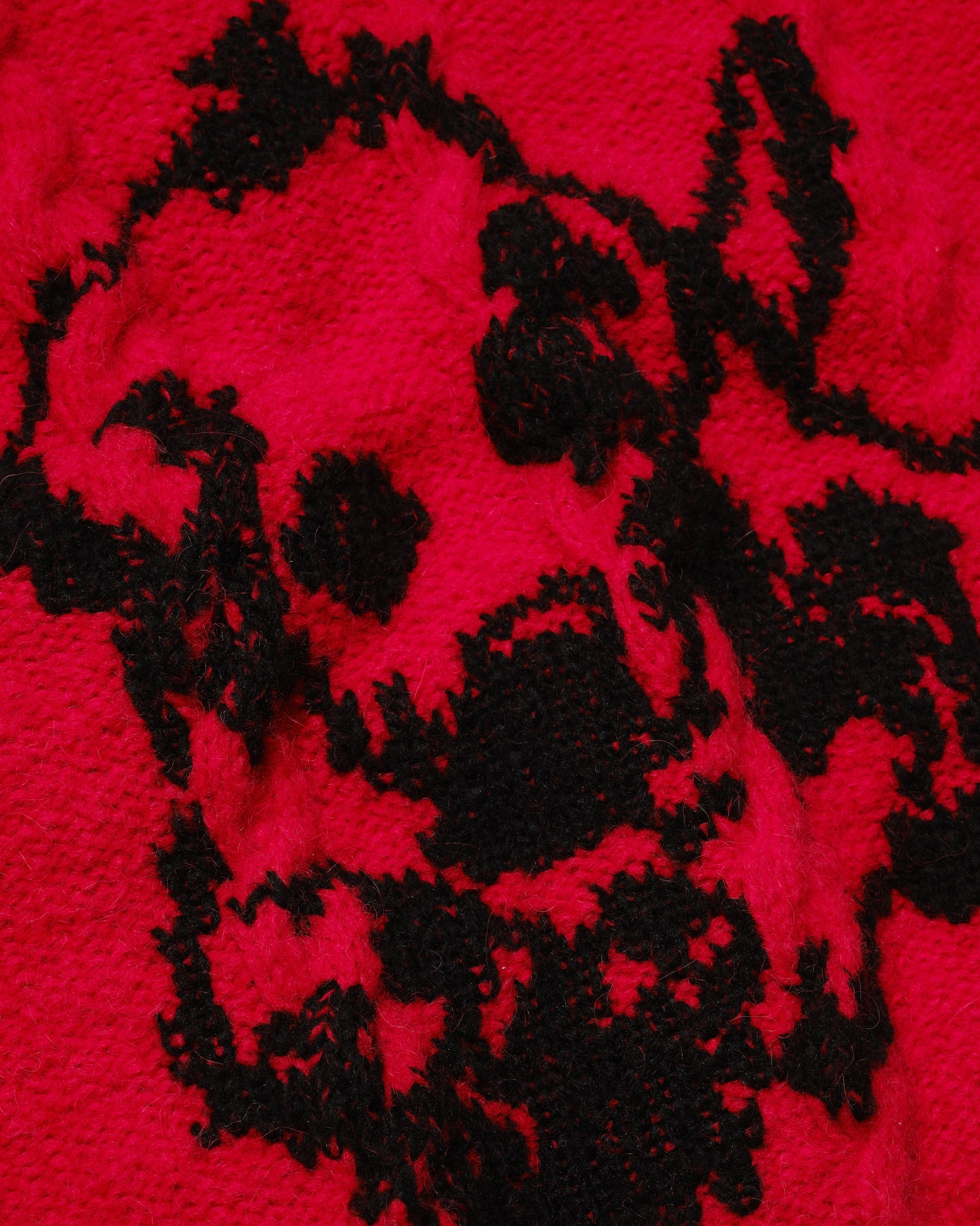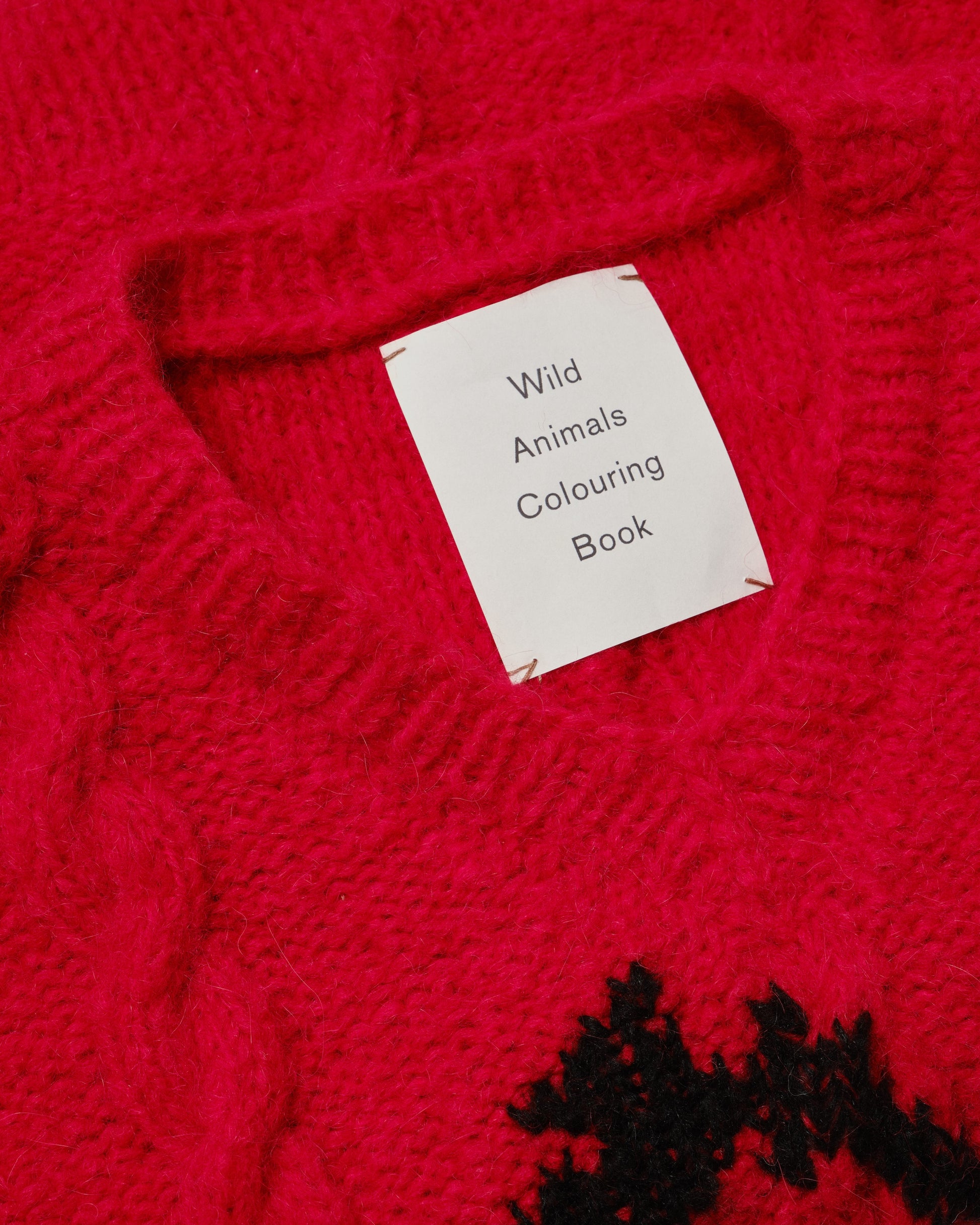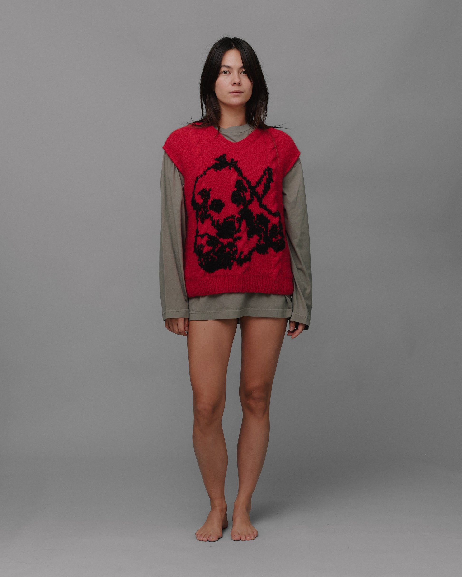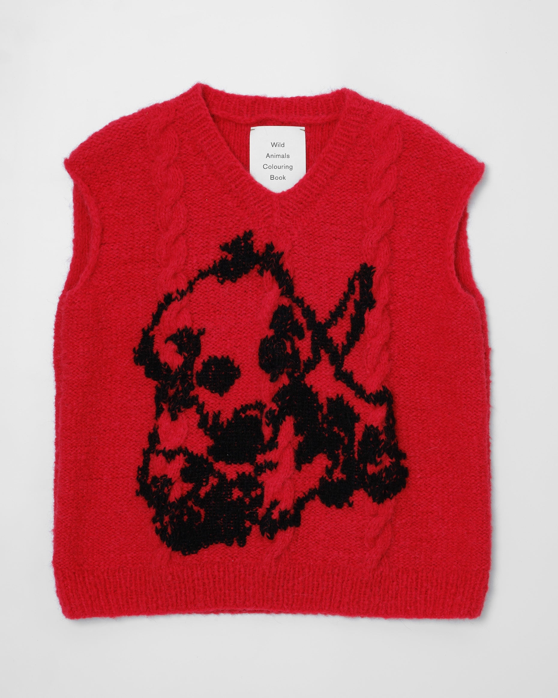 Unisex red vest based on the pattern paintings of Rop van Mierlo. Each garment from this collection is hand knitted in Bosnia, using traditional techniques by a team of 30 craftswomen.