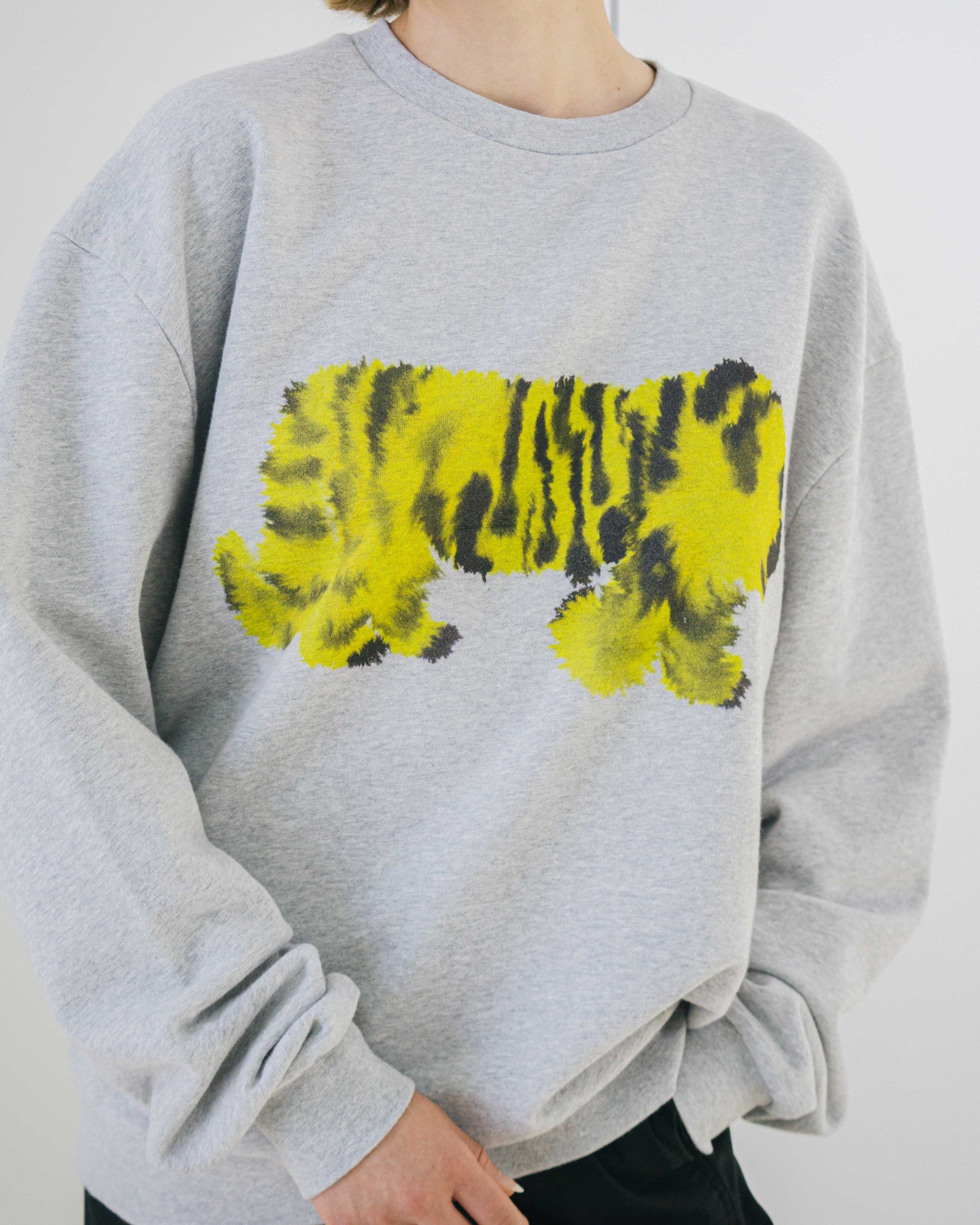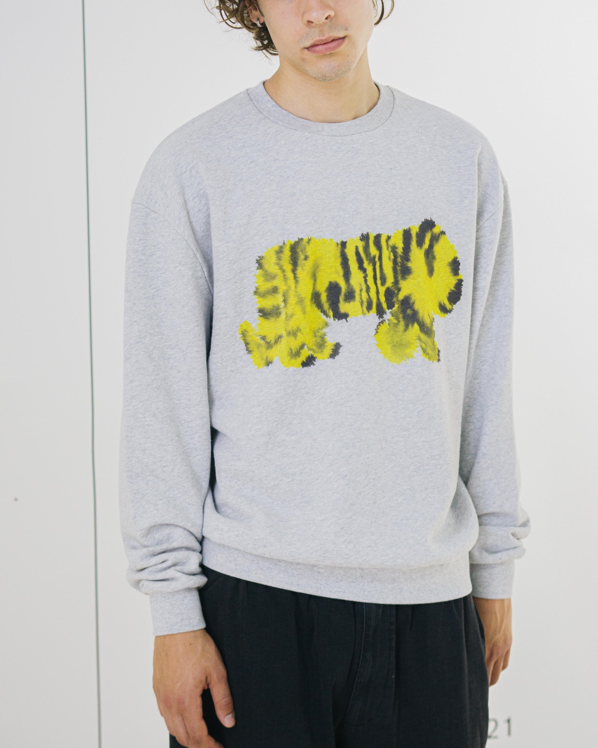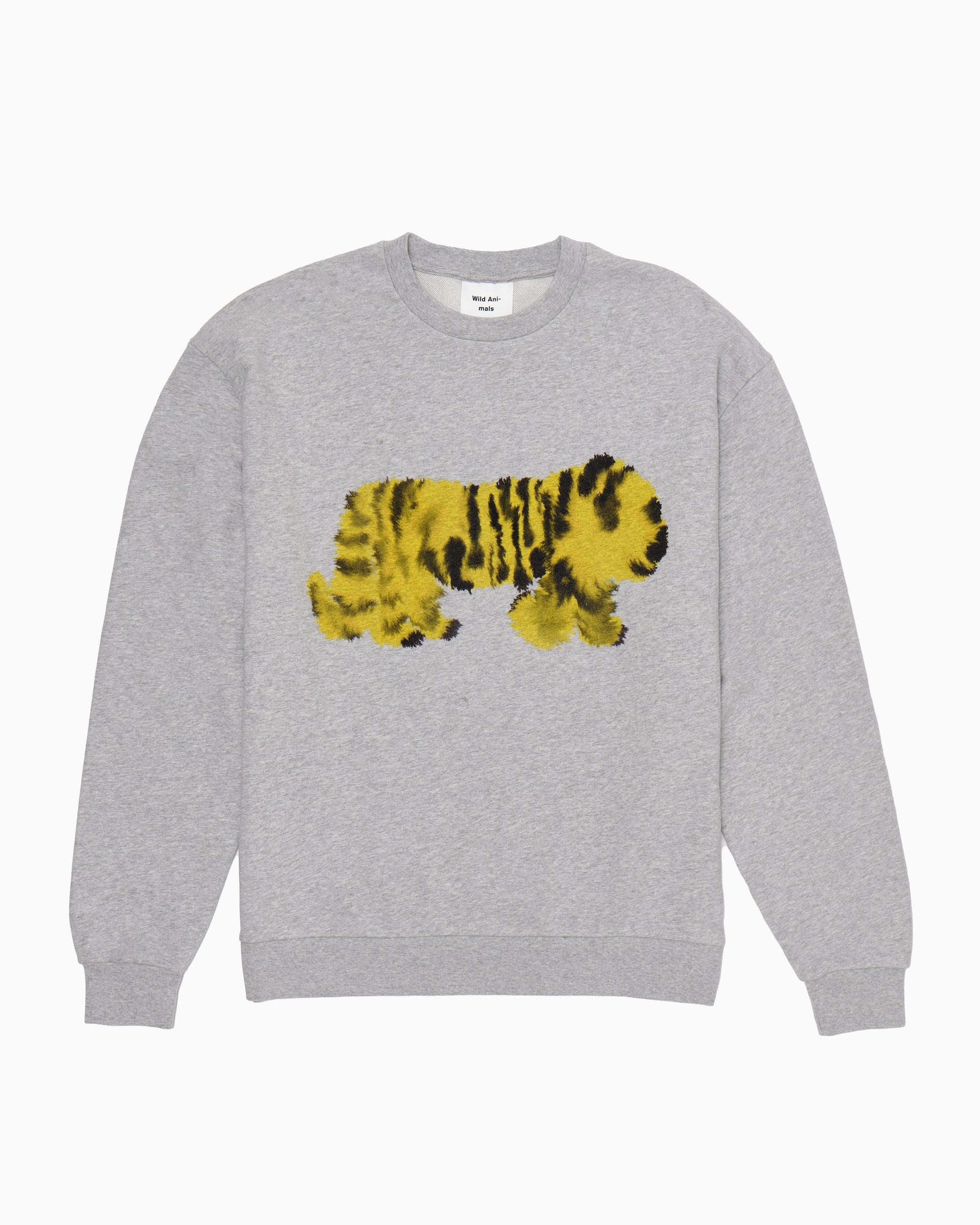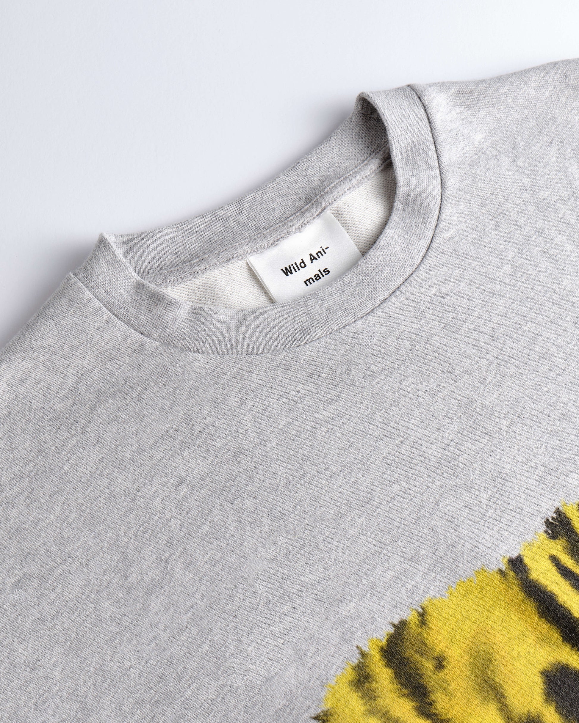 A heather grey unisex sweatshirt featuring a print of a Tiger on the front. The fabric used to make this sweatshirt is certified by GOTS. Tome is 1.89 cm and wears a size medium. Joy is 1.76 cm and wears a size medium.