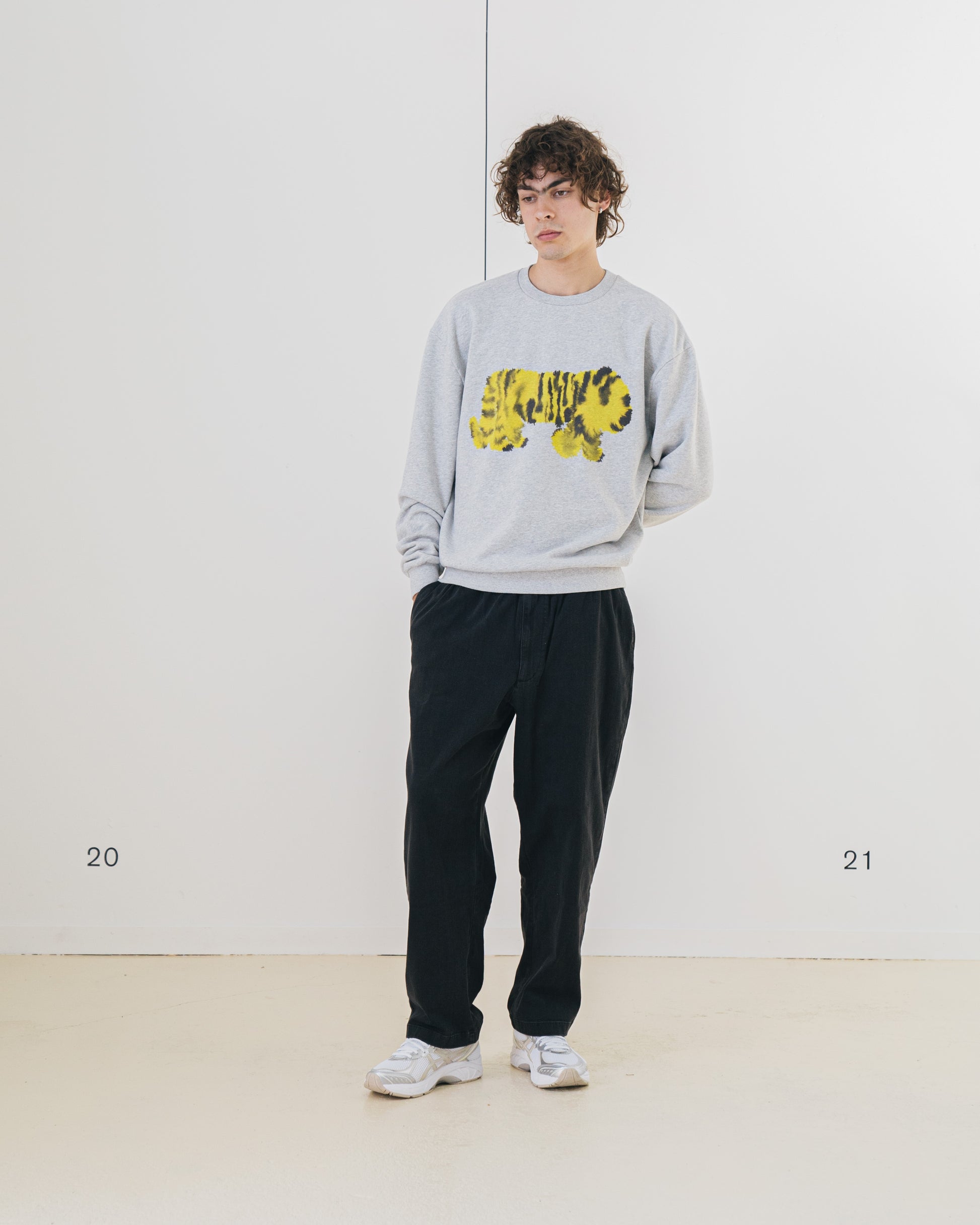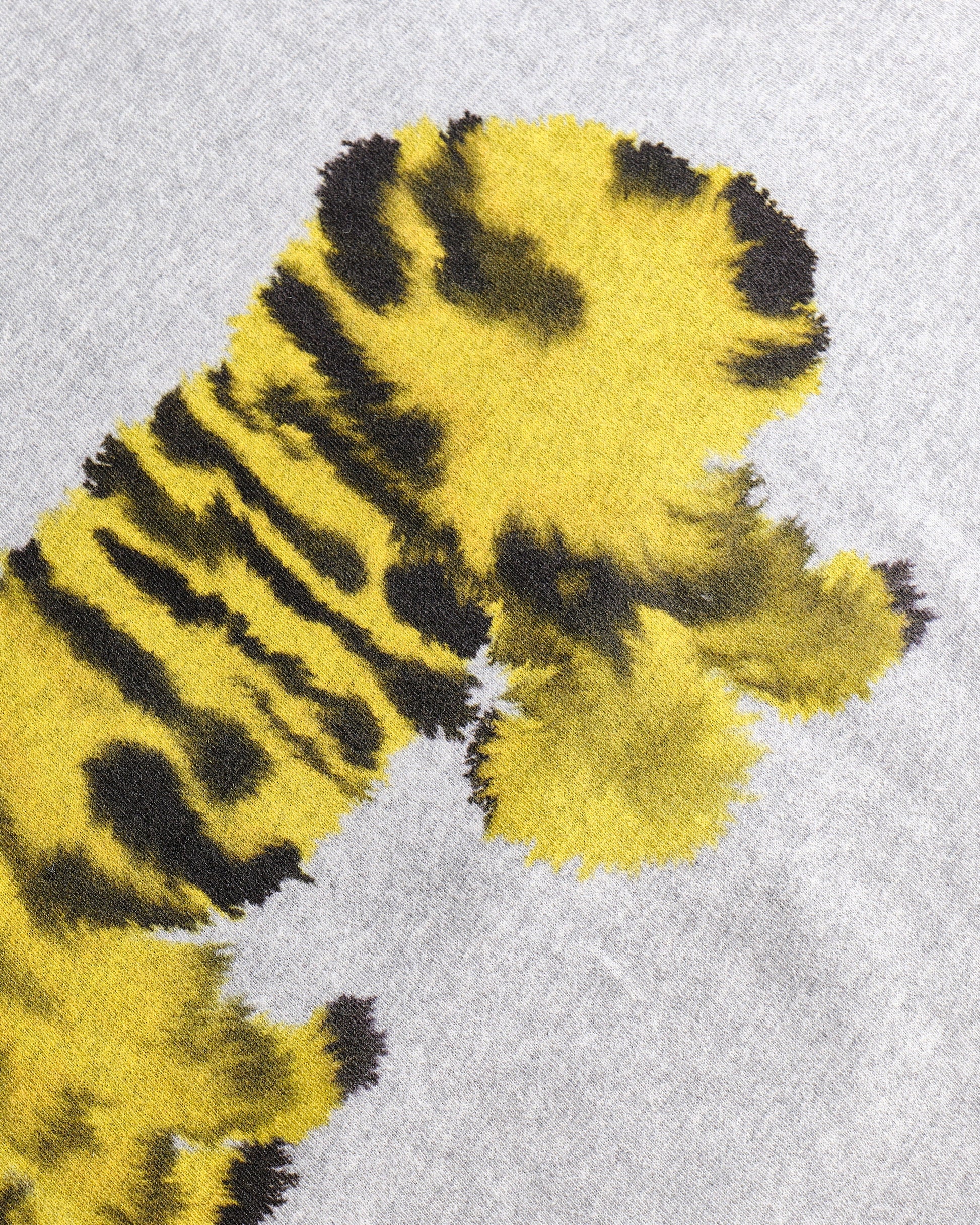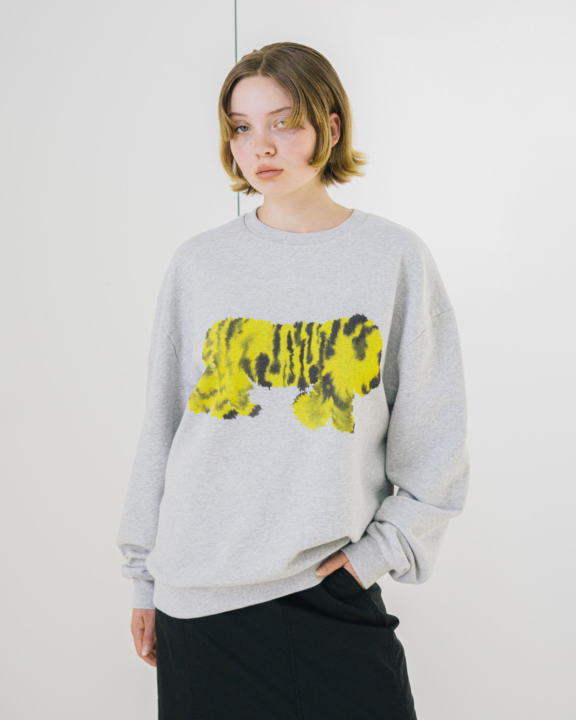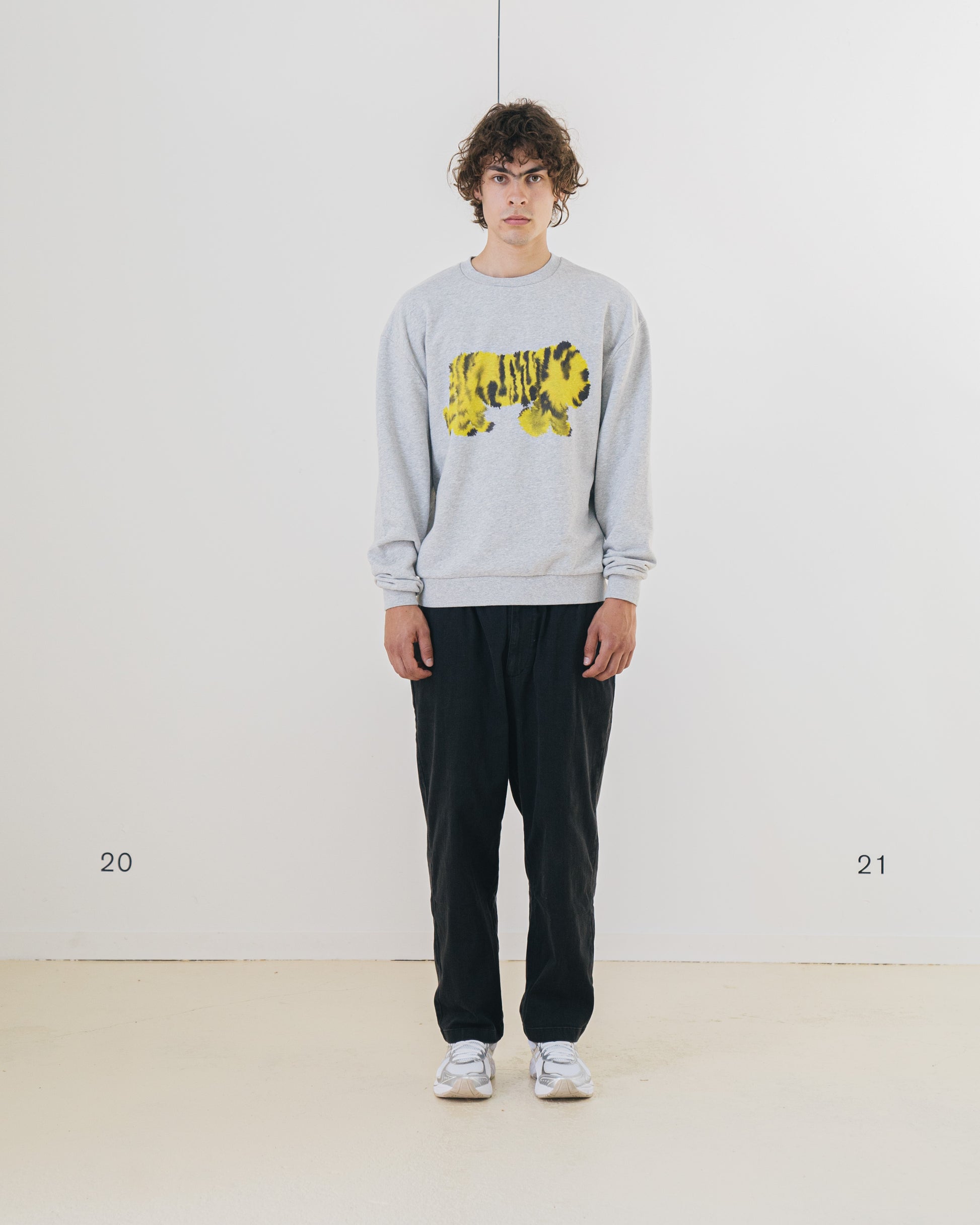A heather grey unisex sweatshirt featuring a print of a Tiger on the front. The fabric used to make this sweatshirt is certified by GOTS. Tome is 1.89 cm and wears a size medium. Joy is 1.76 cm and wears a size medium.