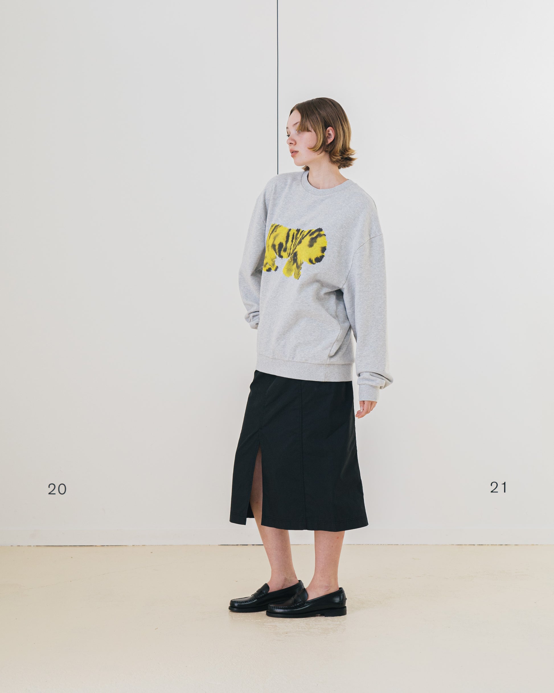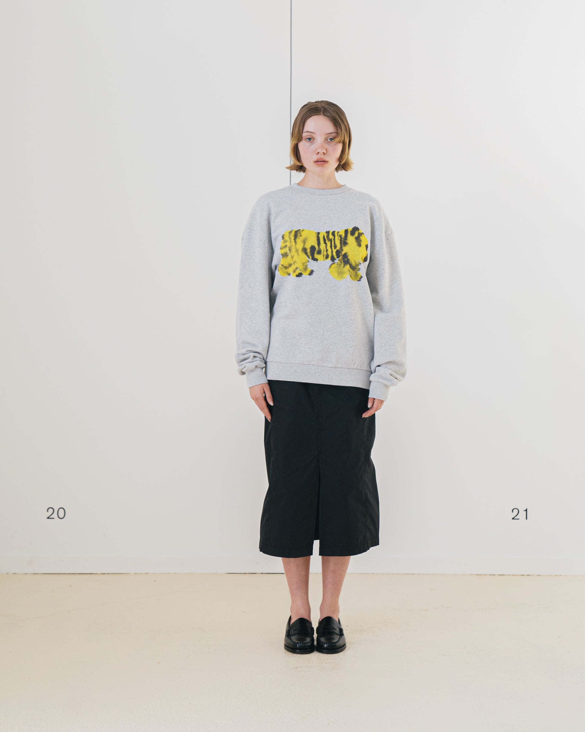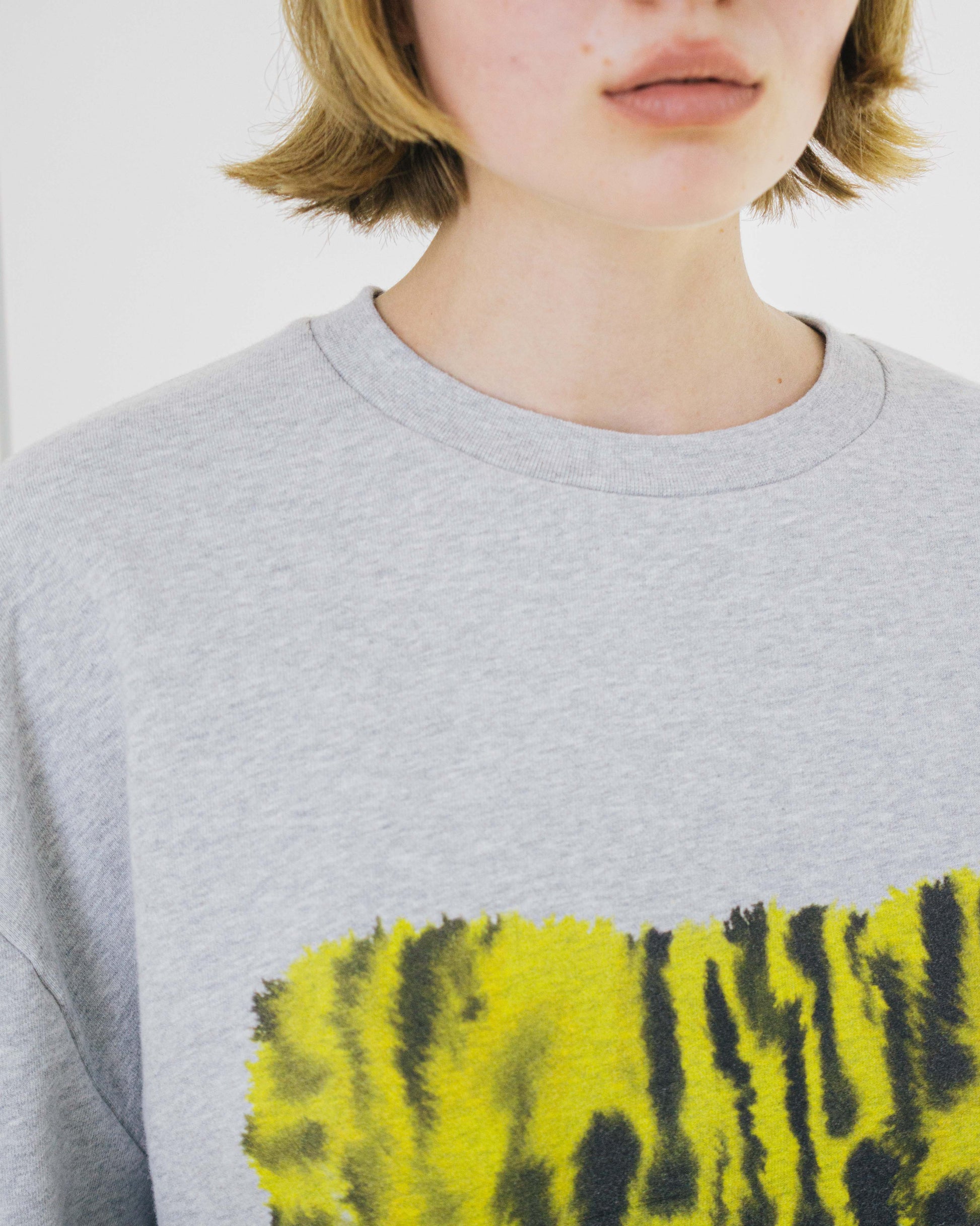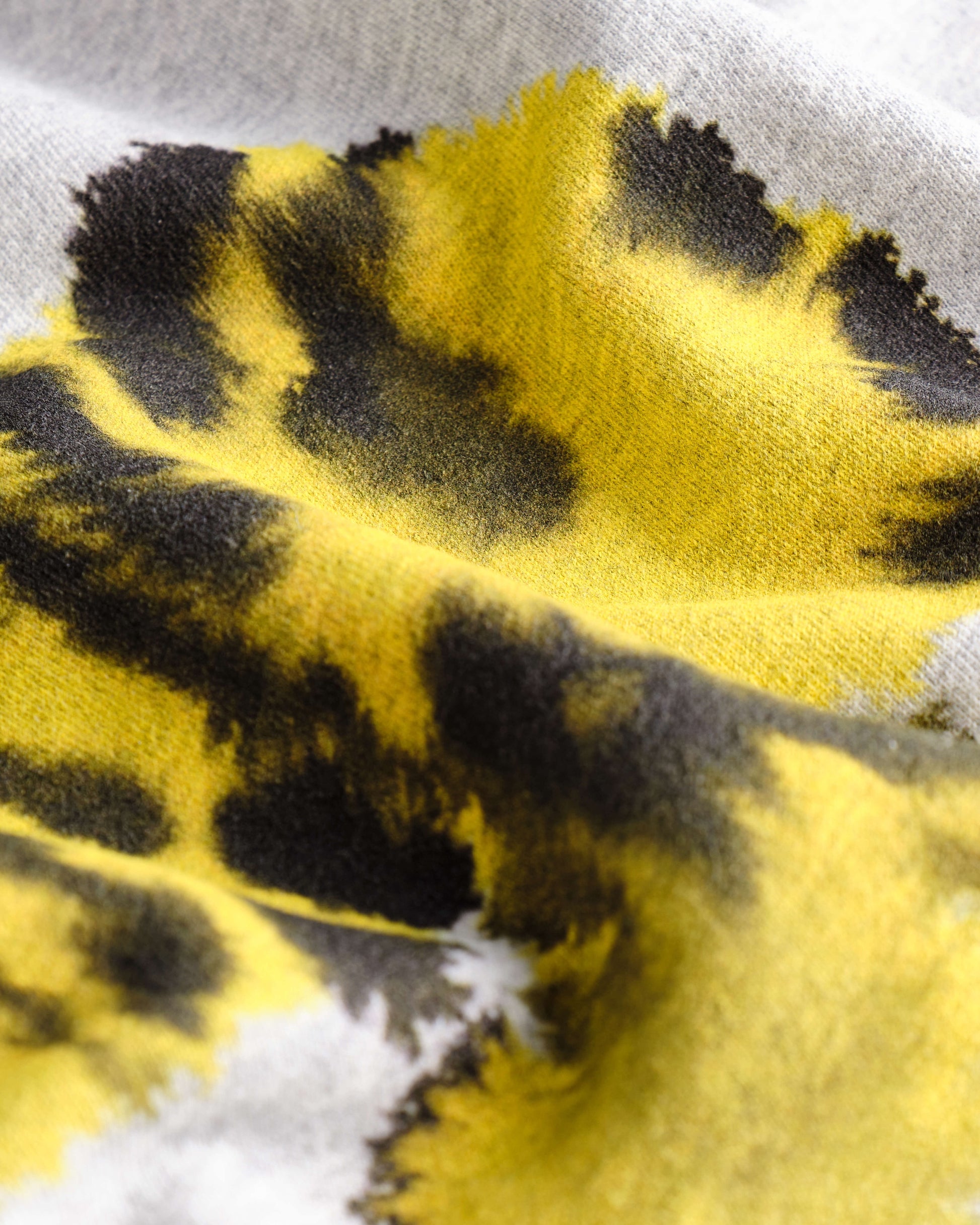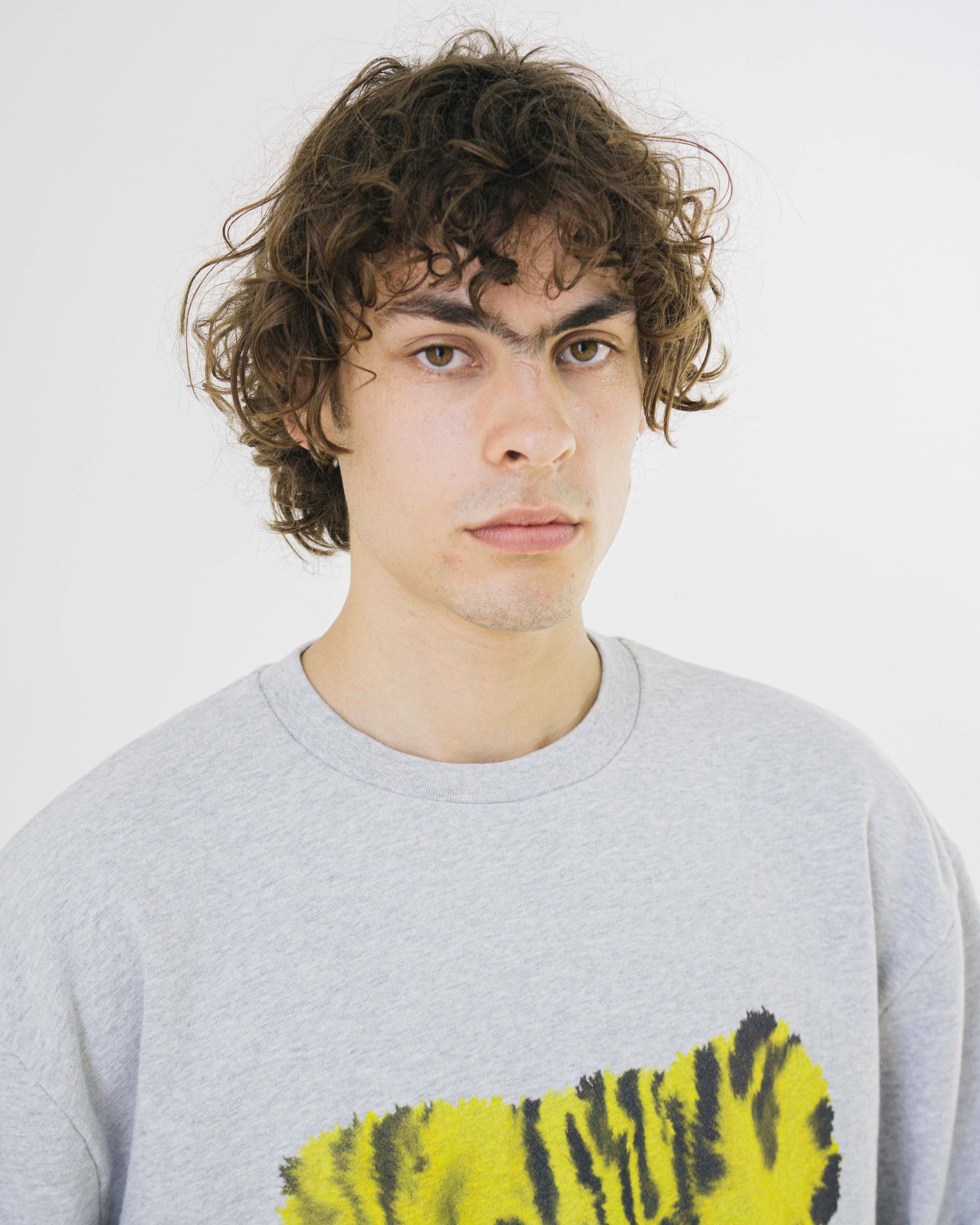 A heather grey unisex sweatshirt featuring a print of a Tiger on the front. The fabric used to make this sweatshirt is certified by GOTS. Tome is 1.89 cm and wears a size medium. Joy is 1.76 cm and wears a size medium.