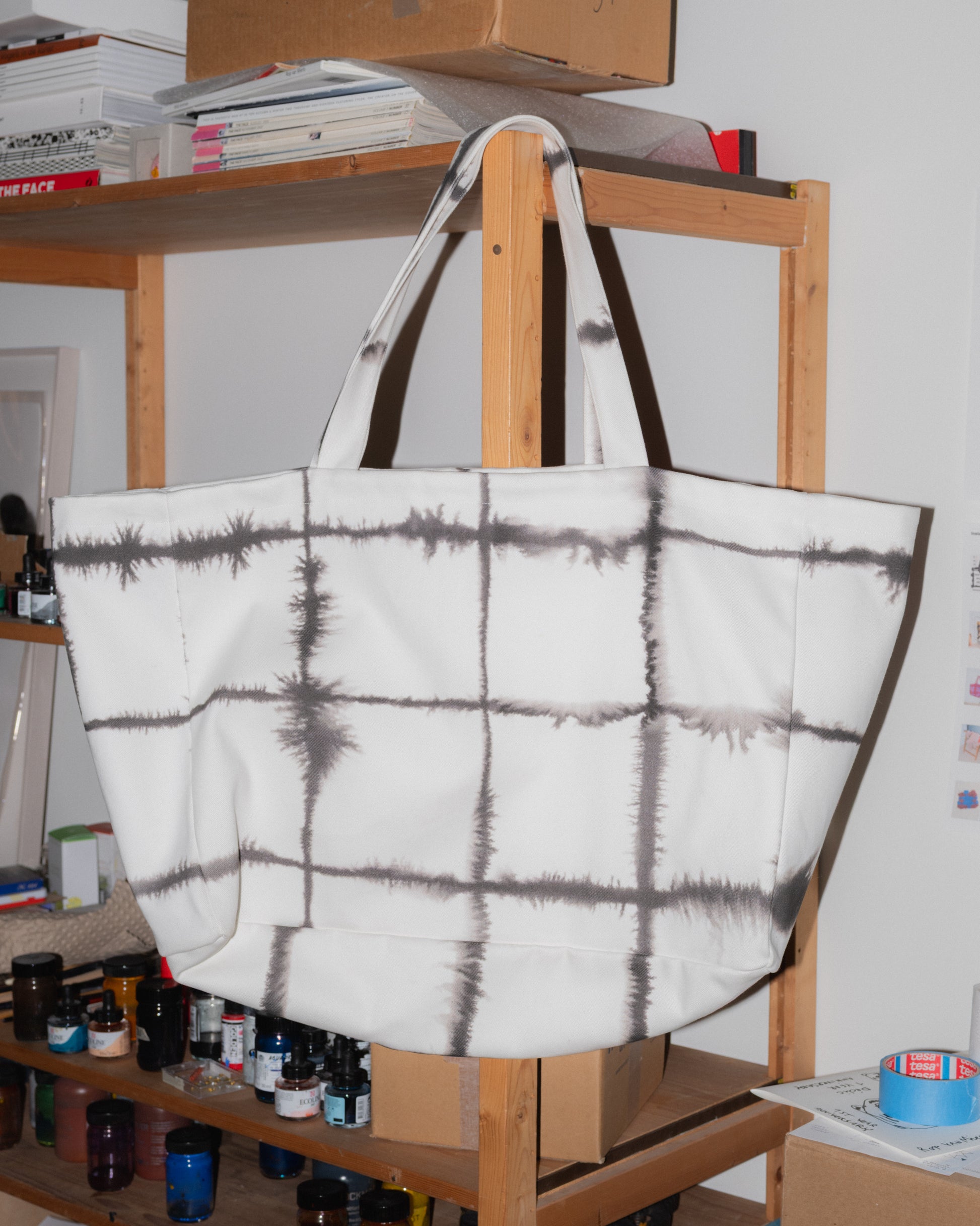 Oversized landscape bag featuring an all-over Windowpane print designed by Rop van Mierlo. Printed on the inside and outside on heavy cotton. The interior features an inner bag finished with a metal zipper.