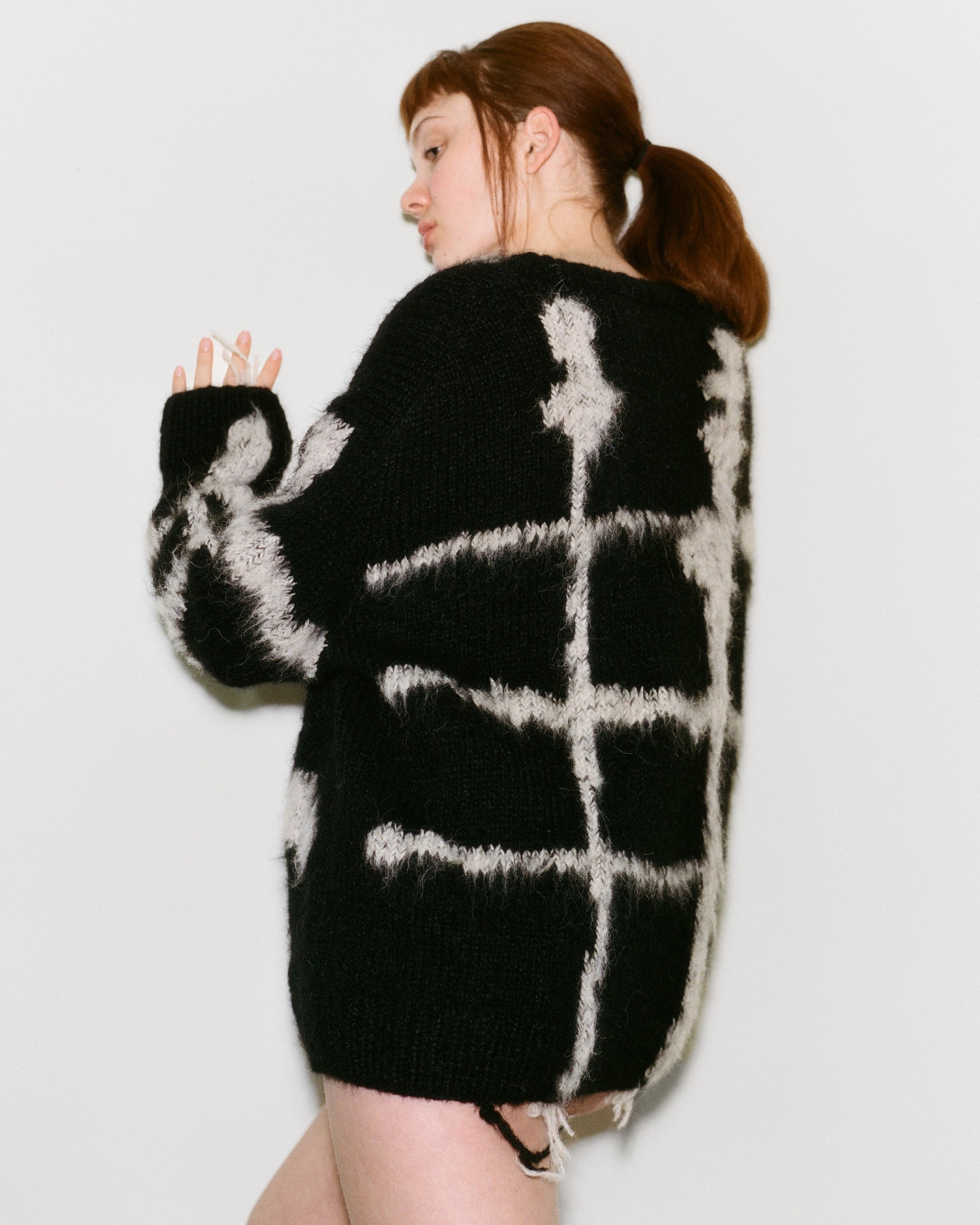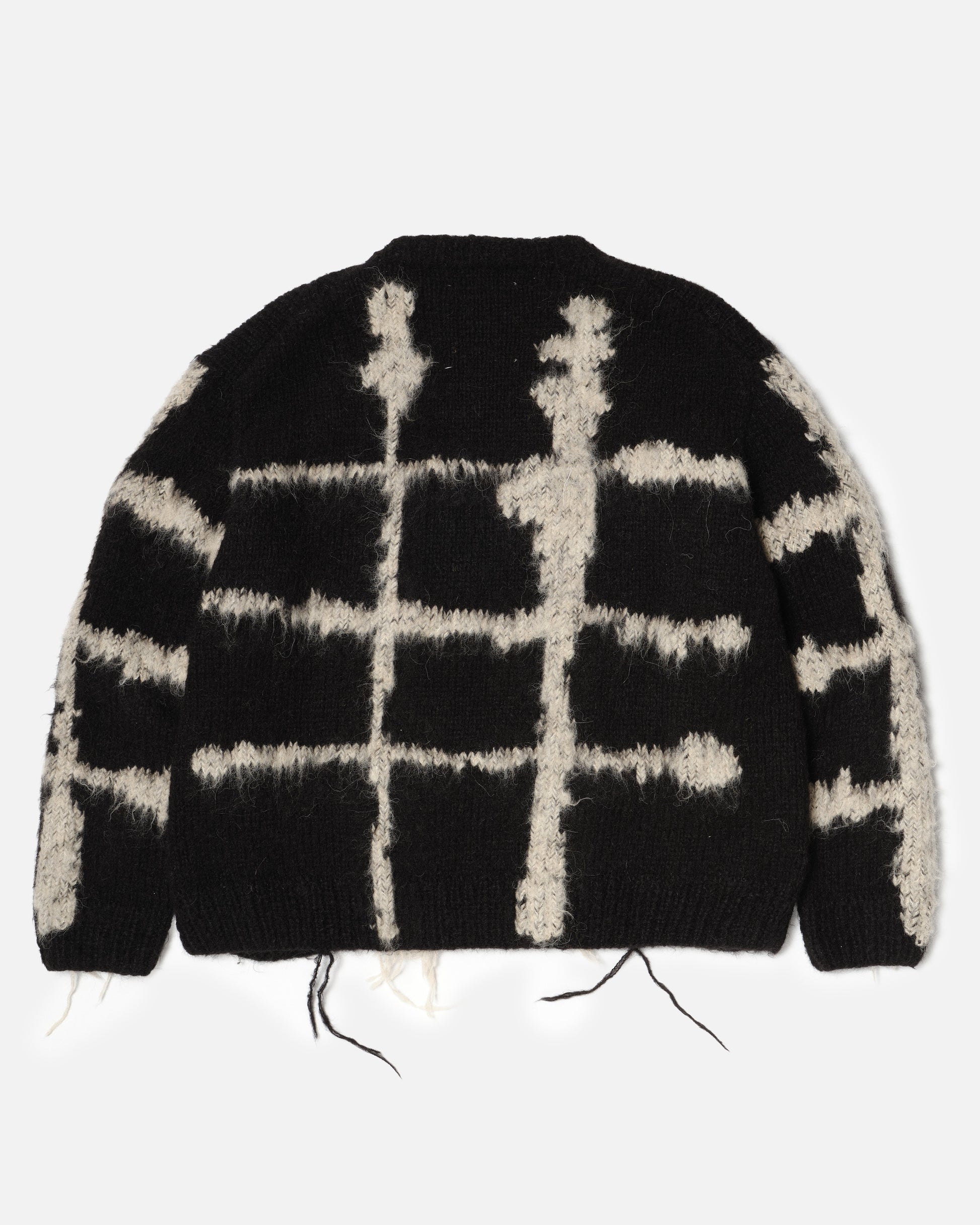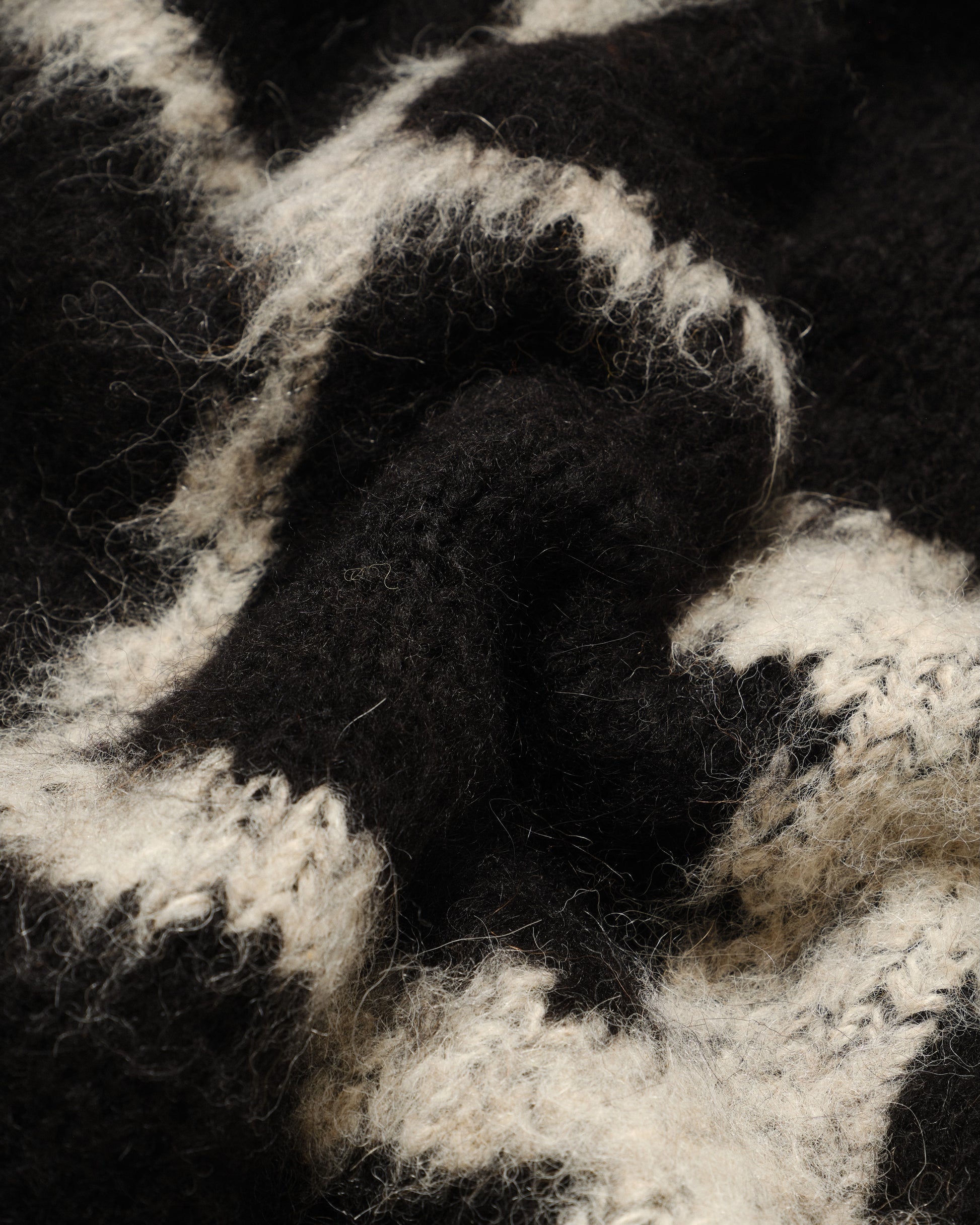 Unisex black sweater based on the pattern paintings of Rop van Mierlo. Each garment from this collection is hand knitted in Bosnia, using traditional techniques by a team of 30 craftswomen.
