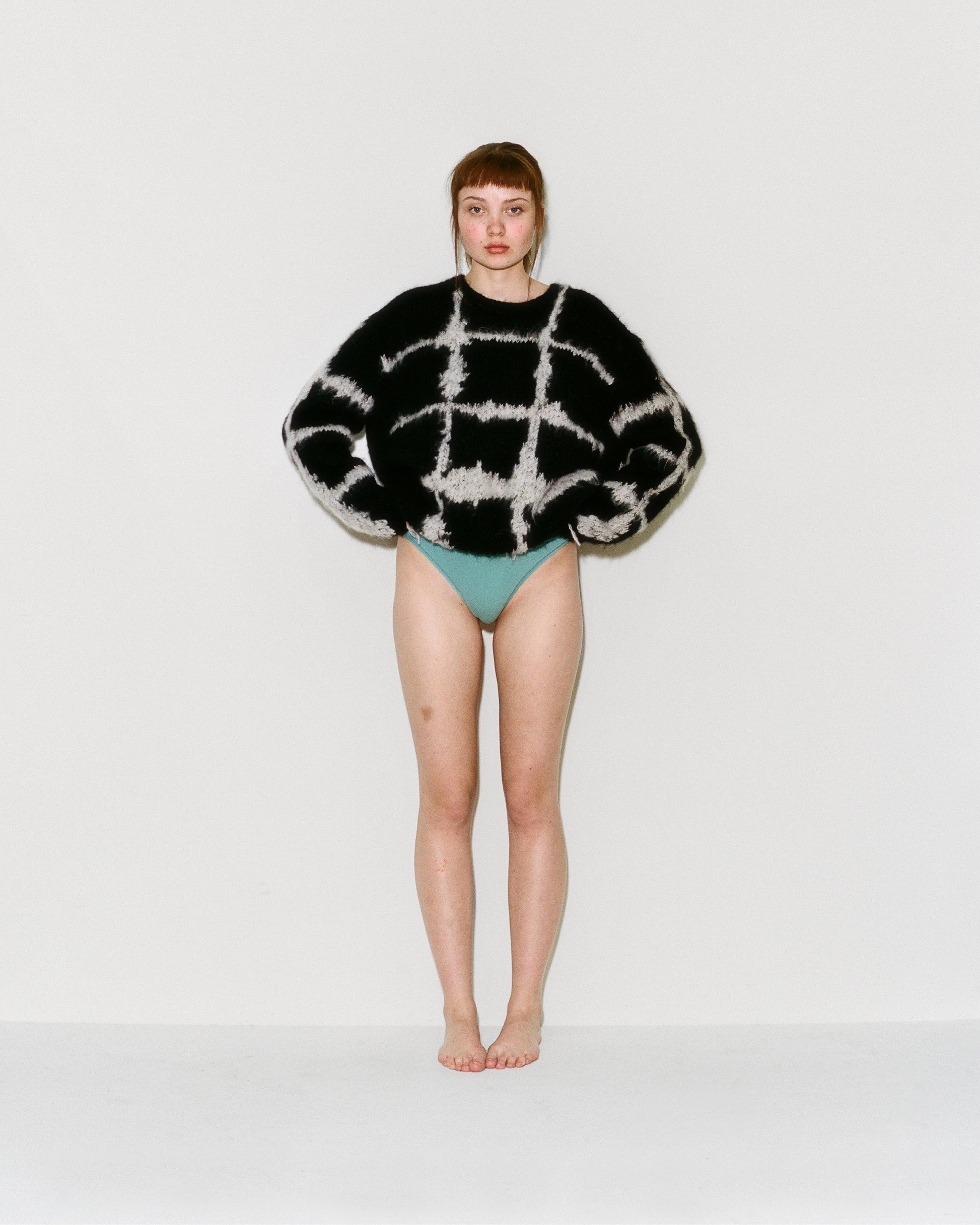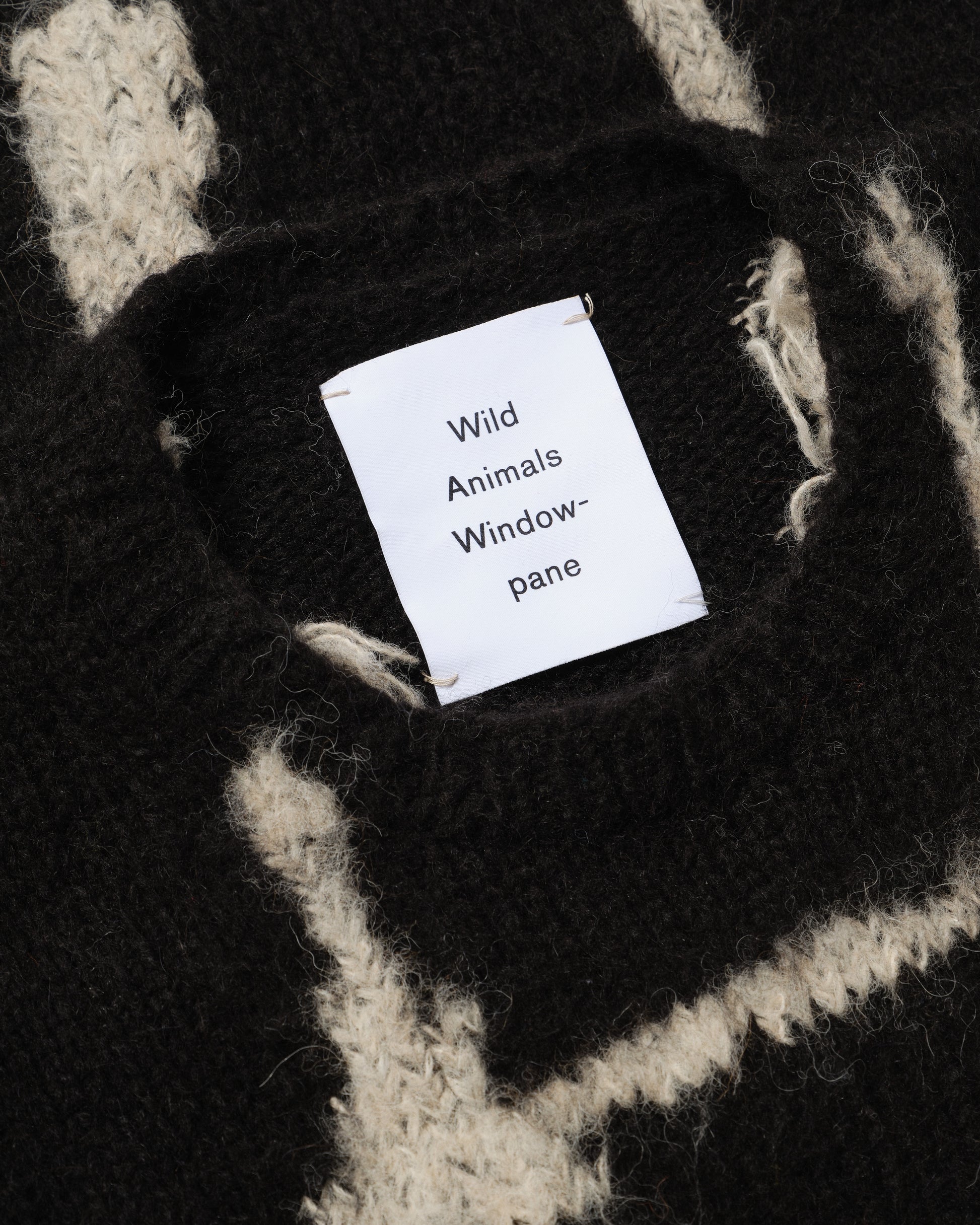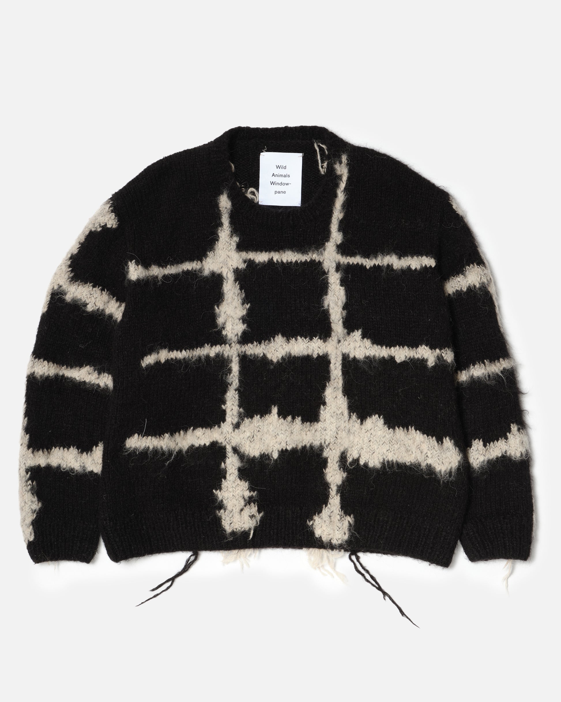 Unisex black sweater based on the pattern paintings of Rop van Mierlo. Each garment from this collection is hand knitted in Bosnia, using traditional techniques by a team of 30 craftswomen.