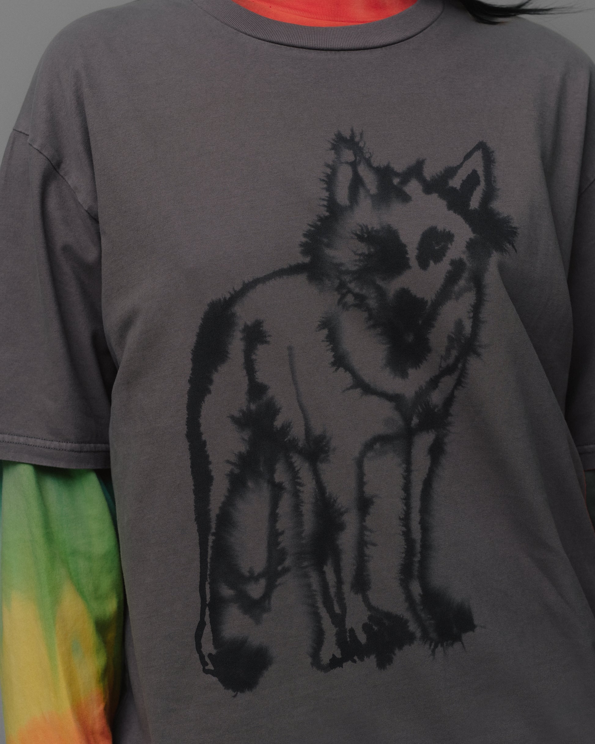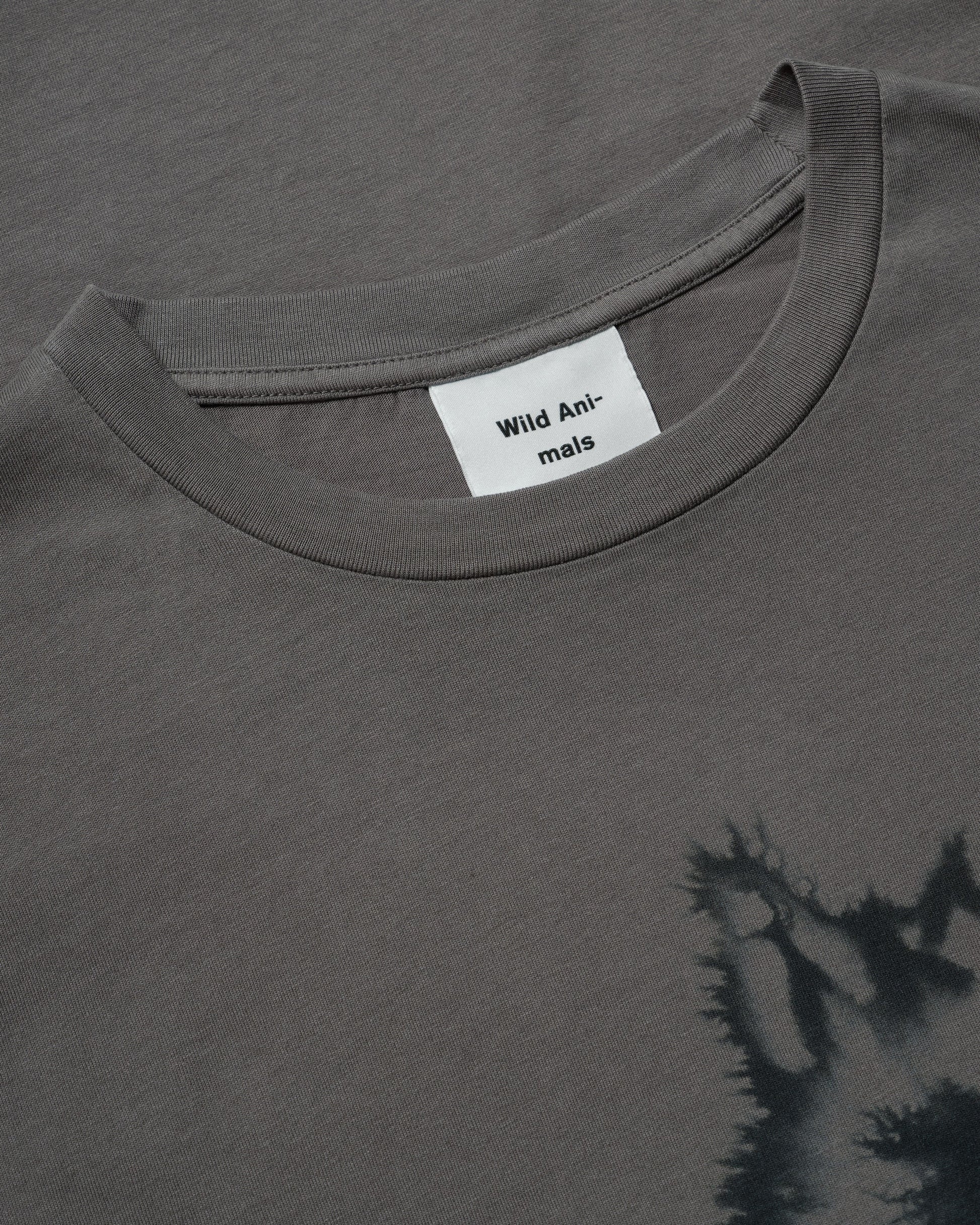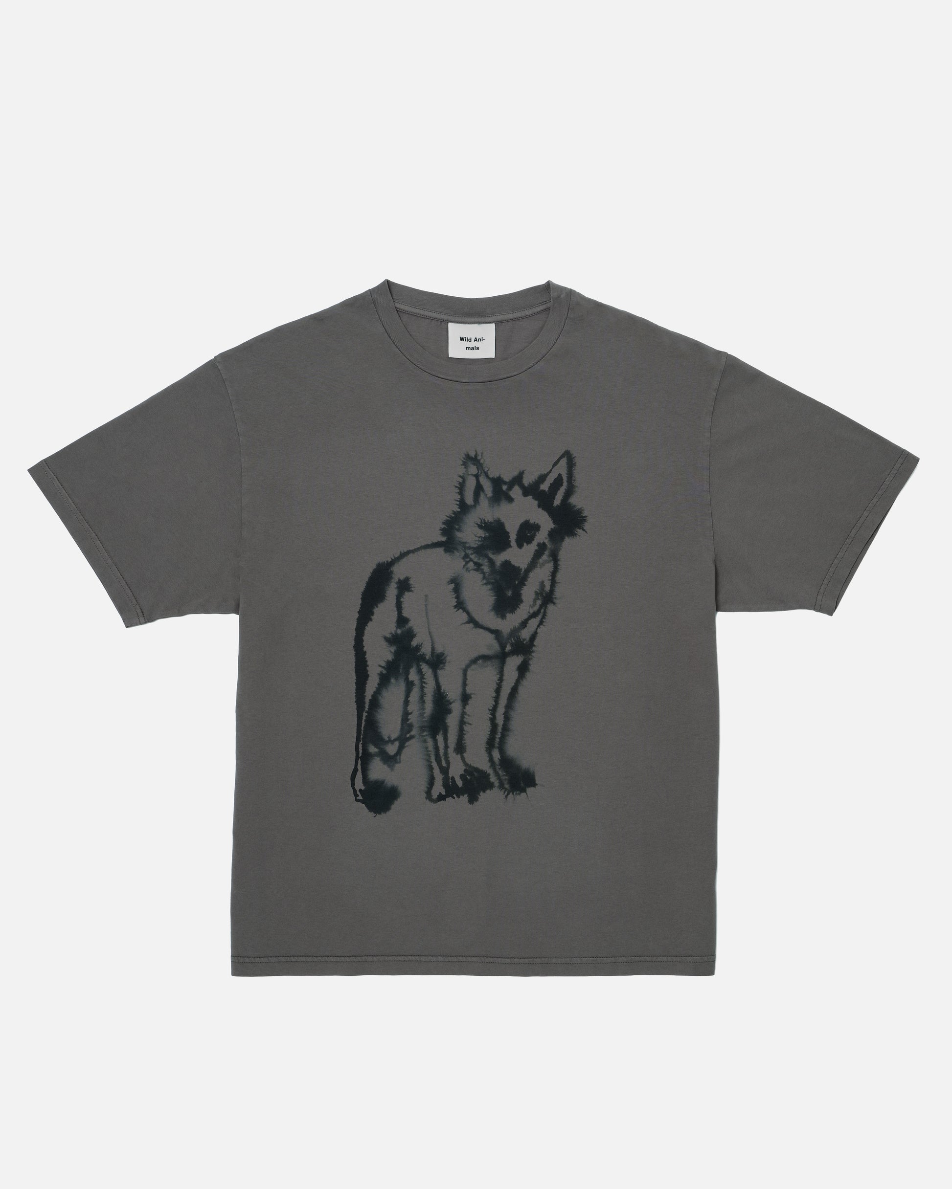 A grey garment-dye unisex t-shirt featuring a Wolf on the front. The fabric used to make this t-shirt is certified by GOTS.